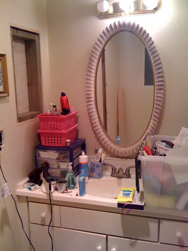 I only have a small piece of the before, and it’s actually during the demolition phase. My medicine cabinet has been ripped out (on the left) and the big bin of “stuff” on the right was formerly located under the sink. Yes, I had a lot of crap. Give me a break. I’m a girl.