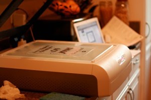 Yudu is a home screen printing machine made by Provocraft. It burns the image into the screen and provides a frame for the actual printing process.