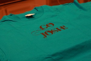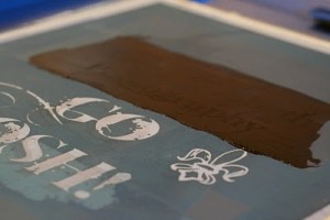 Flooding the design with ink (not the “Go Josh” design, you can’t see it right now). I’ve dragged ink across the empty space in the screen to print the image on the fabric.