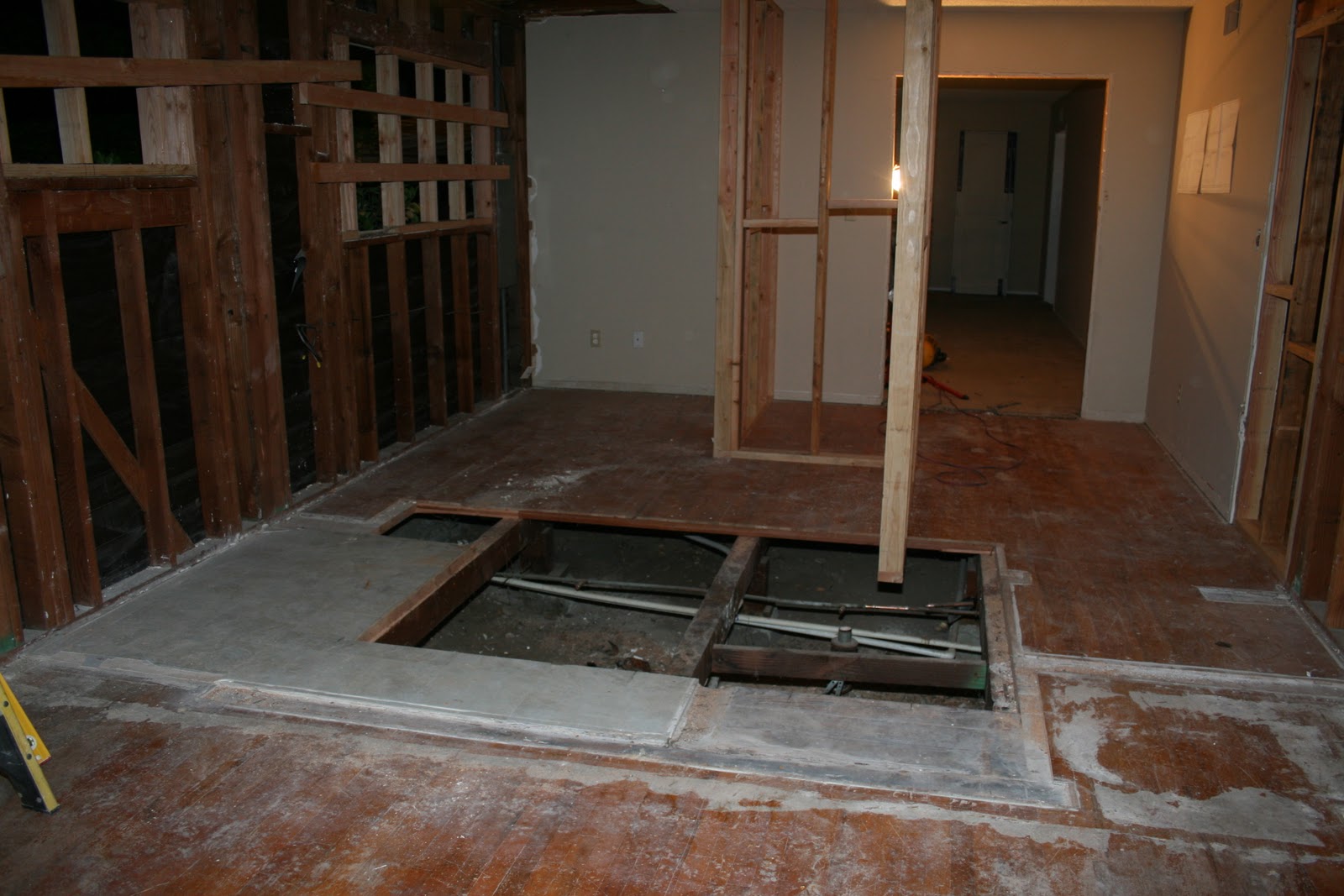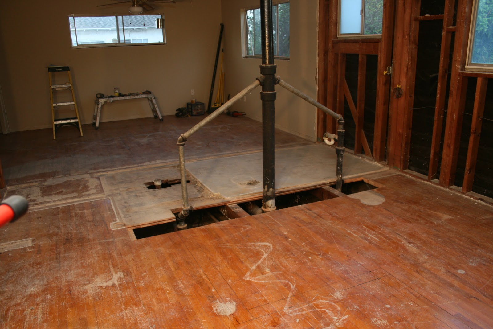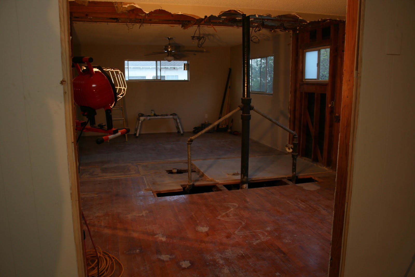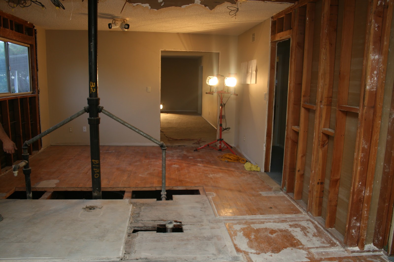 I took this standing in what was once our master bedroom, the pipes were the in the wall between the master bath and bedroom #4 (which is being combined into the master suite) and the doorway straight ahead leads into the living room.