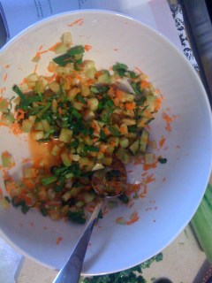 The veggie mixture inside the wraps consisted of cucumber, scallions, cilantro, shaved carrots, and rice vinegar. Then I cooked up some chicken for the inside, tossed in peanut dressing, and assembled.