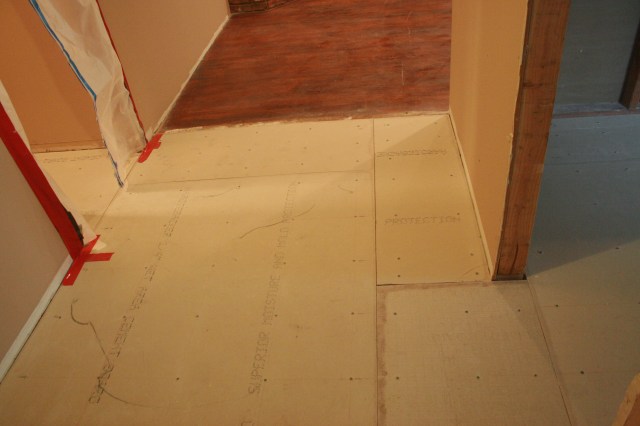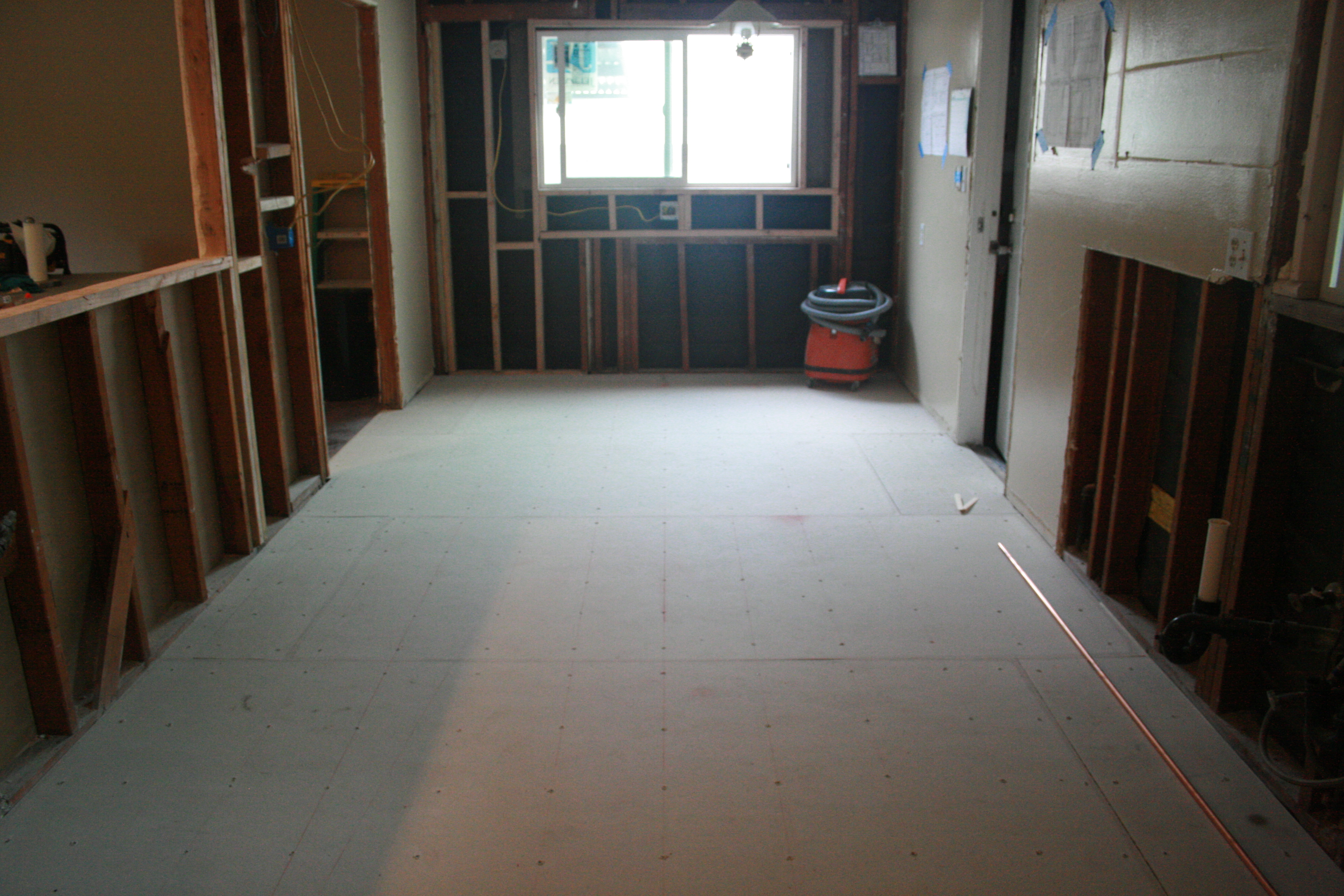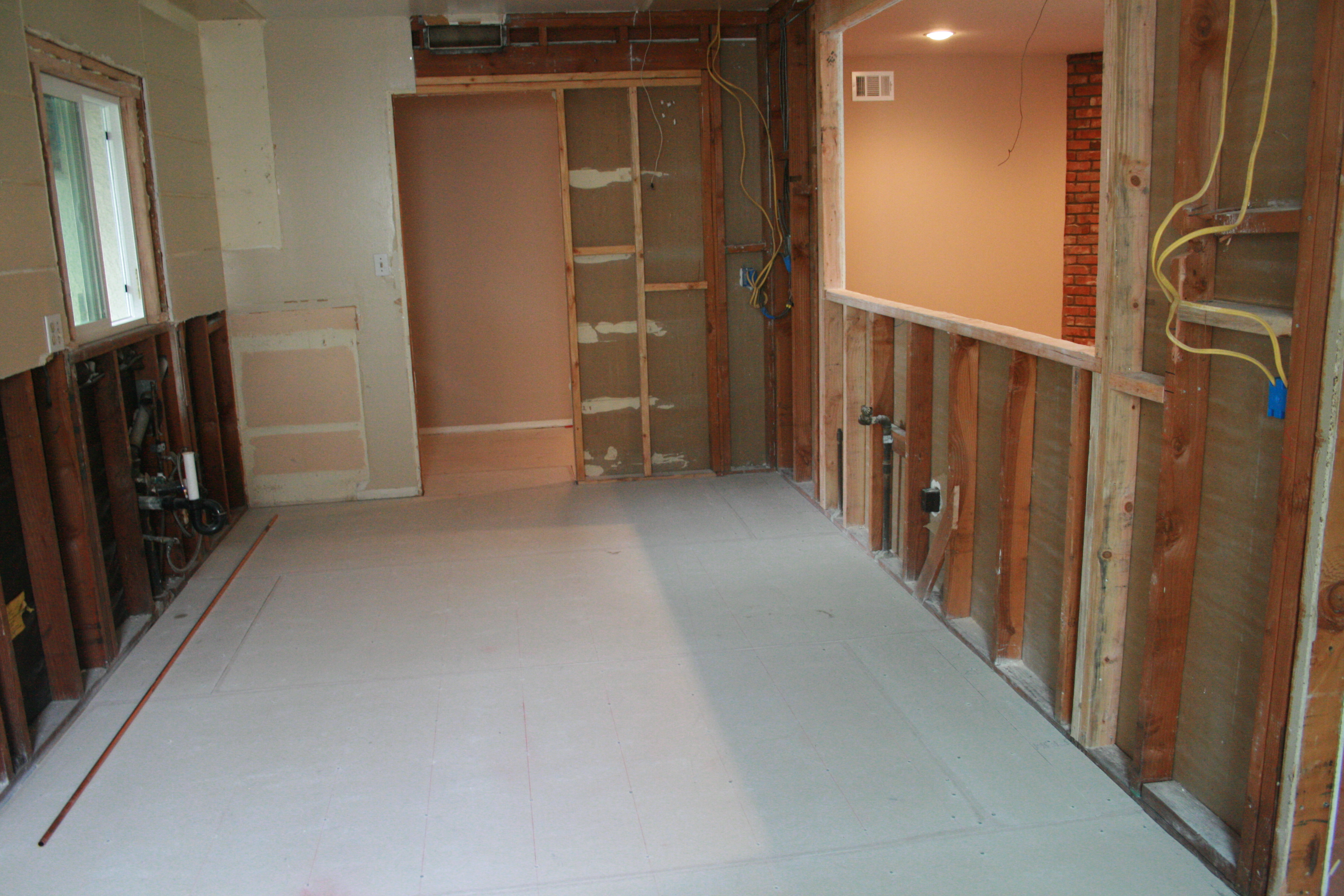 I was relieved that the kitchen seemed so much cleaner when I got home on Tuesday night. The broken pieces of wood and scary things I won’t mention that fell from the attic were swept away, and the floor was covered in shiny new cement board.