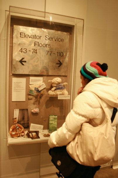 Yes, I am the bag lady in this picture. This display case held things that were found in the rubble, some of it surprisingly intact. One item was an ATM receipt, time-stamped moments before the first plane hit. Its owner did not survive.
