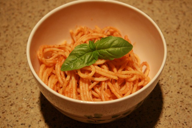 Start with our friend, the roux. Add 1/4 cup 1% milk, and 1/8 cup parmesan cheese. Whisk until blended. (This is basically alfredo sauce!) Combine this with store-bought marinara sauce. I also boiled some fresh English peas I found at Trader Joe’s and added them to the sauce.