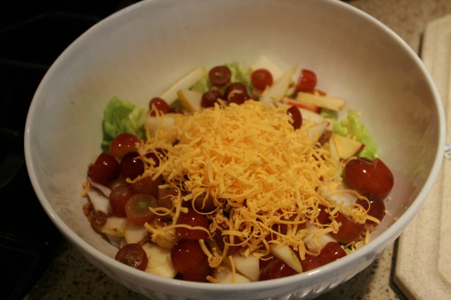 Braeburn apples, Bartlett pears, red grapes, sharp cheddar, and a dressing of reduced apple juice, apple cider vinegar, olive oil and pepper.