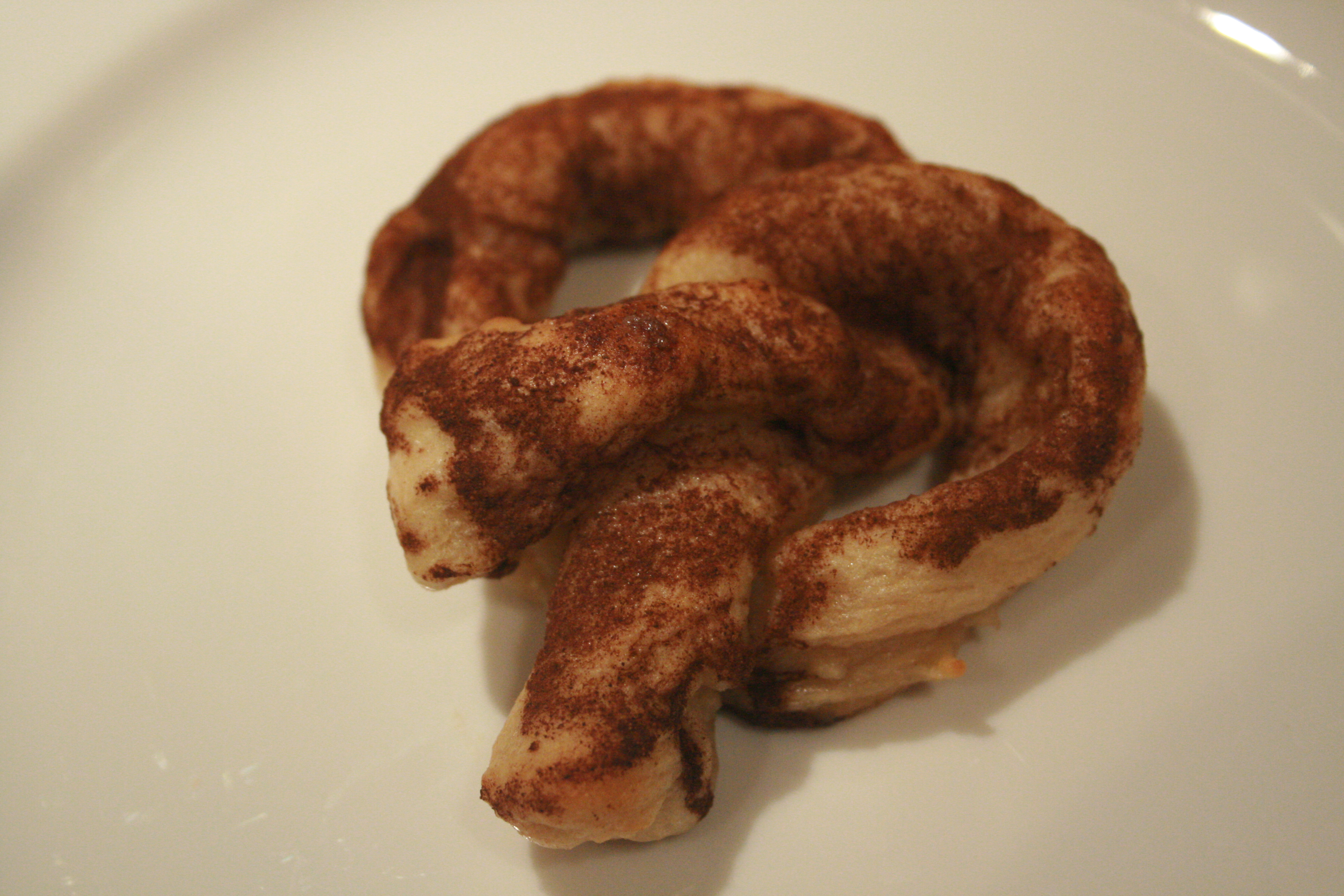 For dessert, we had cinnamon sugar pretzels from Sandra Lee Semi-Homemade Cooking Made Light. They are a lighter take on a Cinnabon-style pretzel, using Brigford frozen bread dough, which is formed, boiled, then brushed with honey and baked. Once browned they are brushed with a cinnamon-powdered sugar glaze.
