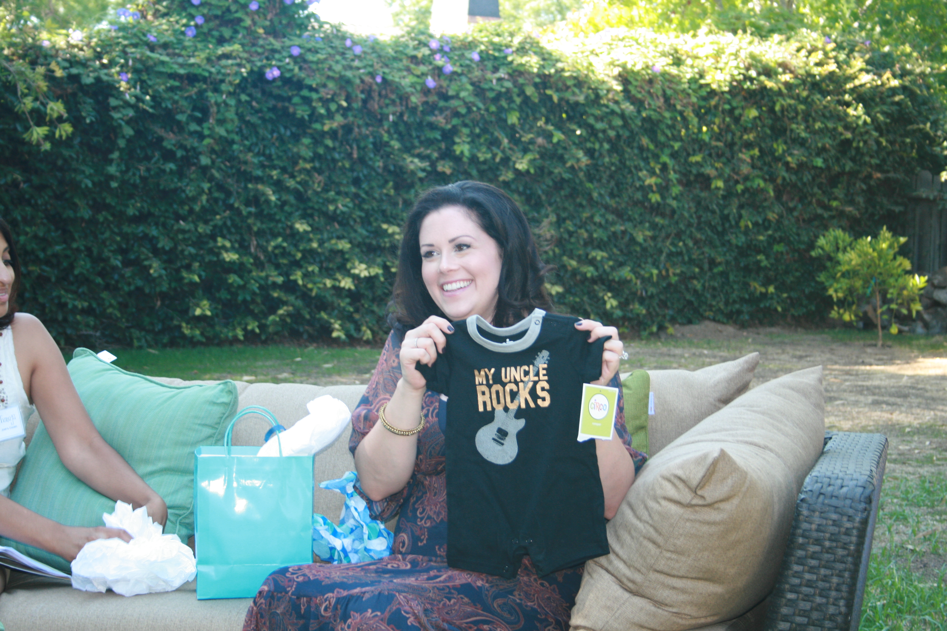 The "Mommy's Rockstar" bag contained all guitar-themed little clothes and rocker jeans! SO CUTE! From my mom's cousin Sandy and her daughter, Jen. Also, Nancy and my Aunt Kelly watch the gifts, and Nora looks on.