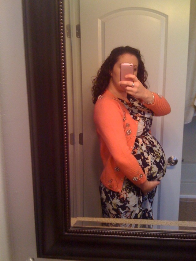 Josh and I attended our first birth class last week and one of the things we did in the class was find out how much the baby and his “accoutrements” (a.k.a. amniotic fluid, placenta, umbilical cord) weigh at 3, 6, and 8 months. The 8 month “belly” weighed a TON!!! It was incredible. It makes a lot of sense now why my back hurts so much. We’ve been trying to get totally ready just in case Jacob decides to come early. We are pretty much there! The nursery has been done, now the diaper bag is packed, the car seat is installed (!) and I’m close to being packed for the hospital. Fab! Next I have to finish my Christmas shopping (getting close) and then I think I’ll try to make some freeze-able meals for after the baby is born.