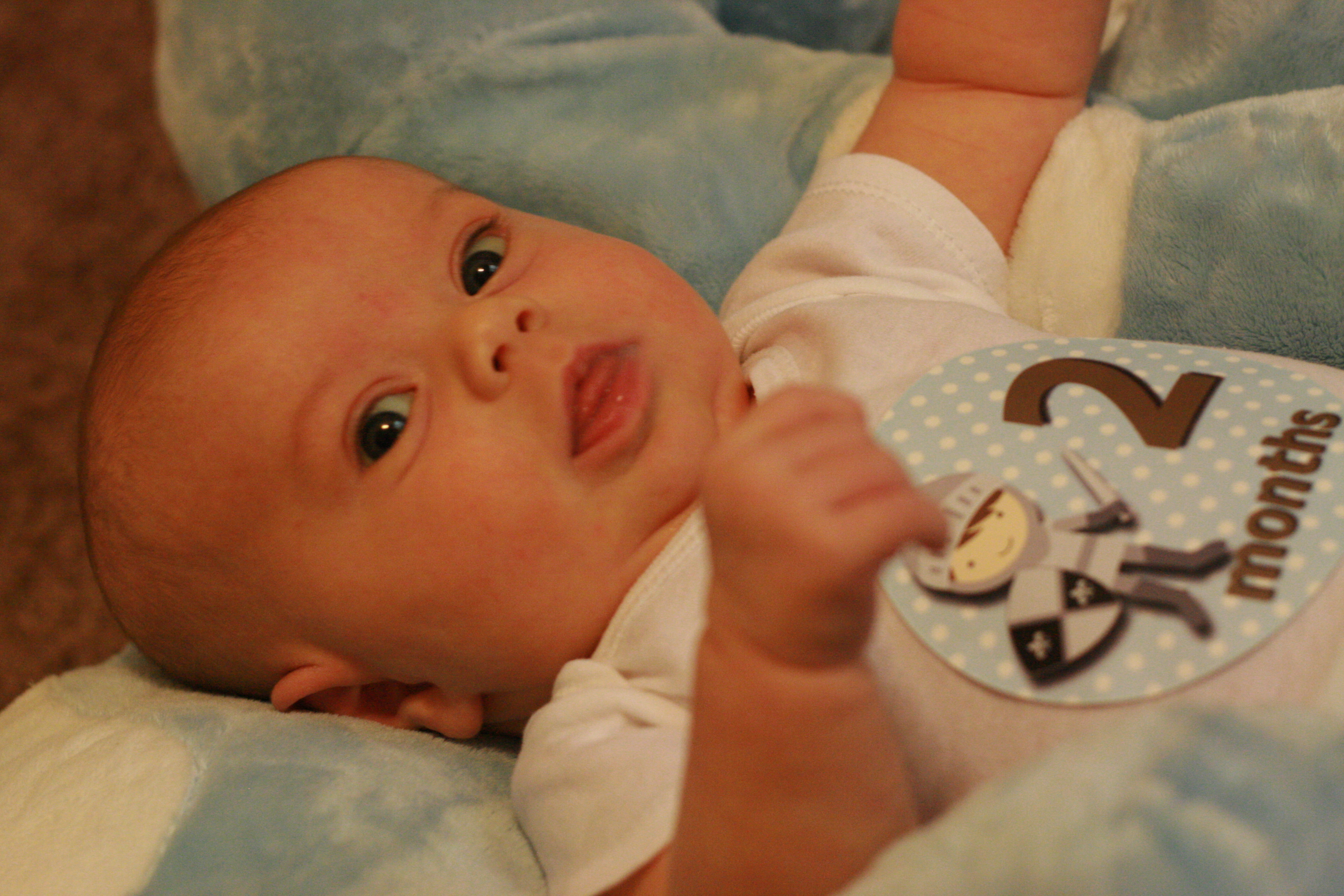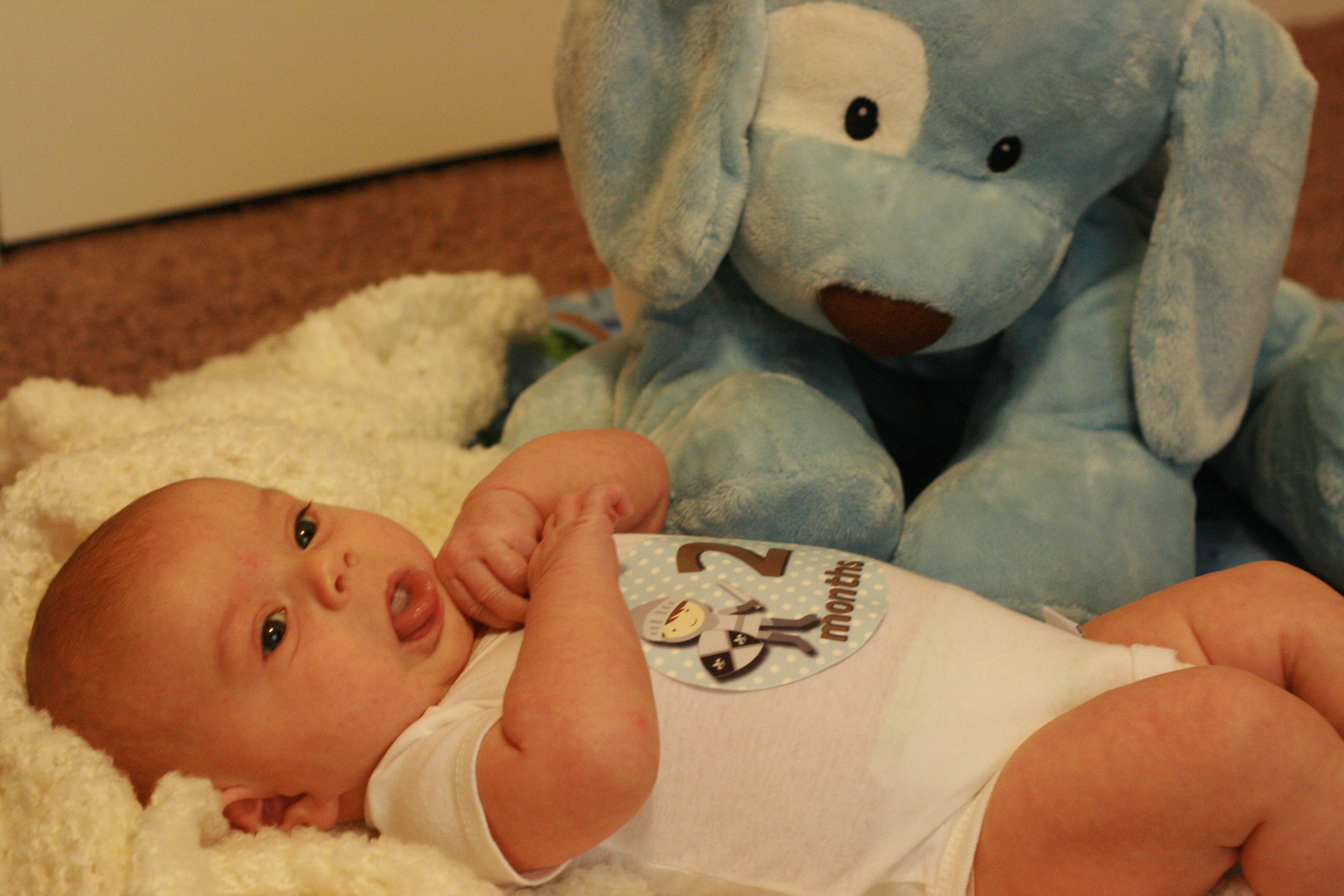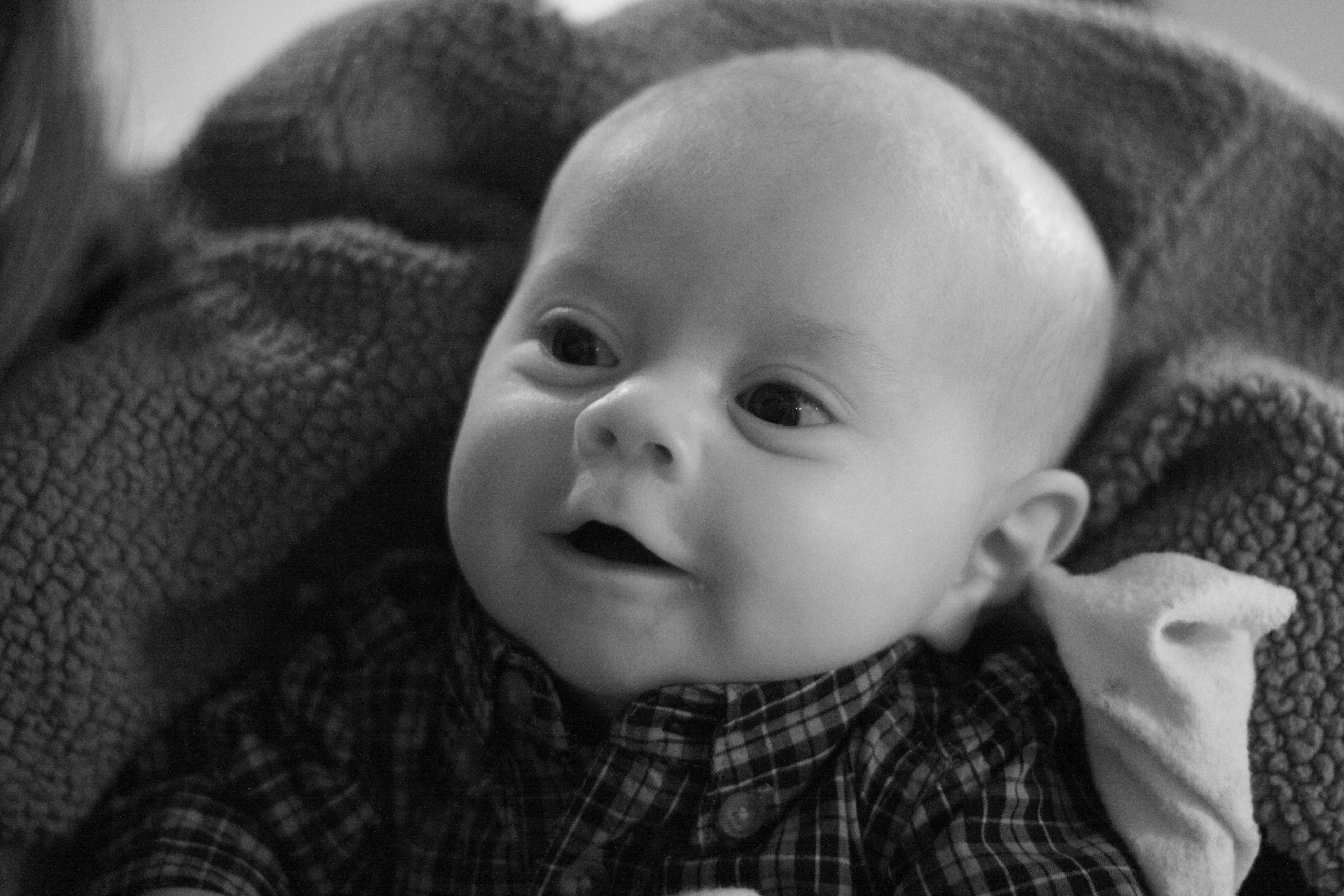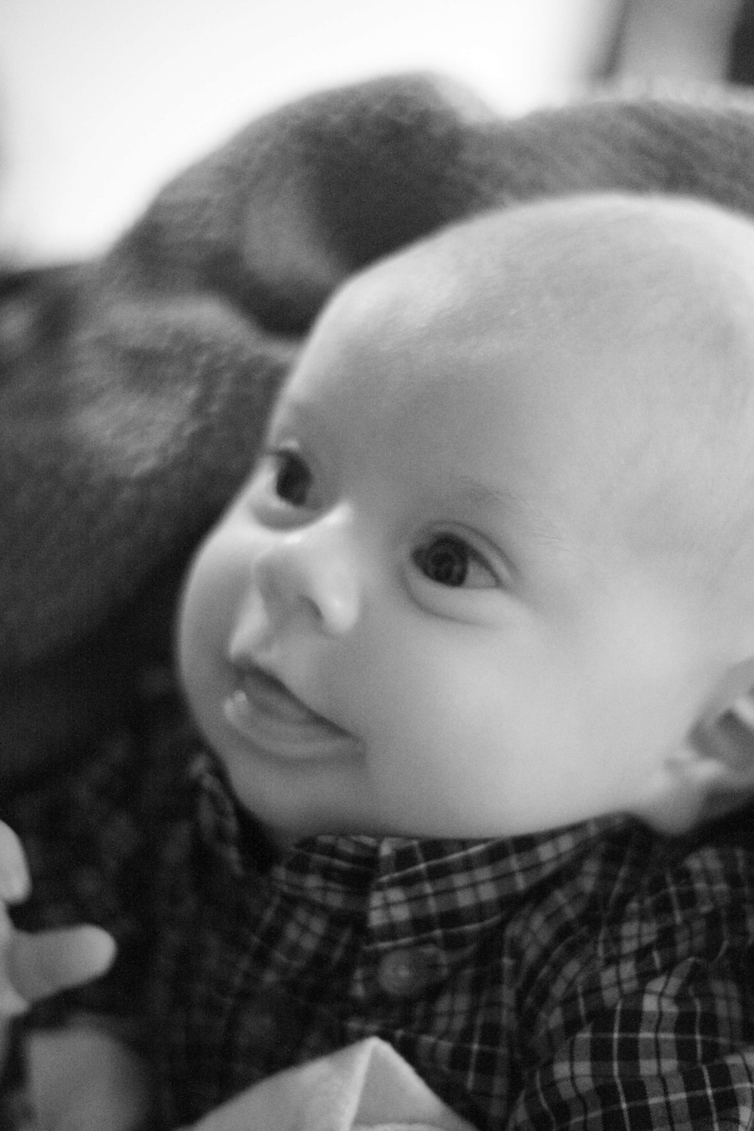 It seems like only yesterday I was waiting for him to be born, past his due date, and then taking him home; this tiny creature who had been through so much and was so fragile and bewildered. The boy who lives in our house today is much rounder and much, much louder. The haze of jaundice is long gone, and he is vibrantly alert. He smiles often, and each smile lights up his face with pure joy. He has one big dimple that can be seen when he smiles. He even wakes up with a smile on his face before his eyes open. This “social smile” – a smile in response to outside stimuli, like being spoken to – is an important milestone. He is controlling his head very well, and using his legs to “stand up” all the time. He is so much bigger than before! It sneaks up on you, but you notice when he outgrows clothes. He is so much chubbier and longer. His round belly and chunky legs are hopeful signs that all is going well with breastfeeding.