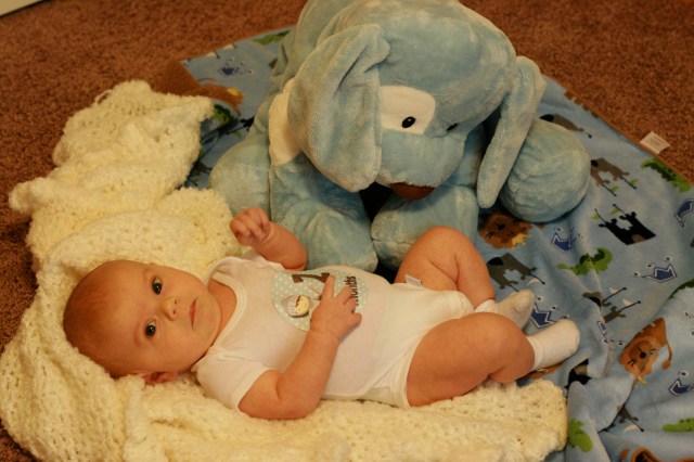 He is awake most of the day, alert and looking to play. He likes to watch me talk to him, and coo or goo in response to the things I say. He stares intently at lights (both artificial, and the lights coming in the windows) and loves to look at the pictures in his room. When he is on his changing table he stares at the castle on the wall, and we will walk around his room so he can look at the other pictures. He will follow toys with his eyes and squeaks and coos at them. Today while working on his birth announcement, he stared intently at the pictures of himself on my computer. My smart boy is blowing bubbles in his mouth and sticking his tongue out all the time (as I’m sure you’ve noticed from his pictures). He squeals and moves his arms and legs rapidly, which is how he earned the nickname “Boogie” from me. 🙂