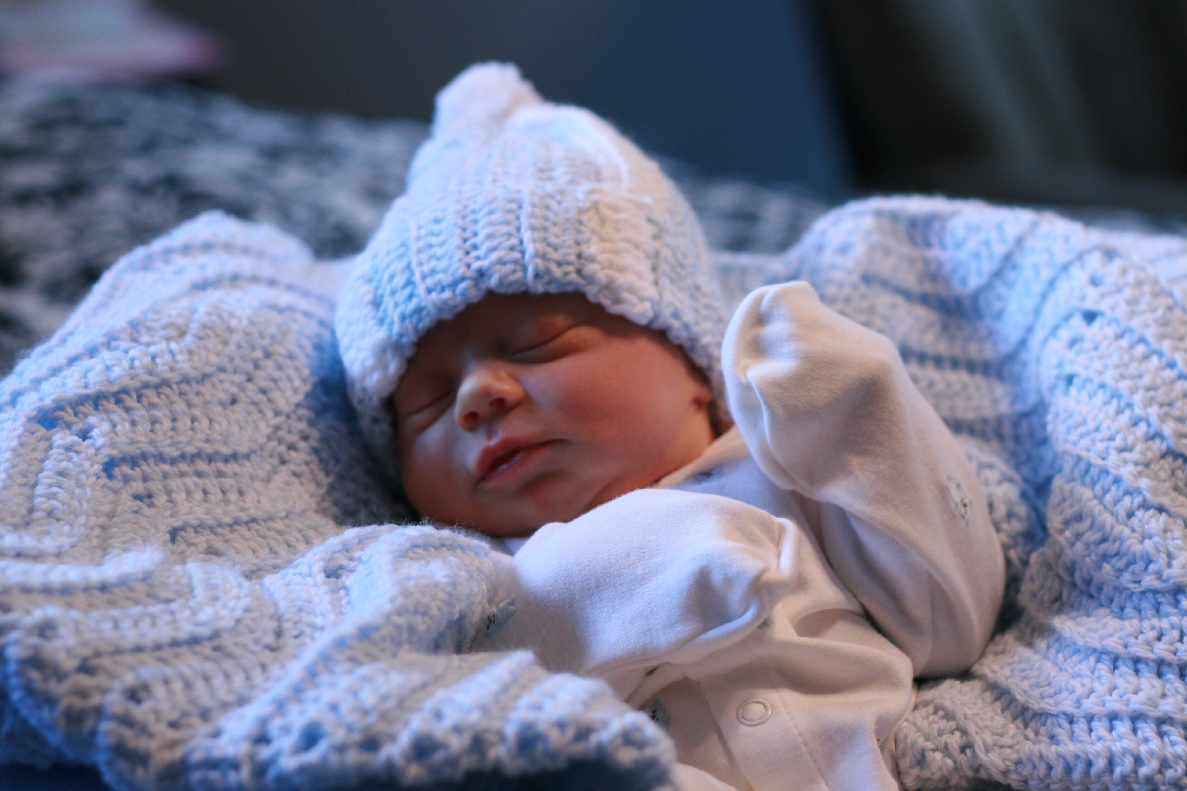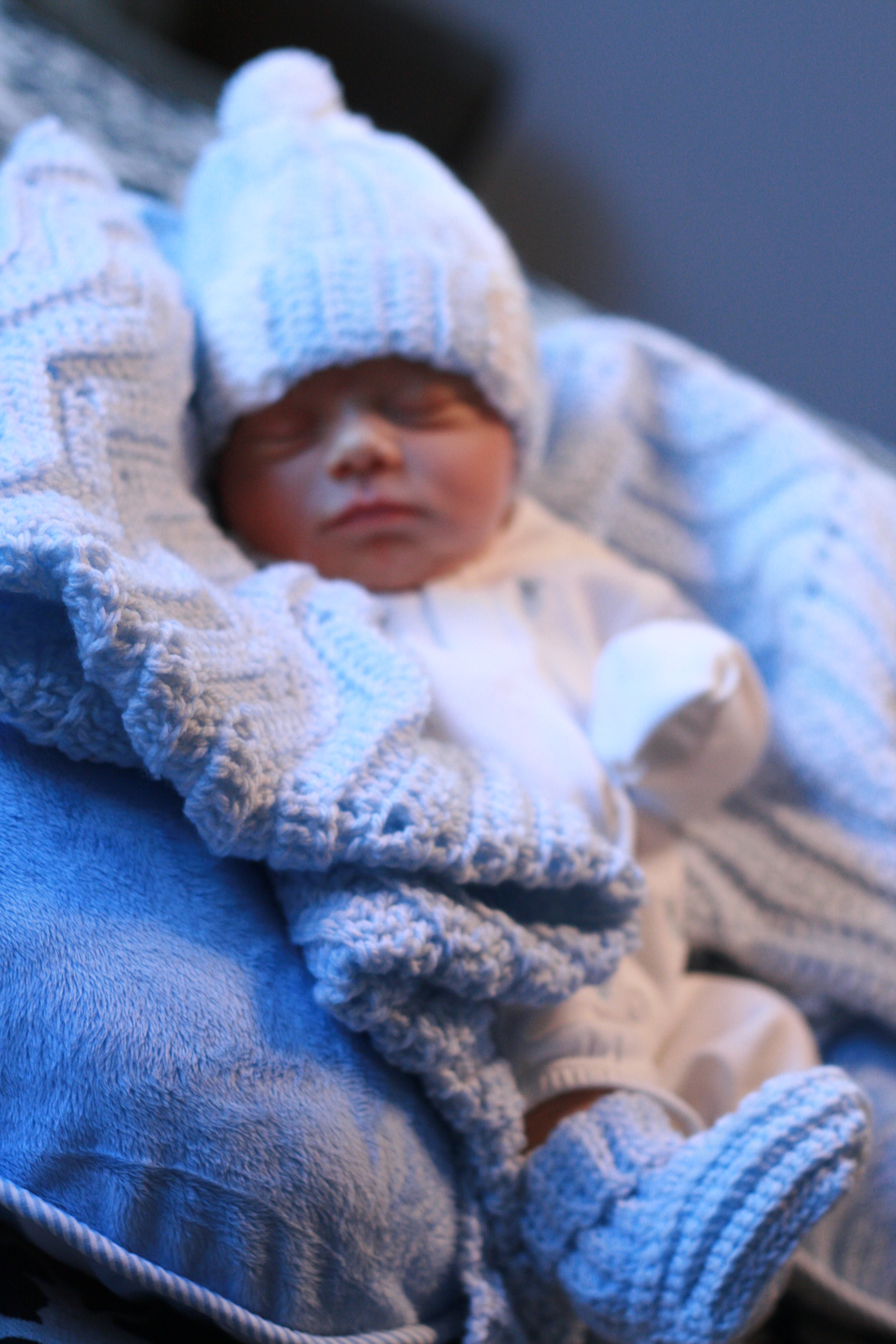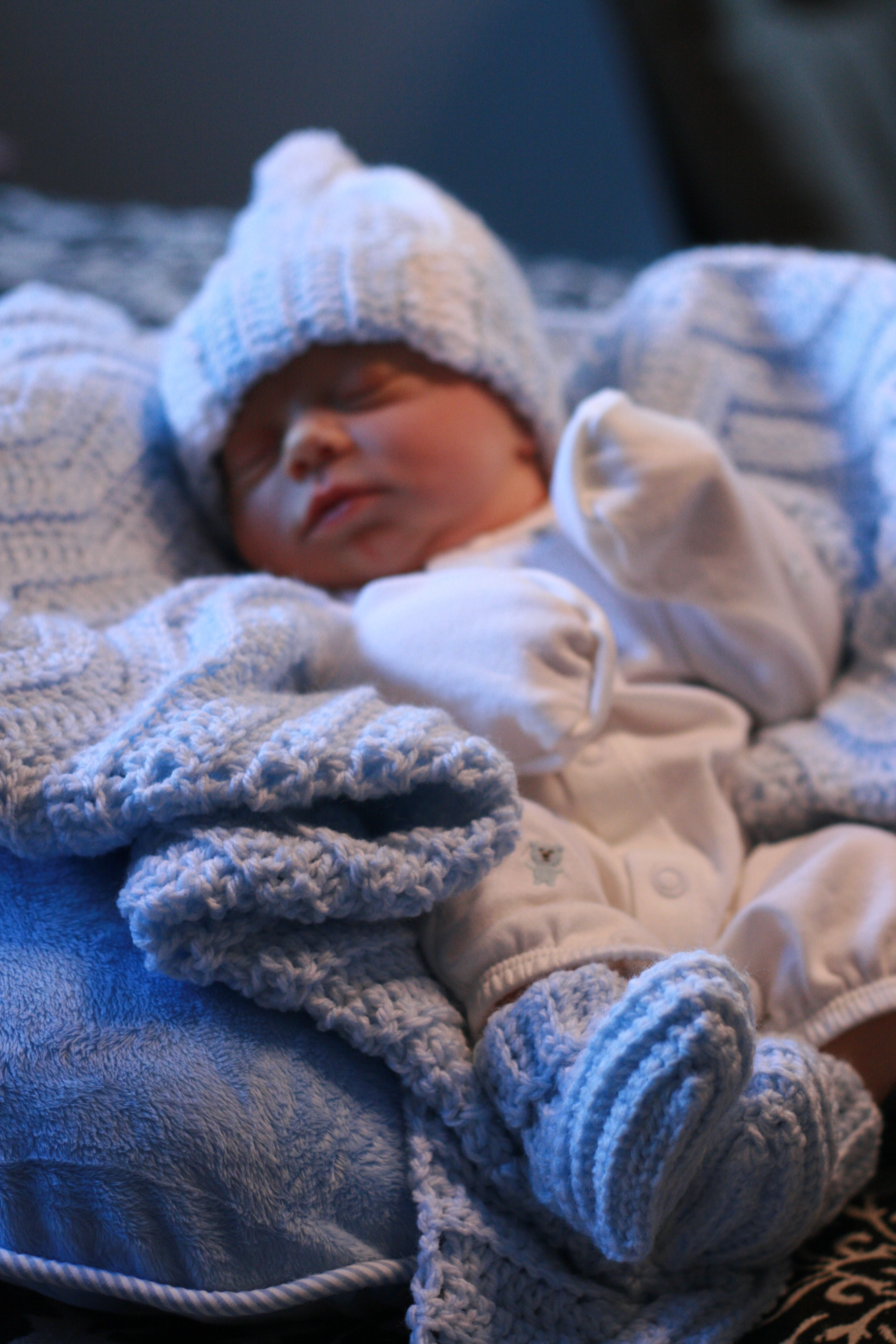 First up: the outfit Jacob wore home from the hospital–these are the first pictures taken of him in his first minutes home! Made by his great-grandma Verla, the darling hat, blanket and booties are so beautiful. This was the first outfit I dressed my baby in.