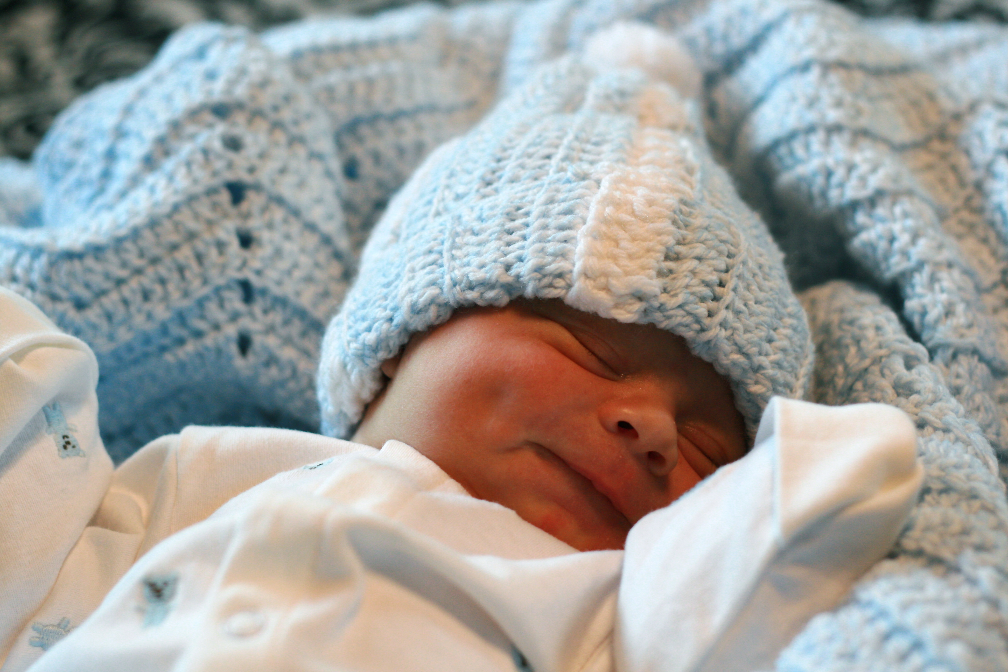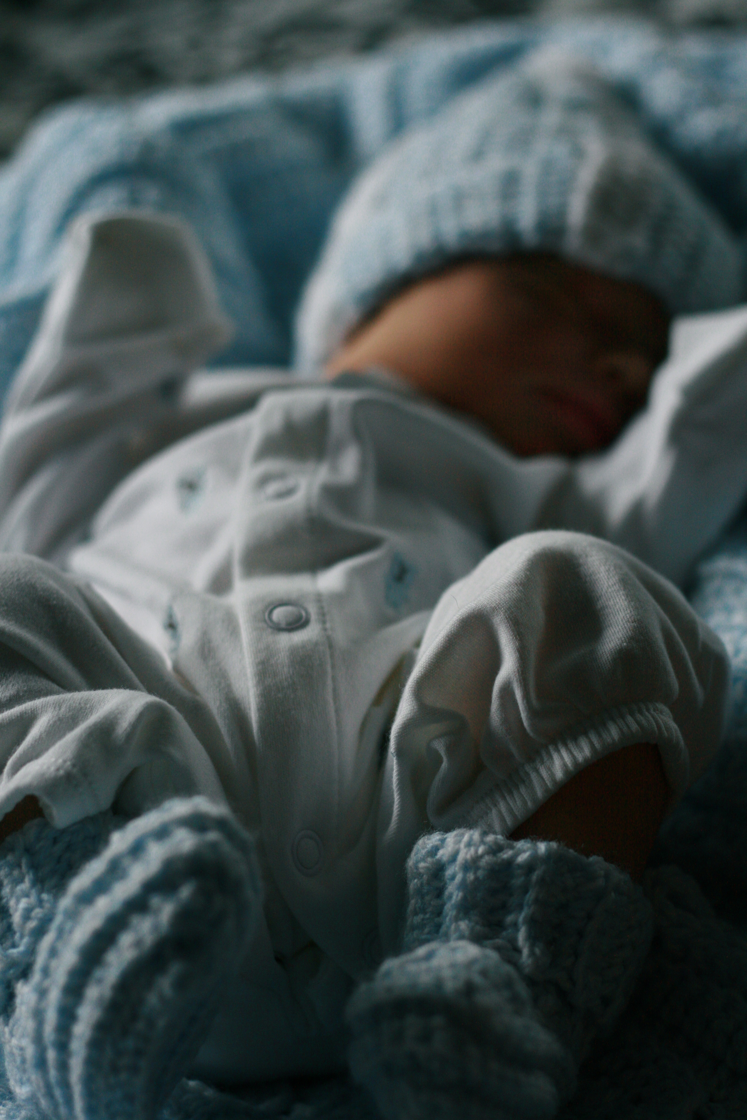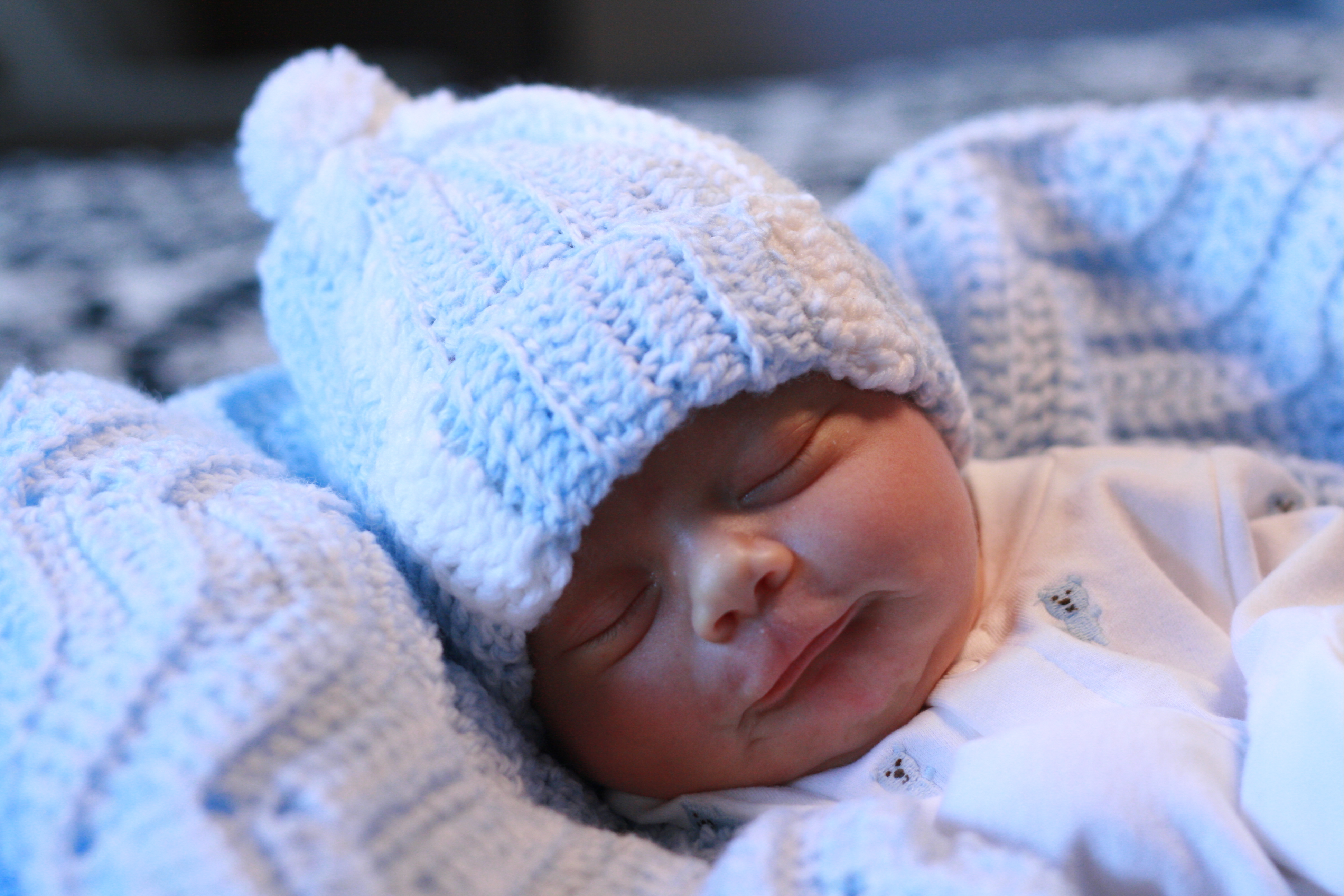 First up: the outfit Jacob wore home from the hospital–these are the first pictures taken of him in his first minutes home! Made by his great-grandma Verla, the darling hat, blanket and booties are so beautiful. This was the first outfit I dressed my baby in.