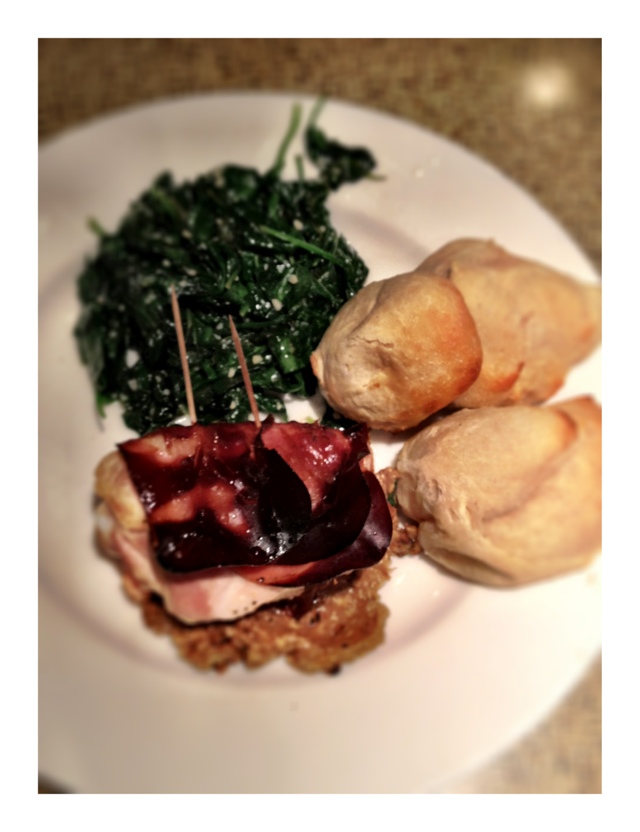 I have been cooking some new and interesting things, but food is so hard to photograph. I tried to capture Monday’s dinner of oven-fried chicken, gruyere macaroni and cheese, and a salad of sprouts, leeks and beets with a peanut line vinaigrette but my phone died and I lost the pictures. I know it’s not as fun without pictures so even though this isn’t very pretty, here is tonight’s: sautéed spinach, roasted celery root purée, and prosciutto-wrapped chicken with fresh rolls.