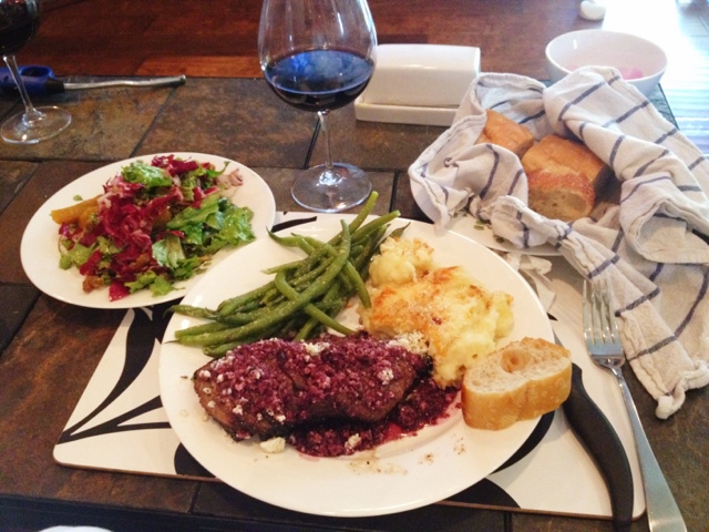 Rib-eye steaks with crunchy goat cheese crust and Cabernet reduction sauce
