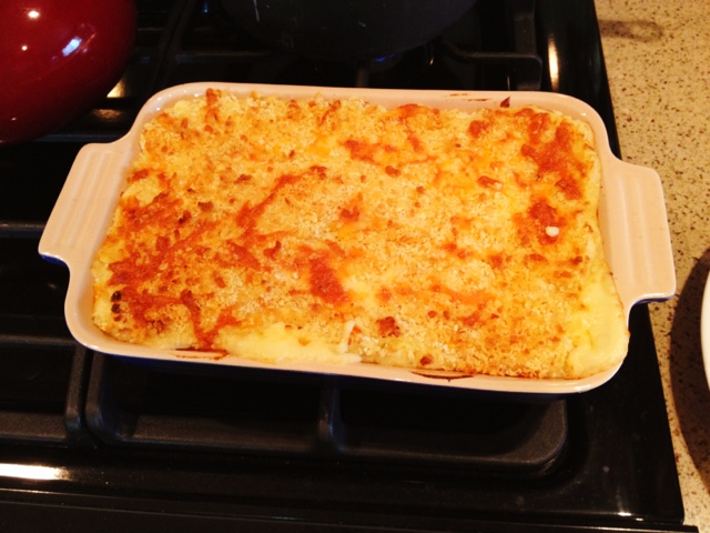 Boil potatoes until tender. Set aside to cool a bit. In a small saucepan, melt 1 tbl butter. Add as much garlic as tour heart desires and let it cook in the melting butter When melted, add 1 tbl flour and whisk. Add 1 cup milk (even 1%! Or nonfat!) and whisk until it’s smooth. Allow it to slowly cook and bubble on a low heat until it has thickened substantially. Add 3/4 of your cheese and whisk until smooth. Continue thickening. place potatoes in food mill and process through On medium blade. Mix in 4/5 of your cheese sauce and place in a stone baking dish (Pyrex is fine, too). Top with remaining sauce, grated cheddar, then Panko crumbs. Bake uncovered at 450 until the top is golden brown.