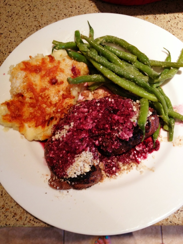 Rib-Eye steak with a crunchy goat cheese crust and Cabernet reduction sauce