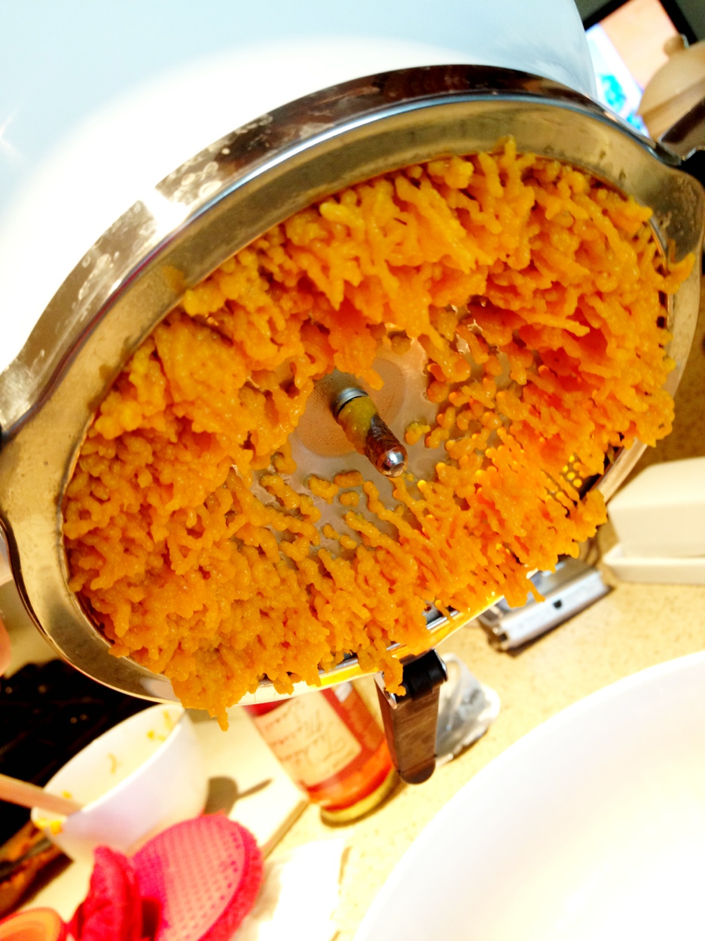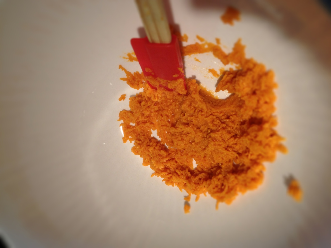 Pierce the potatoes and place them in your chosen baking dish. Roast at 450 for about an hour. Allow to cool enough to touch them. The skins should be basically separated from the pulp. (note: turning them once while cooking should help the skins separate completely.) Remove the skins. Now you can just mash with a fork and he done, but as he is new to eating, I ran them through my food mill fitted with the smallest disk. I stored what would be a 5-day supply in a reclaimed spaghetti sauce jar. The rest I froze in 1-oz. ice cube trays and then freezer bags with the date for future food mixing.