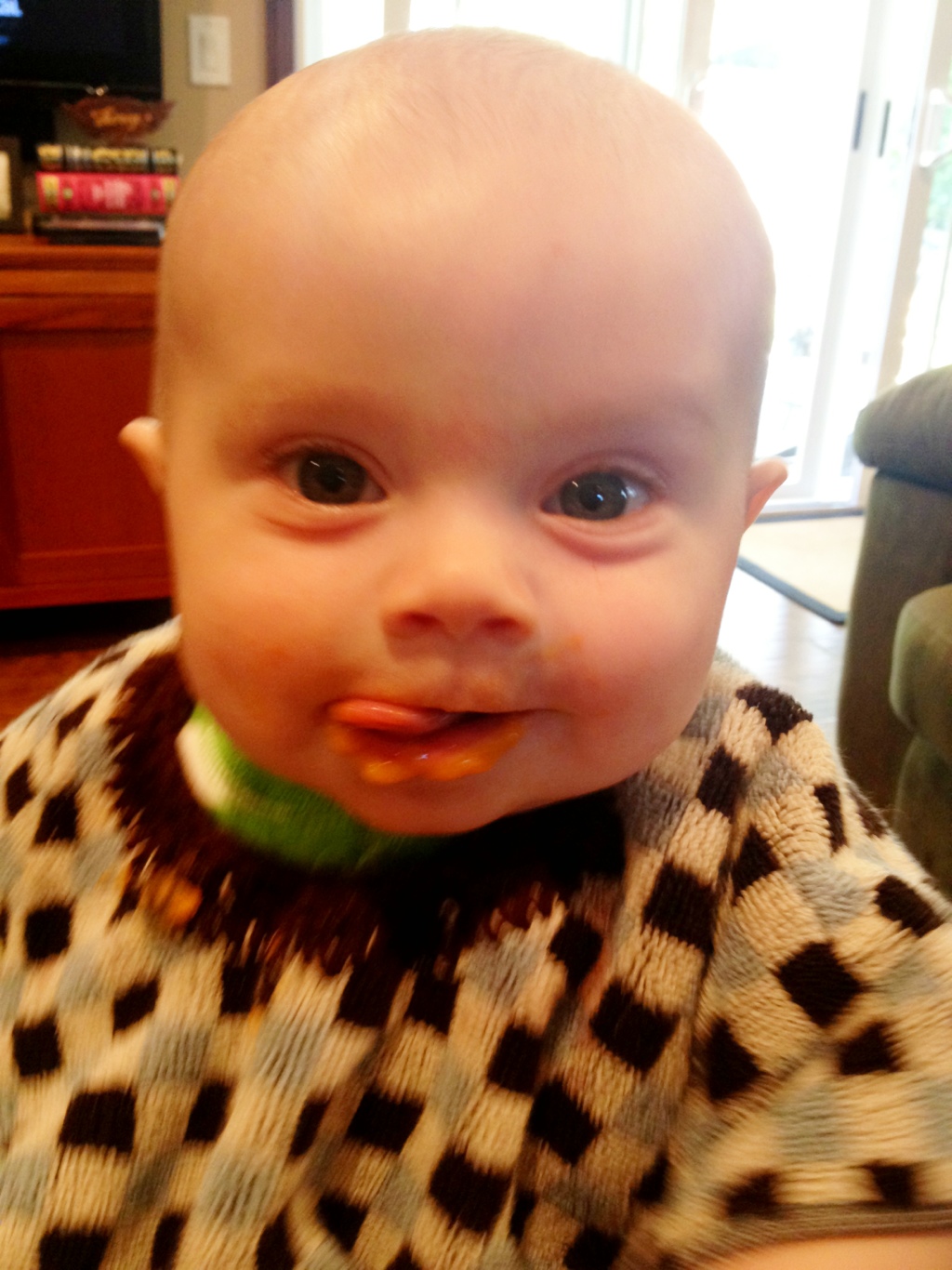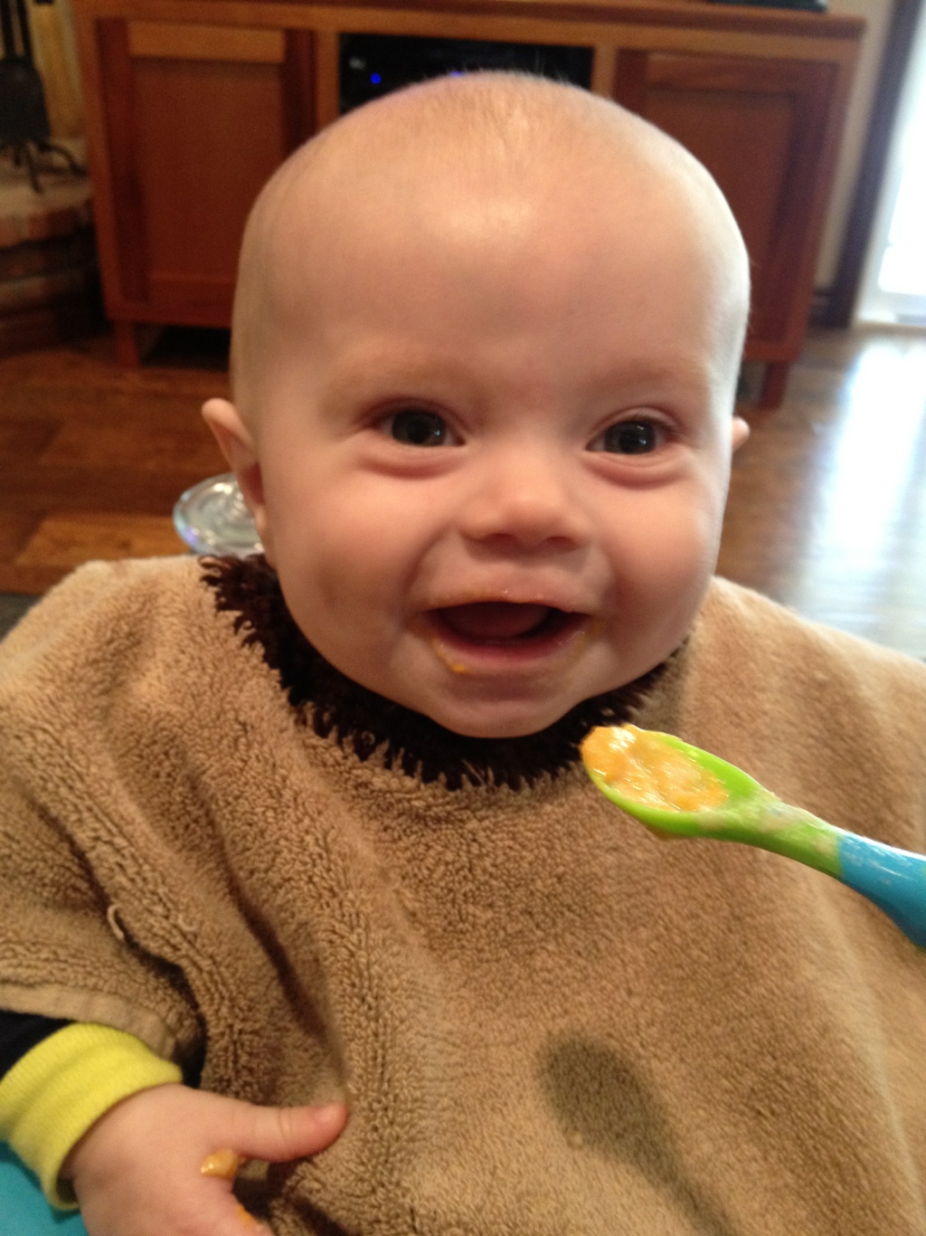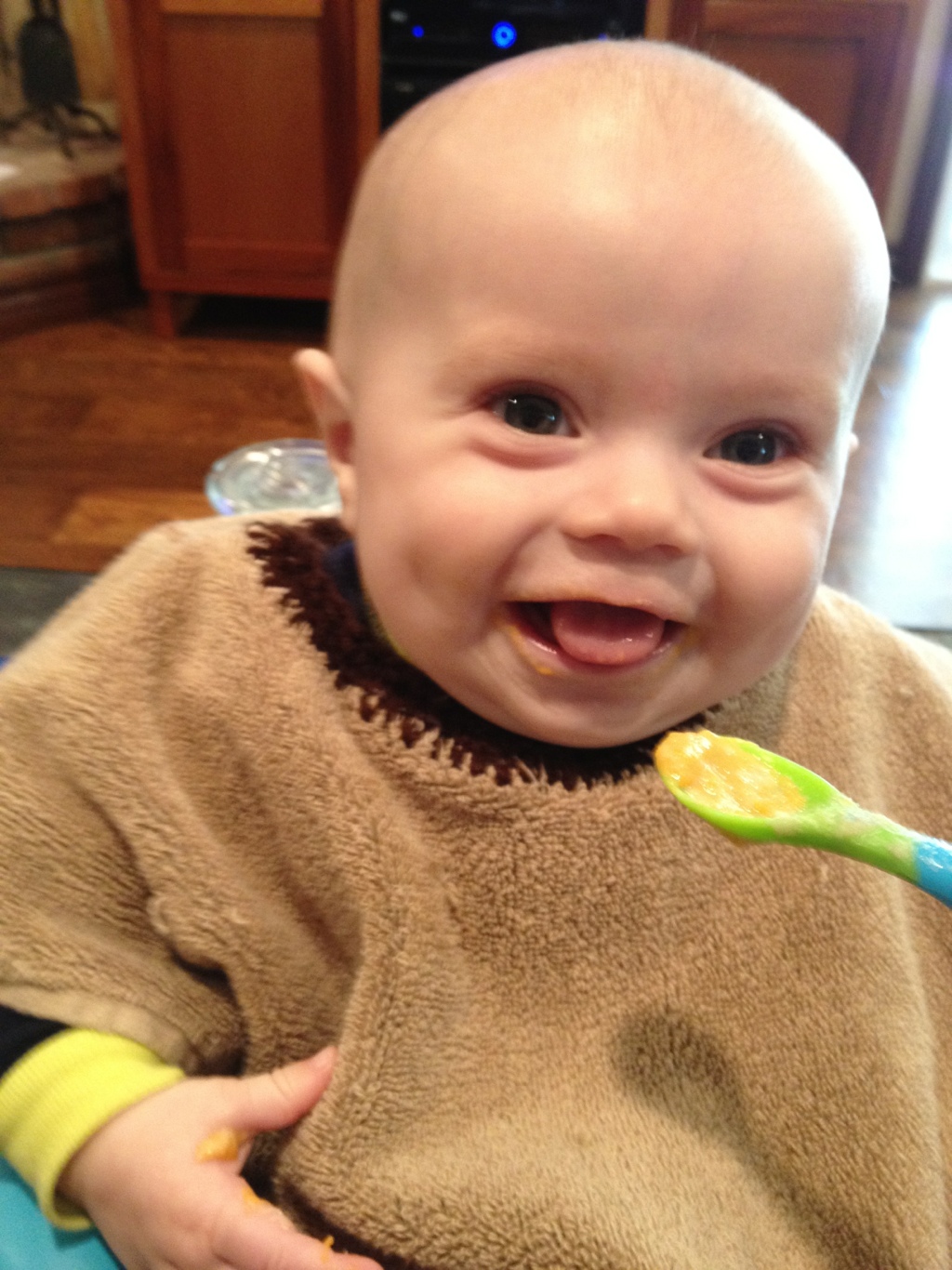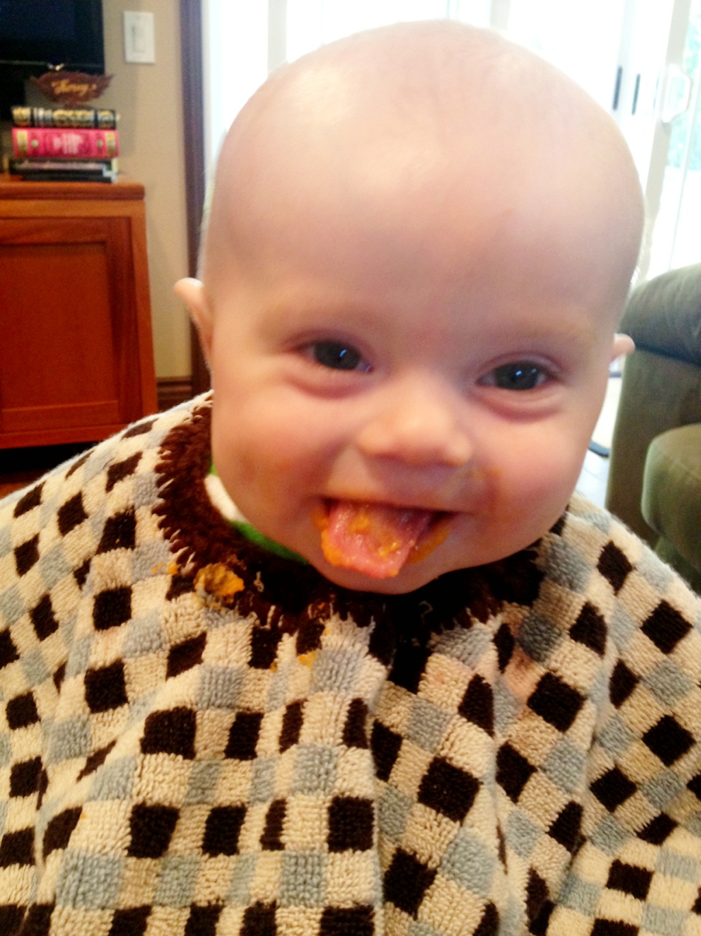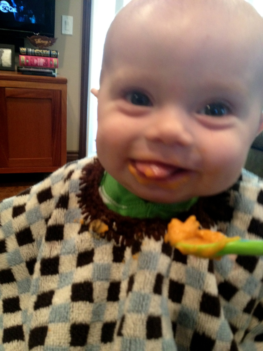 I made sweet potatoes for baby j. Delicious and nutritious! This was his second food and he was so happy eating it!