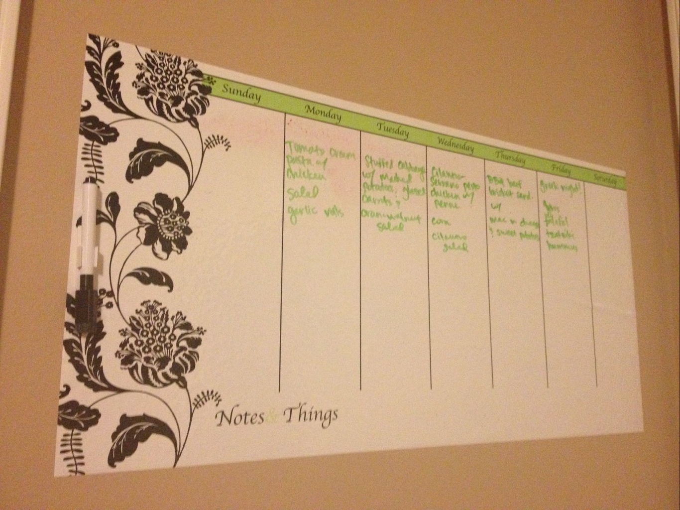 This is a photo of my vinyl dry-erase calendar. I write all our meals and events on here. This week we had two nighttime schedule changes, but I left them in this order and I will bump them in my mind. 🙂