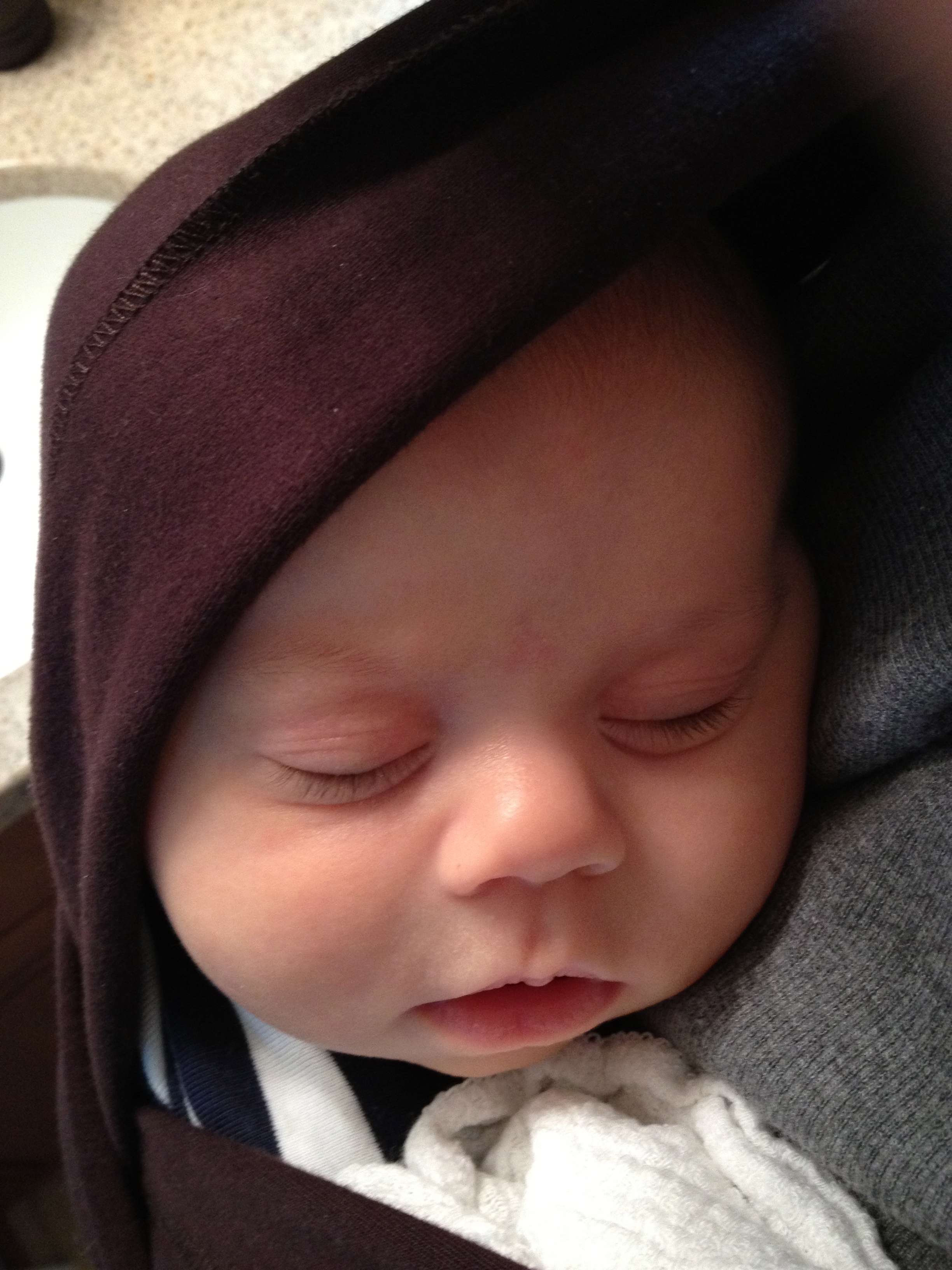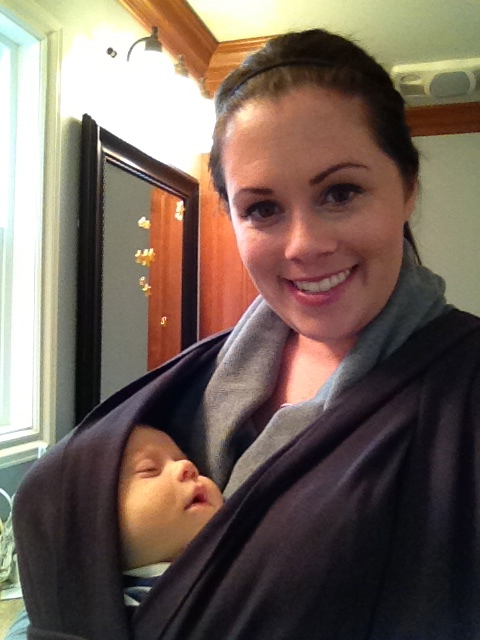Why do I do it? I’ll answer this in terms of why anyone BWs. The advantages are great for mother and baby (and father and baby!) The physical closeness has amazing physical side-effects. Struggling with breast milk supply? Try wearing your baby and see how your body responds to the physical closeness. Your baby comes from constant contact with you and the instantaneous meeting of his needs into a world where he is expected to be on his own for much of the day. Of course you can’t hold baby all day, and he will adjust to that, but BW allows you to wear him for much more of the day than you could with your arms occupied with him. When Jacob was struggling with colic, wearing him in my Moby wrap was a GODSEND. The closeness to me was comforting to him – physically, the hormones your body secretes when you are close to baby make you both feel calm and secure, like Prozac! – but also the position of his body as a newborn with his knees tucked against his trunk, helped his stomach to calm. Also the gentle bouncing as I walked, cleaned, and cooked, reminiscent of the womb, was both comforting and helpful for his hurting belly. Also, I was able to get so much more done! It’s a million bagillion times easier to grocery shop while wearing your baby. Rather than filling your cart with the car seat and not being able to buy much [and of course you would put the car seat IN the basket and not in the child seat, which is extremely dangerous], you have both hands and the cart free and open to get things done! Plus, you can navigate through tight aisles without a bulky stroller. Carrying a car seat is so bad for your back. They are heavy! Wraps and buckle carriers (and others) are ergonomic and comfortable. It’s also a great workout. I know that’s the least of your concerns as a new mom, but I spent a lot of hours bouncing my colicky baby and have noticed a difference in my leg muscles. The wrap was my safeguard against a really fussy day or night. If things were going south, I could wrap him up and he would clam instantly, usually falling asleep soon after. I am wearing Jacob as we speak, while softly bouncing on my “desk chair” AKA yoga ball.