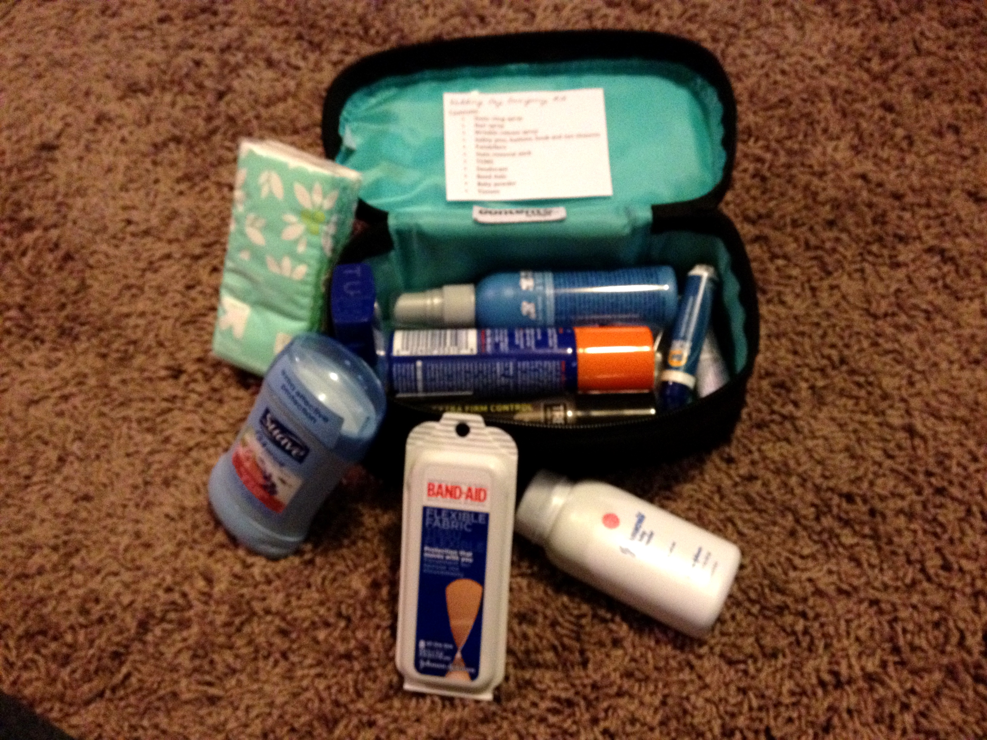 Recently, I made this emergency kit as a bridal shower gift for my friend Jamie. I wanted to give her something personal, useful, and outside-the-box. I like the way it turned out. I used my knowledge of the things I wished I had or could have used for those random emergencies.