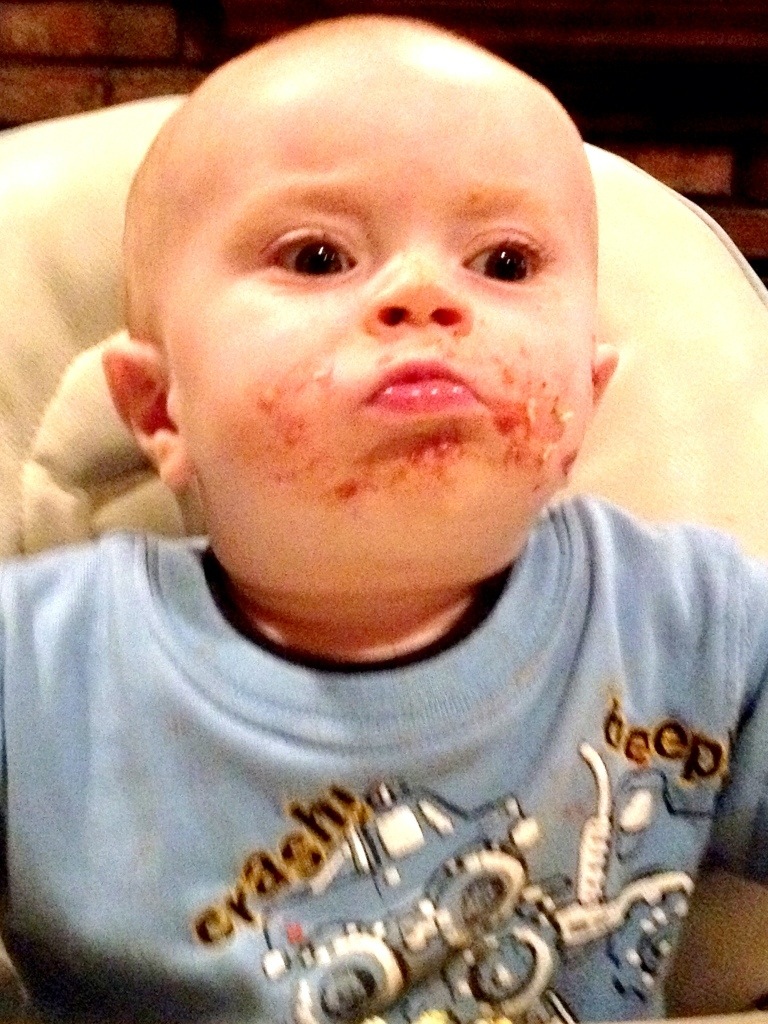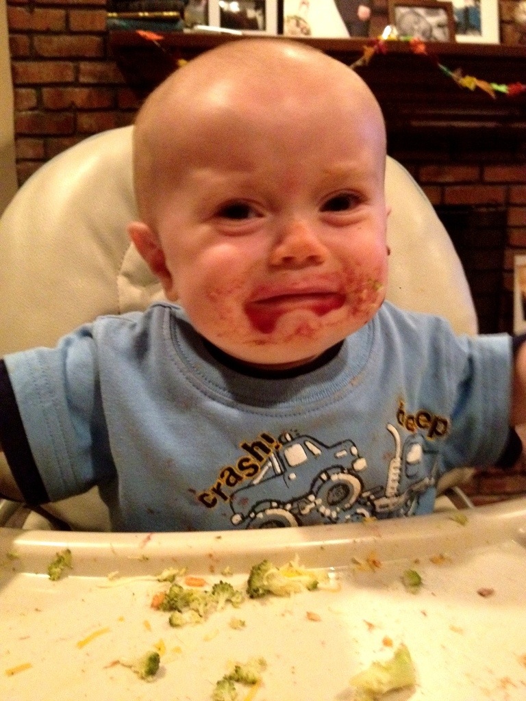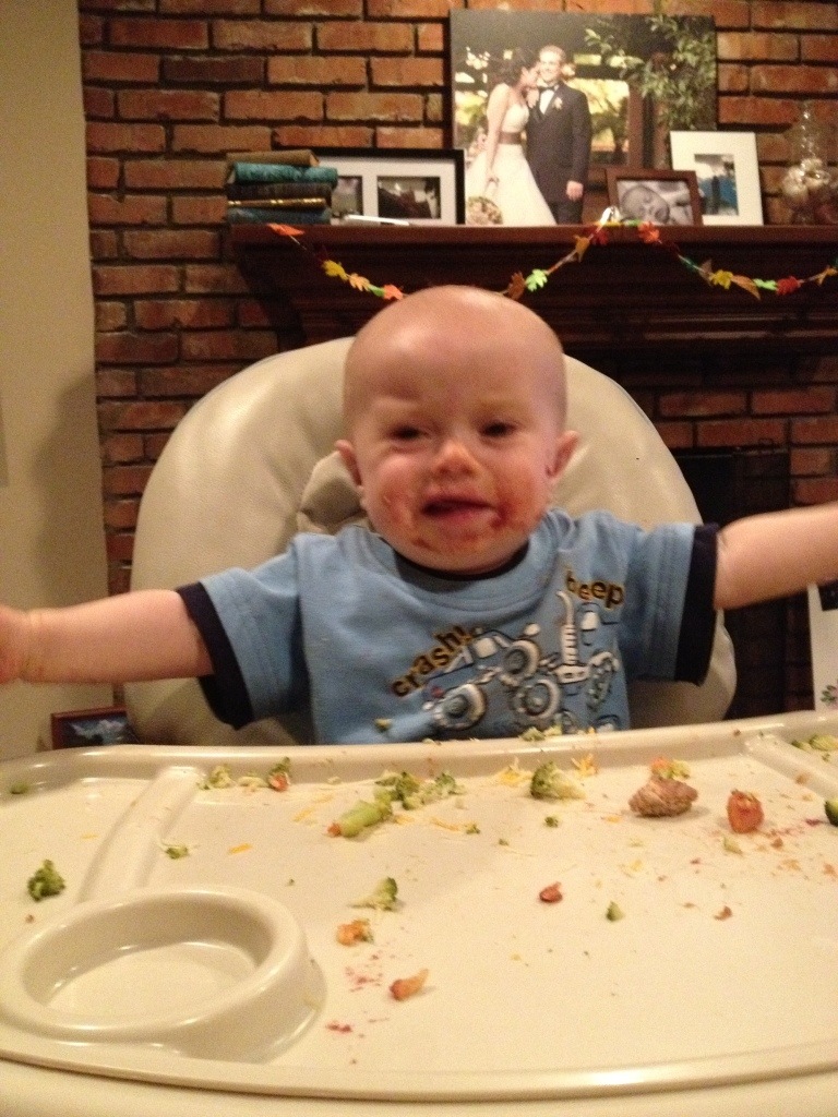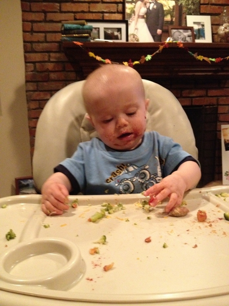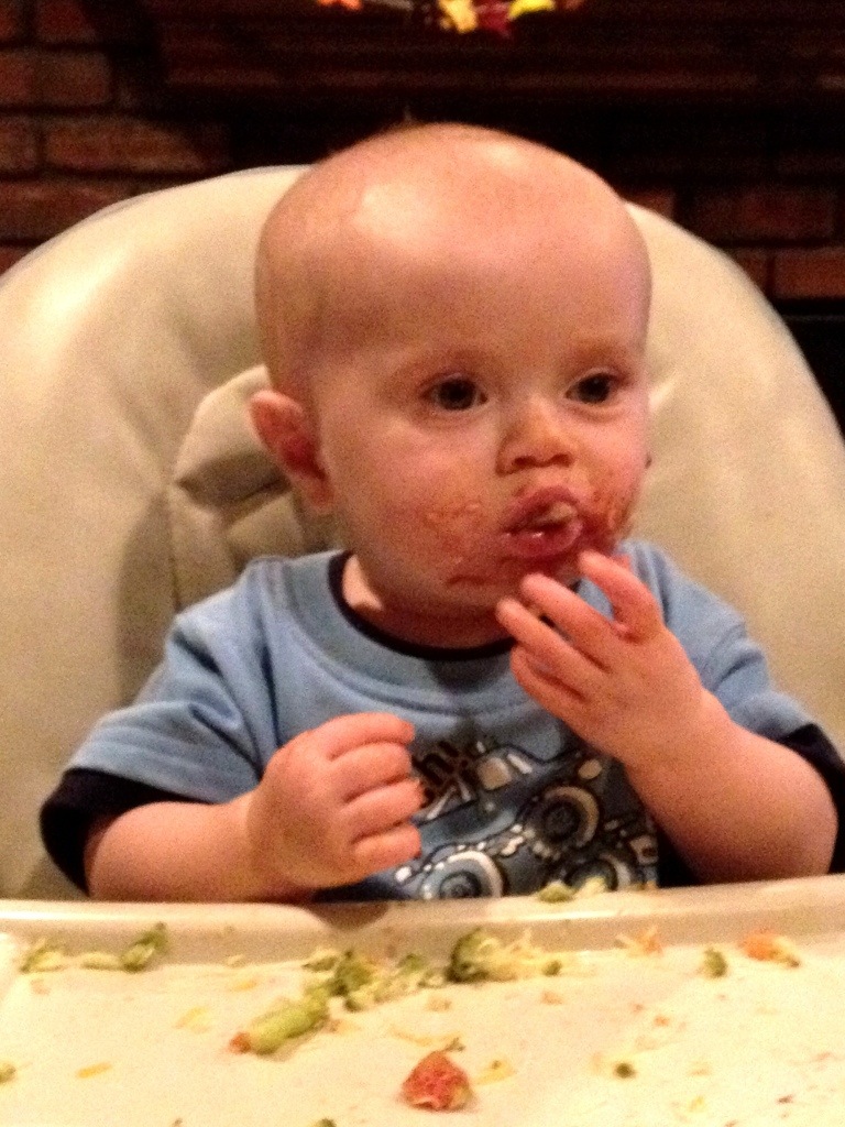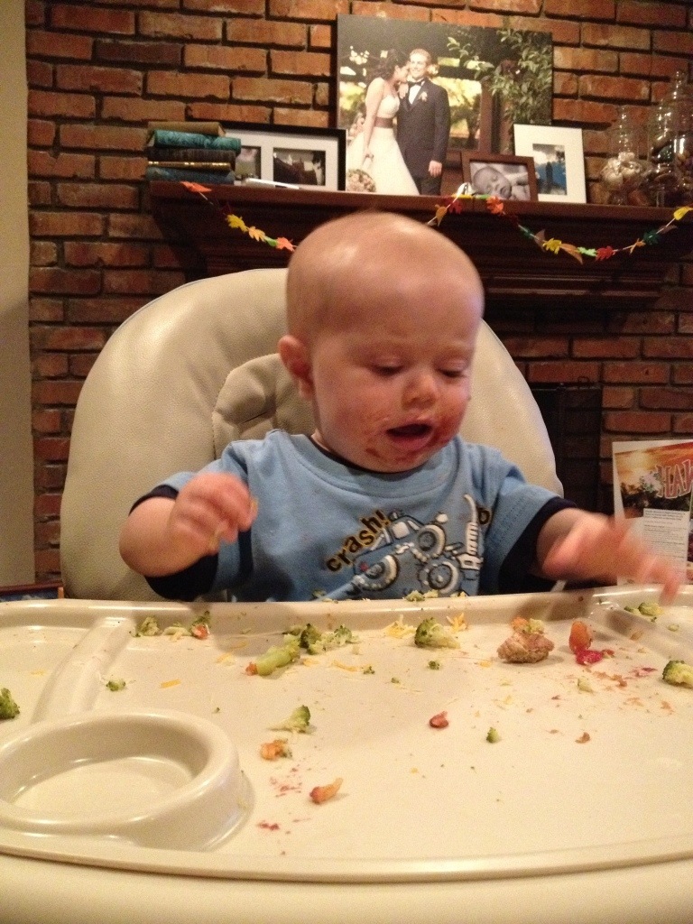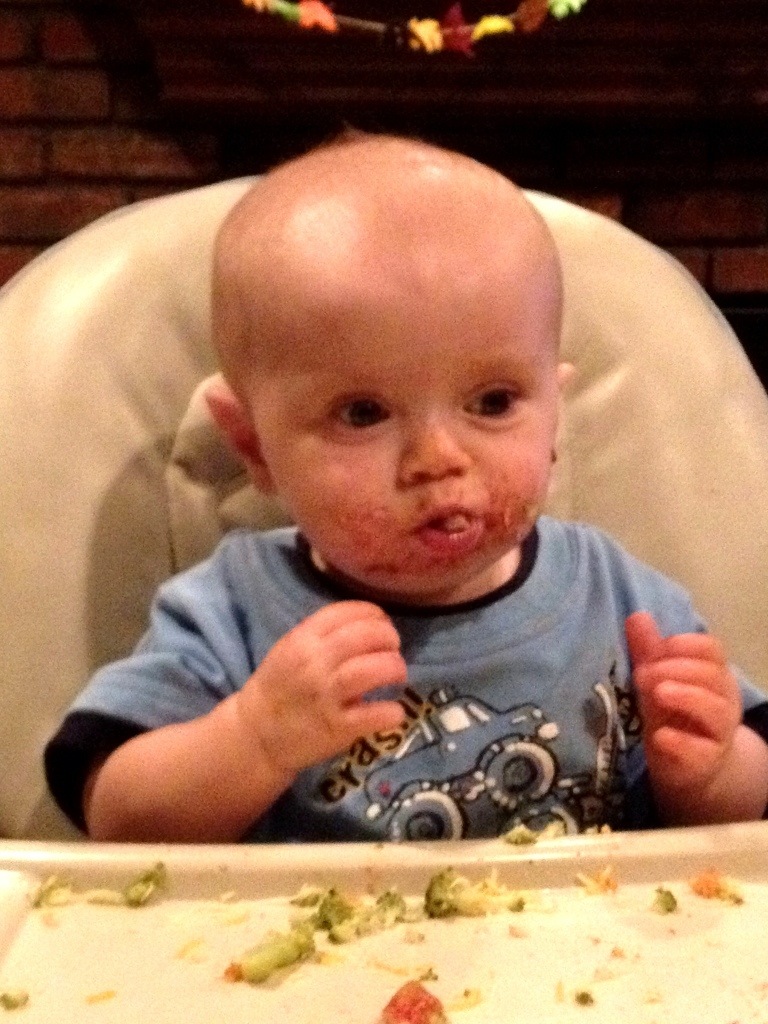 Jacob is such a great eater. He really likes almost everything he’s had, and his adventurous attitude has led me to serve him things that would make a wide palate for a grown up. For example, tonight he had steamed broccoli with cheese, whole wheat pasta with butternut squash sauce, avocado, sautéed kale and garlic, and a purée (baby food) of beef and spinach. I try to give him some finger foods to help his coordination, along with any table foods that josh and I are eating that I deem acceptable for the baby, and store bought baby food to round out his protein and vegetable intake. I buy Plum or Happy Baby organic food in pouches and jars. Sometimes I will mix in a cereal of oatmeal, spelt and barley for some whole grain. The goal is to get him eating what we are eating, but that is hard with so few teeth. Last might we had chicken tacos, rice and beans. Since I made everything from scratch, I knew what was in it, which is a good start when you want to feed your baby table foods. The chicken and tortilla portion was not going to work without more teeth to chew it up, but he happily munched on beans and rice.
