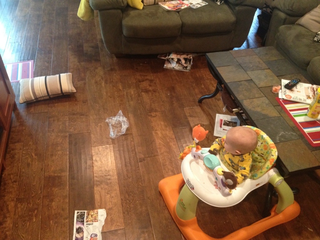 Jacob is a non- stop mess machine these days. His curiosity is adorable but I feel as though I spend my entire day cleaning up after him. Look at the damage he can do to the living room while in a walker. He found some magazines and stomped them to death! Hehe