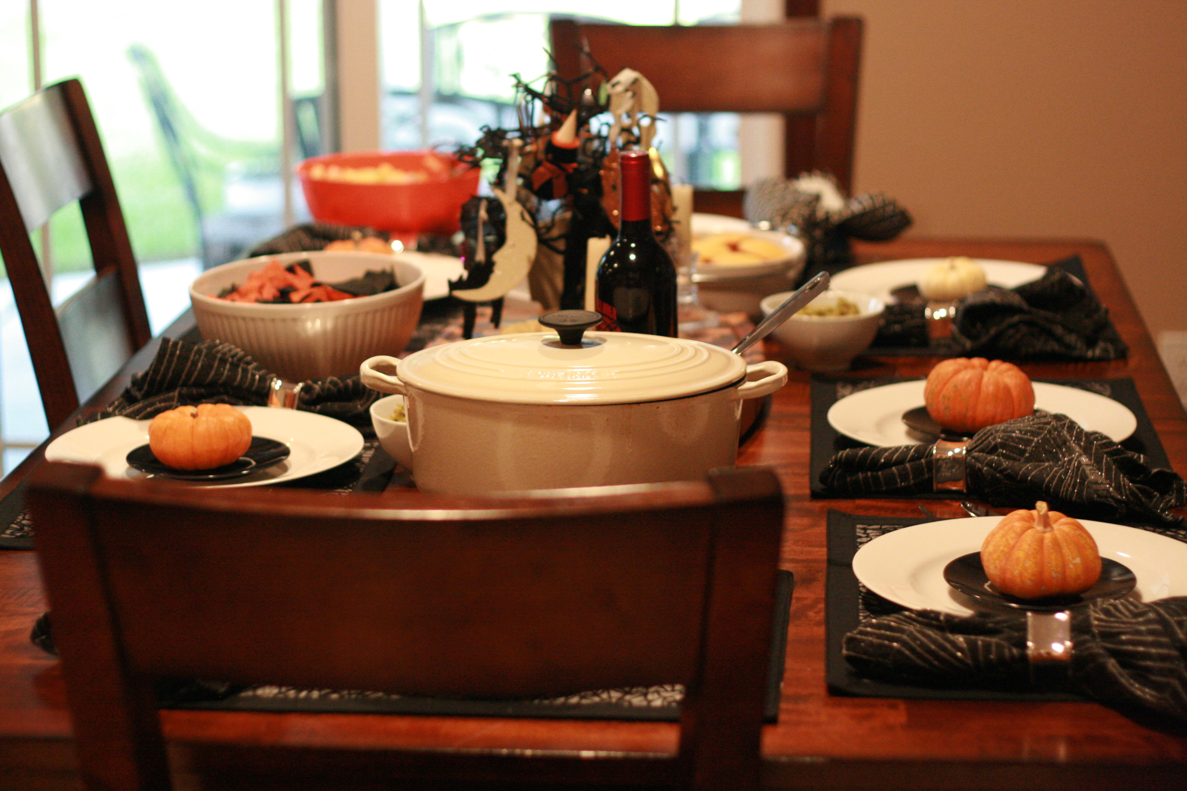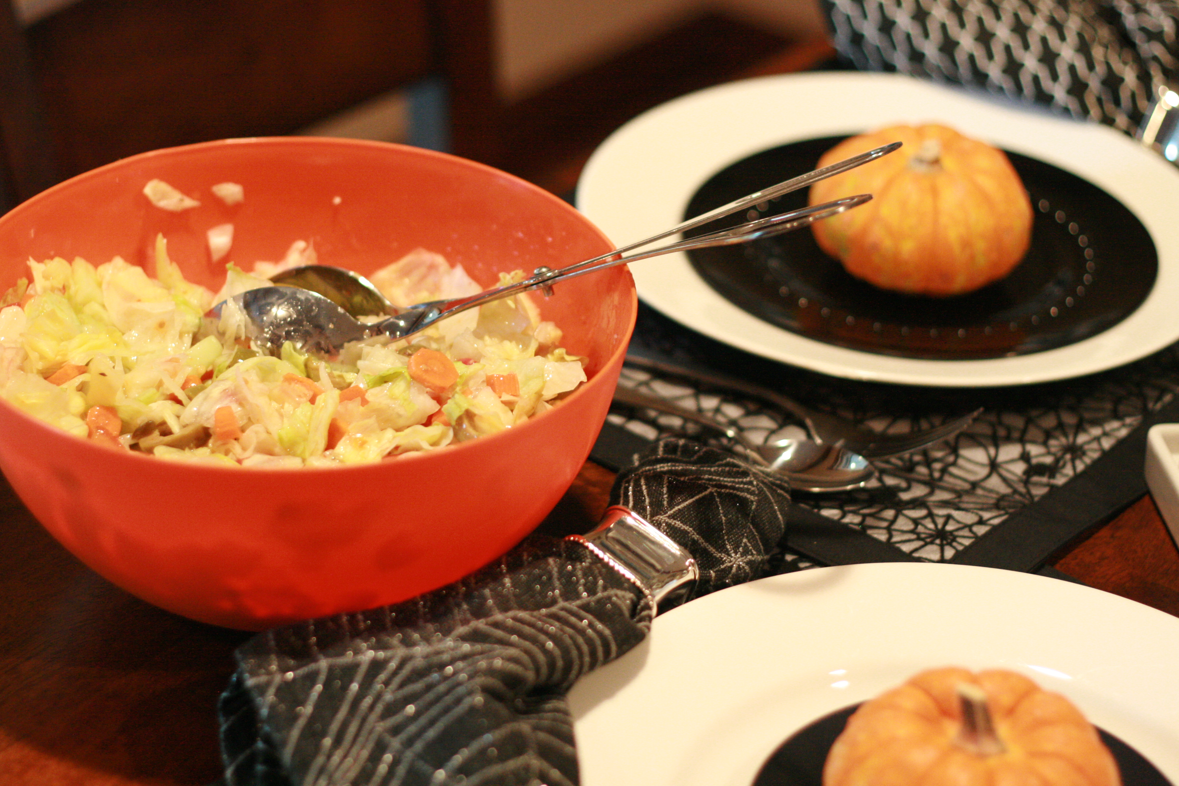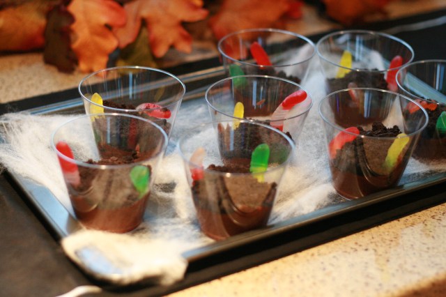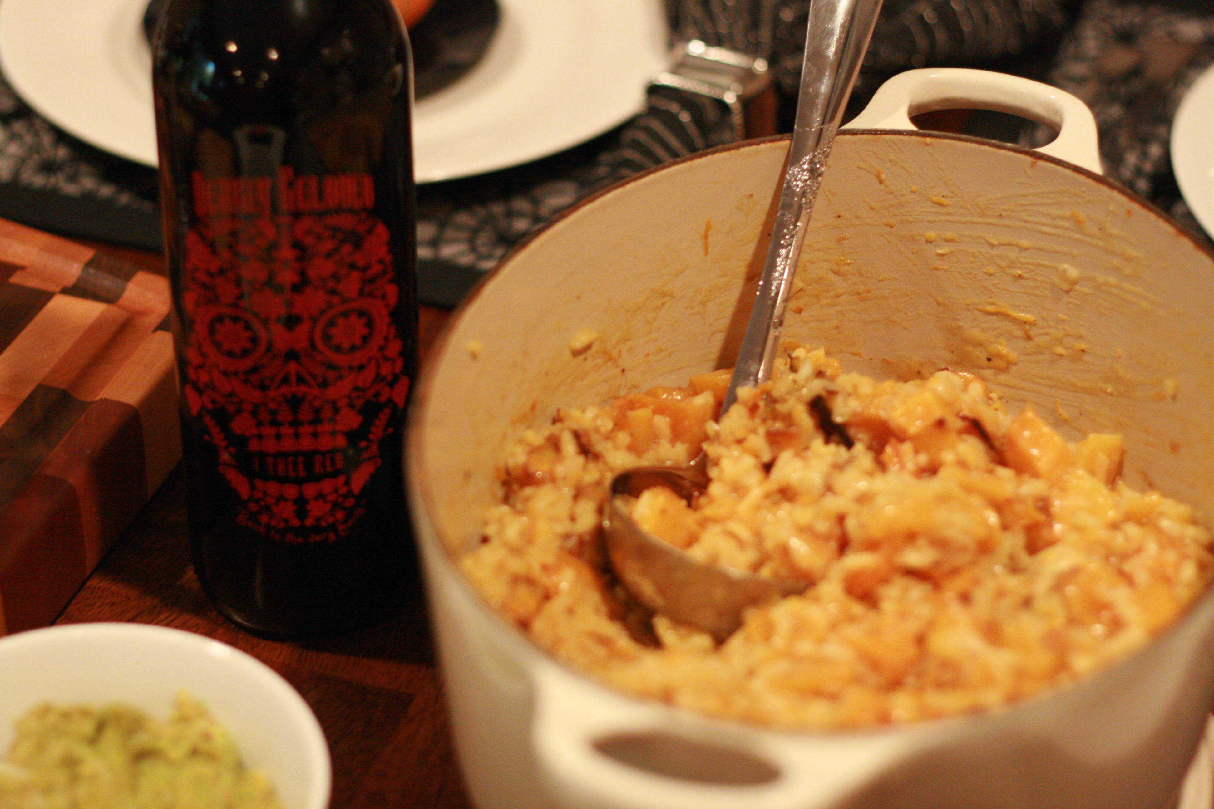 We had both sets of grandparents and Uncle Riley over for a Halloween-themed meal of Guacamoldy and Halloween chips, Salad, Pumpkin Chili and Cornbread, Butternut Squash Risotto, Pumpkin Polenta, Halloween cupcakes and Worms ‘N Dirt.