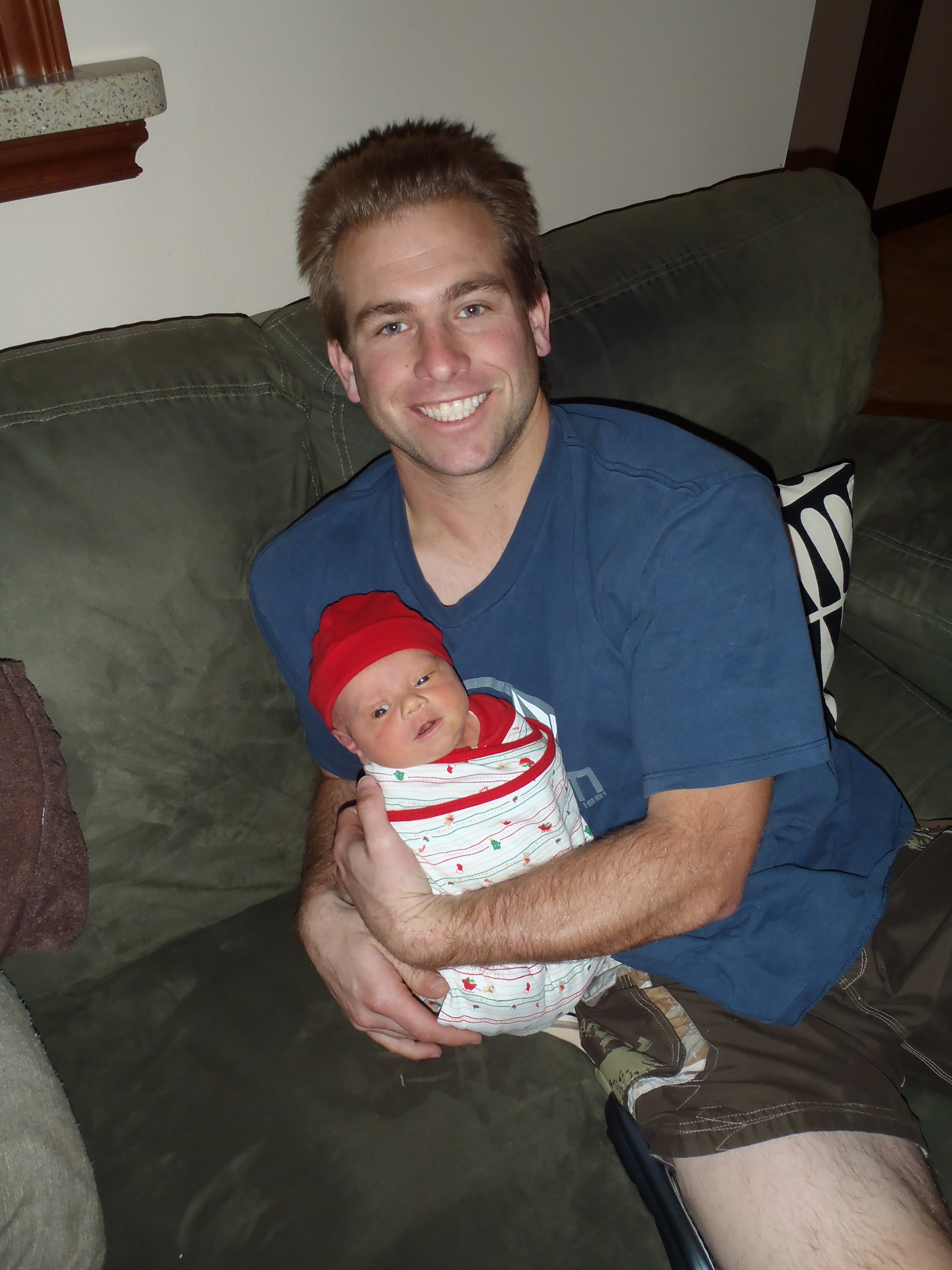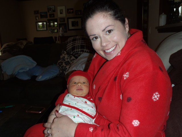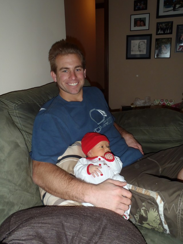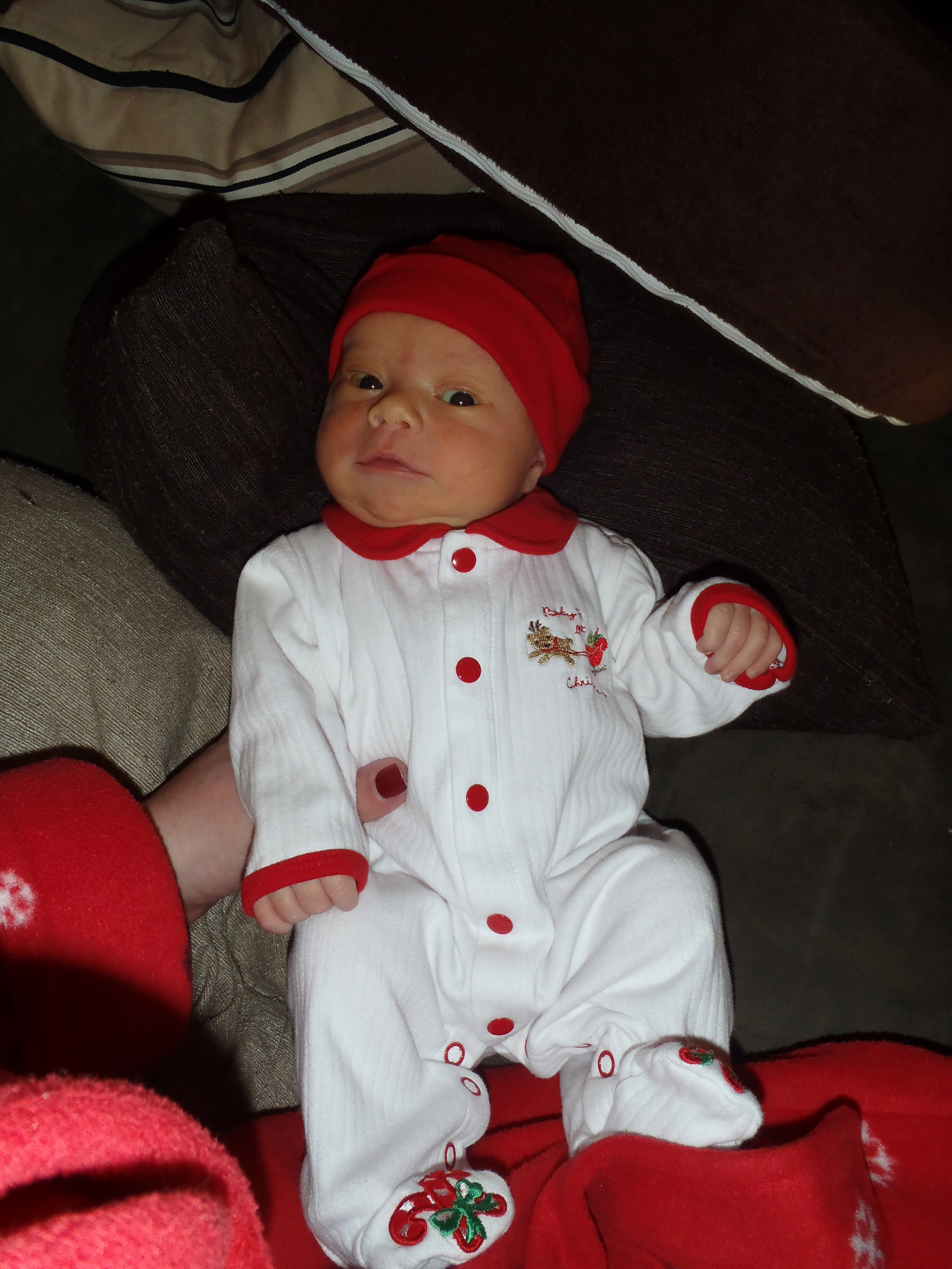 In going through our digital camera in August, I found these sweet pictures from Christmas day 2011. As you recall, Jacob had just been released from NICU on Christmas Eve. We stayed home so as not to expose him to germs. He was tiny with rolling, goggly eyes, and he was beautiful. 🙂