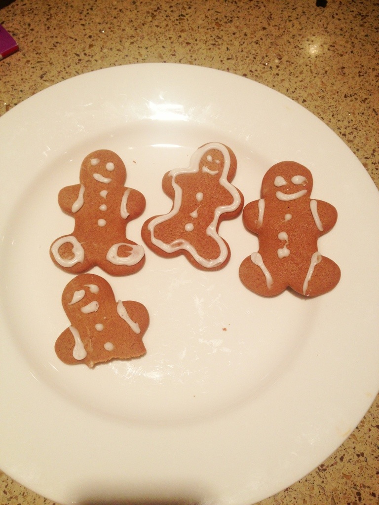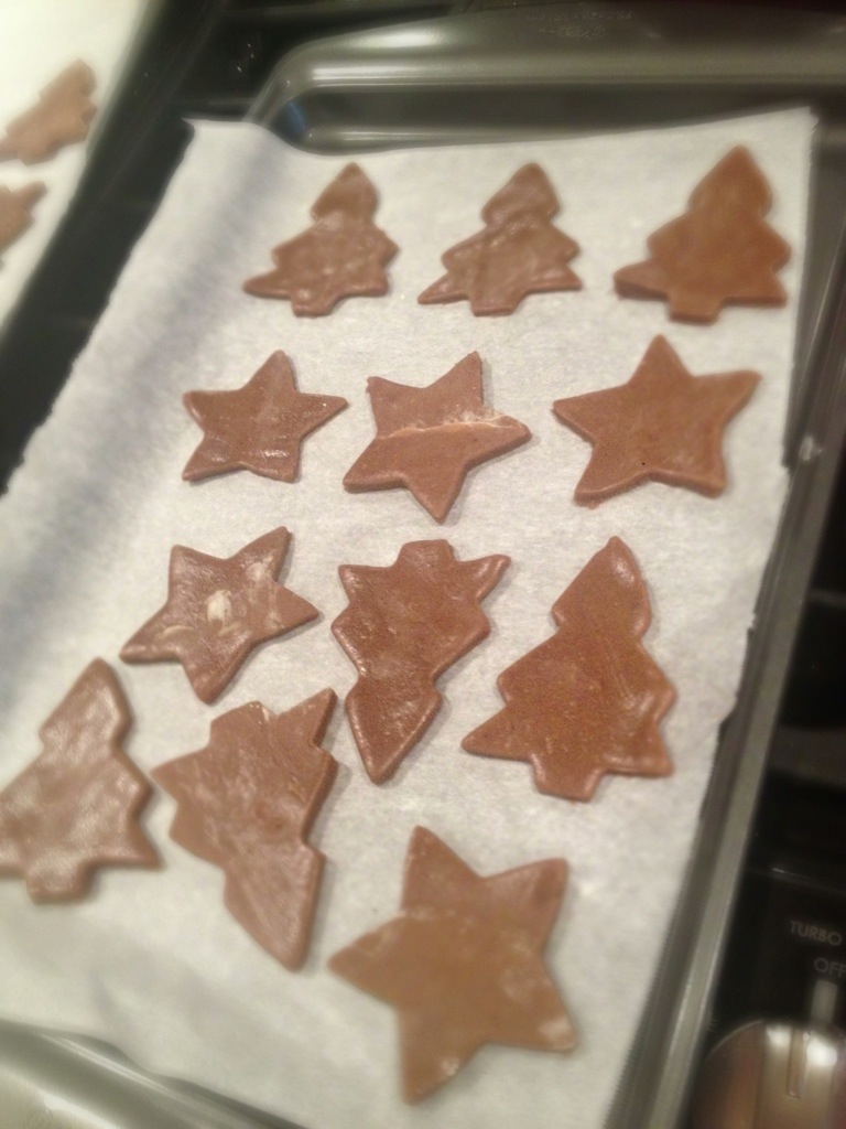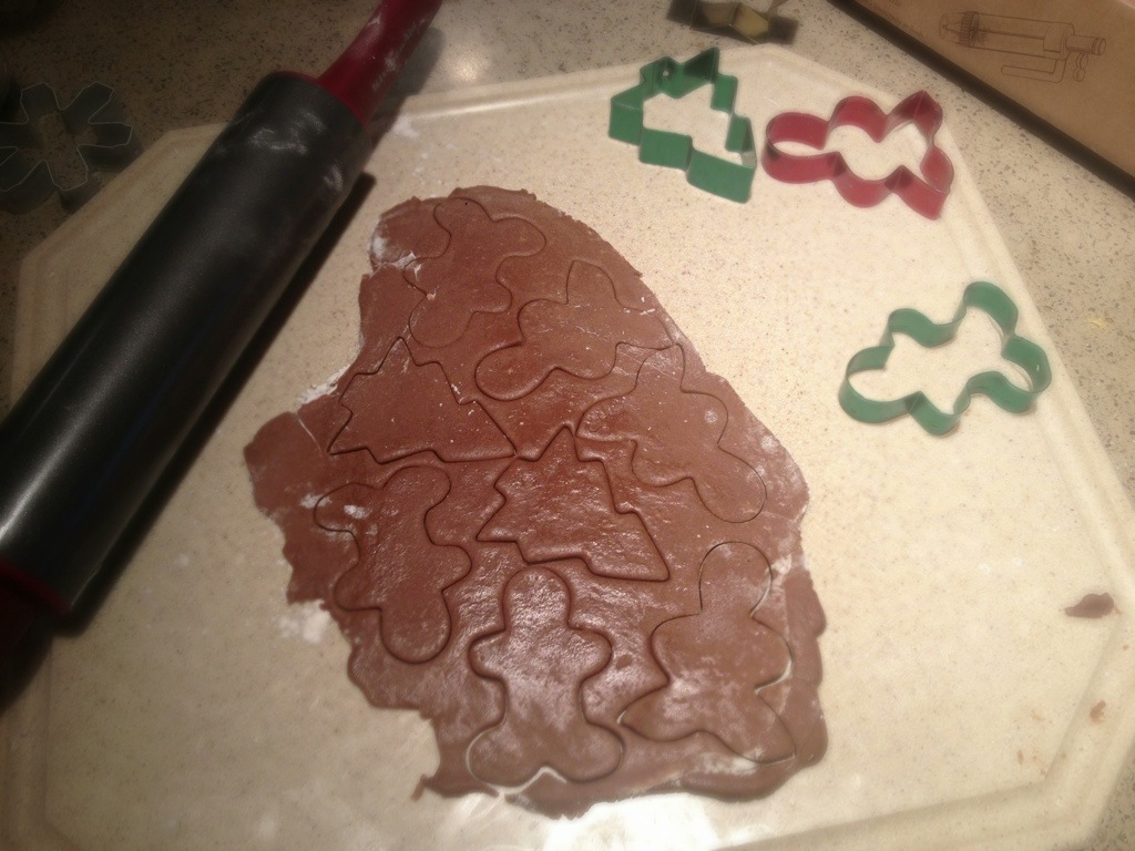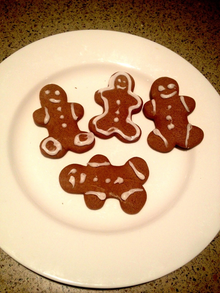 The secret to perfect gingerbread that is not too mushy or too crunchy? Start with a good recipe (I used the one from Real Simple’s website). Turn your oven down a bit from what it calls for (since mine is convection I set it to 320). Roll out your refrigerate dough and cut the shapes. Place on a parchment-lined cookie sheet and then pop the whole sheet in the freezer for five minutes before baking. Bake cookies for 9 minutes. Voila! Perfect!