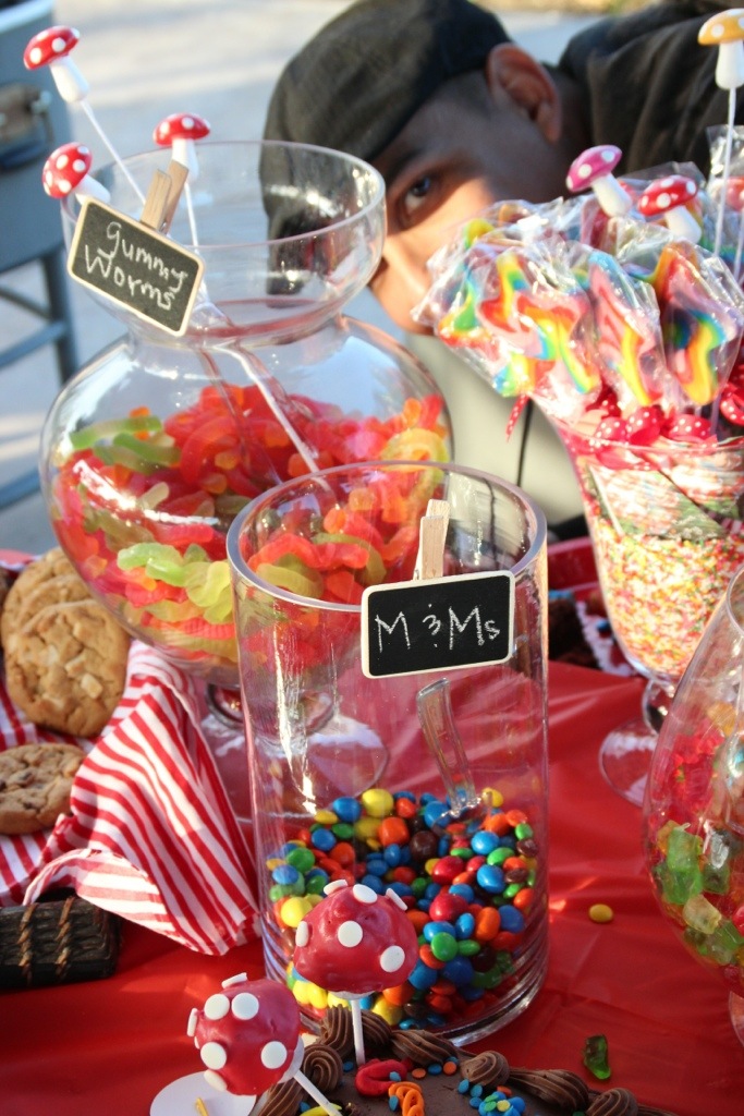 This is the back of the dessert table at the end of the party. The cupcake stand was made by Tracy and has been used so many times now! Here I edged it with red polka-dot ribbon and strands of tiny pennants that I cut from fabric and felt and strung together with baker’s twine. Various apothecary jars hold colorful candies. The cupcakes are funfetti (my favorite, and so festive) topped with homemade vanilla buttercream. The cupcake “bites” are so easy to make! This was scratch-made vanilla cake spooned into tiny cupcake papers which just sit on a cookie sheet to bake (no special pan necessary). They are the perfect one bite dessert.