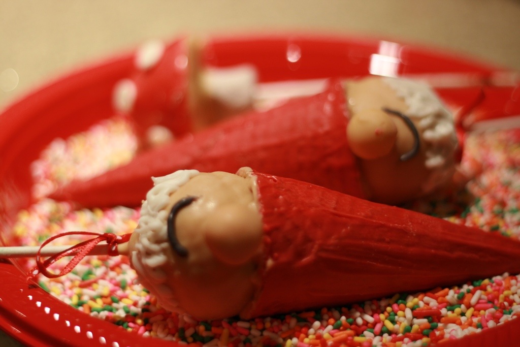 The toadstool pops have chocolate marshmallows for the base and white chocolate chips for the dots. The gnomes’ hats are small ice cream cones coated in colored white chocolate.