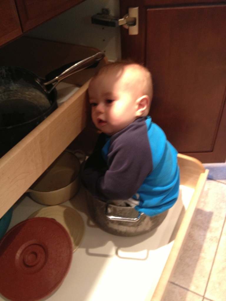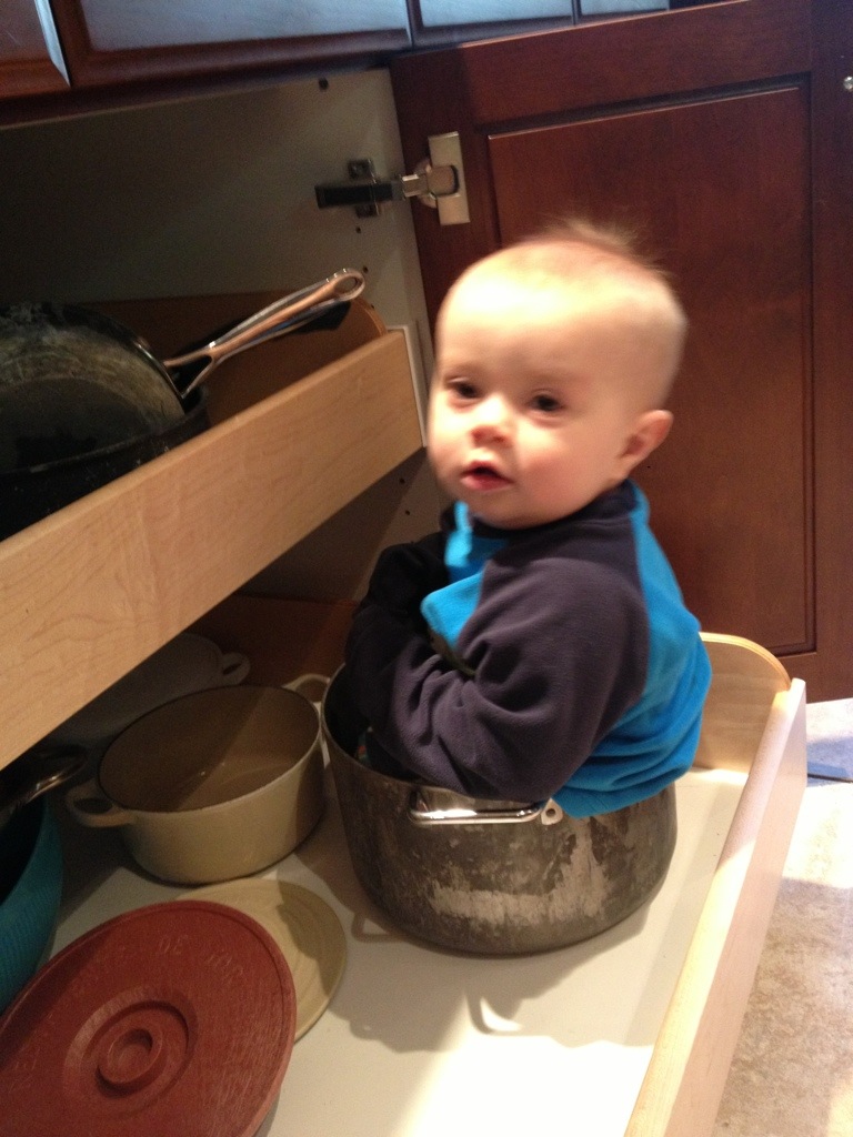 I was cooking and Jacob opened a cabinet, slid out the drawer, and climbed into the drawer and then a large stock pot. Hehe.