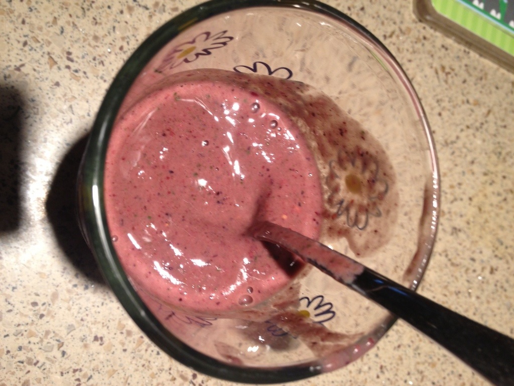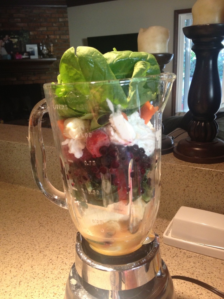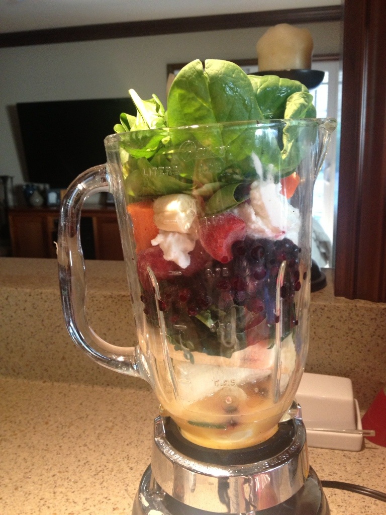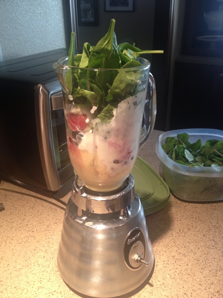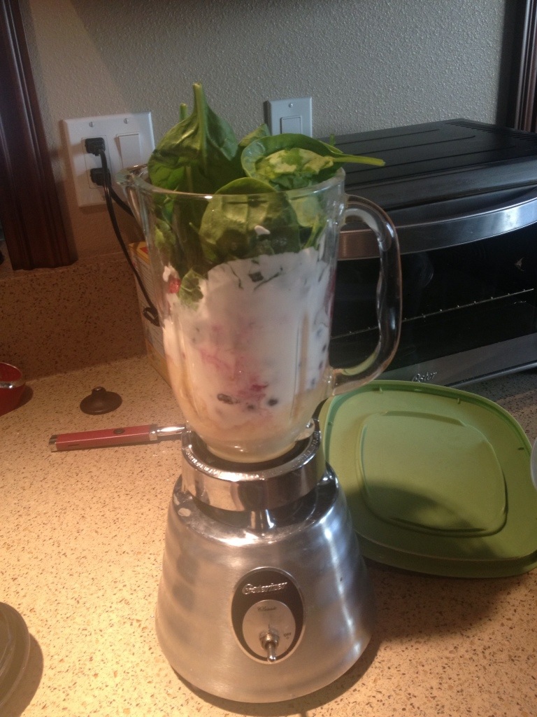 You will fill your blender without ice, so blend it a bit to make room. The greens condense really quickly. As with everything, I don’t measure, so the color varies from a deep purple to a swampy green or even brown. I’ll show you the color variation in pictures. I squeeze my own orange juice most of the time from the oranges that grow in my yard. I wash and dry the spinach and store a bunch in the produce saver box you’ll see below so it’s ready to go. You can add more yogurt for a creamier smoothie, or leave it out for a stronger fruit taste.