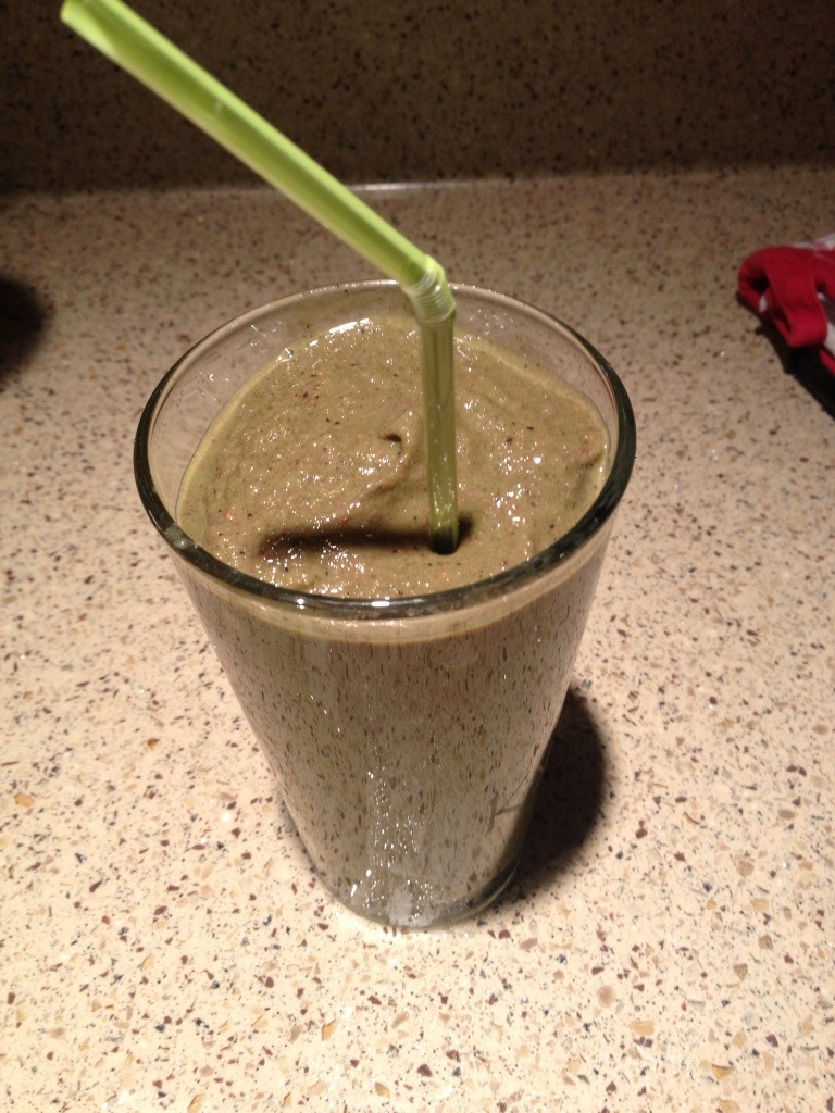 That would be exciting except that it is hard to get as many veggies in his diet when things have to be baby-appropriate finger foods (which he throws half of). A lot of prep time goes into shopping for, preparing, and trying to get him to eat healthy foods, and I was getting concerned. He is still a pretty great eater, but he has his picky days. I wondered if I could purée veggies until they could be eaten through a straw, and that is where the smoothie idea came from. I make this in the morning and we both have it for breakfast. I put Jacob’s in a straw cup and he will drain it!