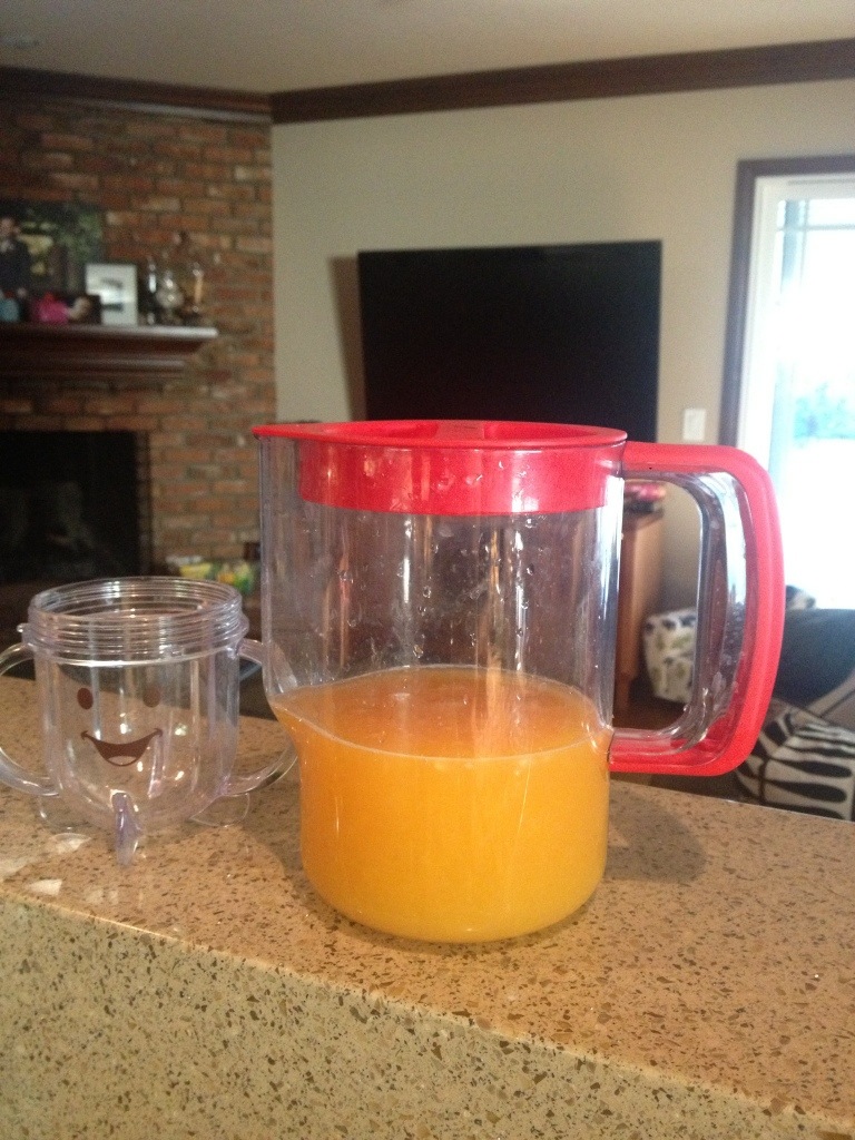 I put this picture in to show you how much orange juice I make from 6 oranges. It’s quite a lot! And it has a strong flavor.