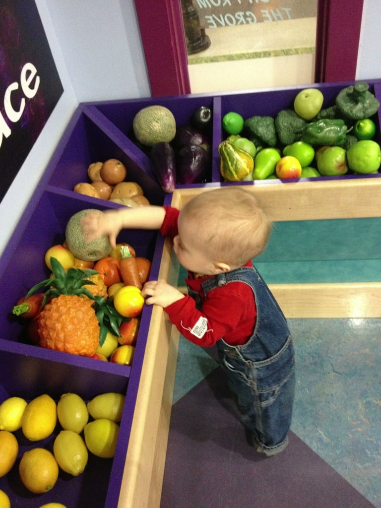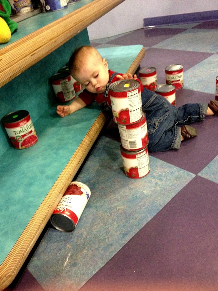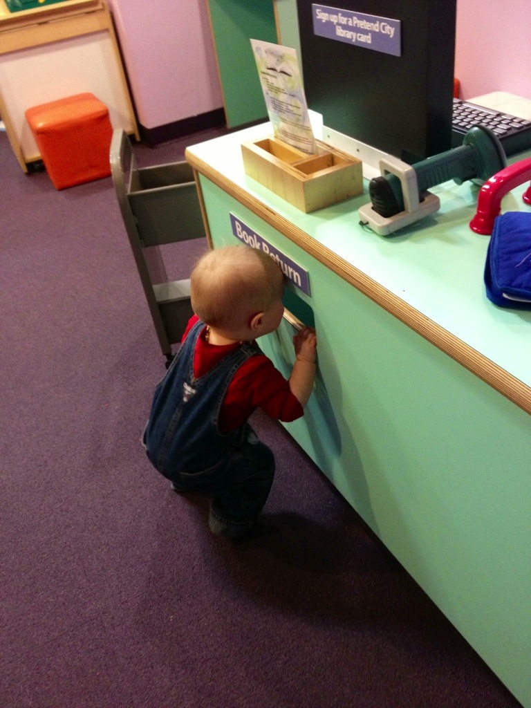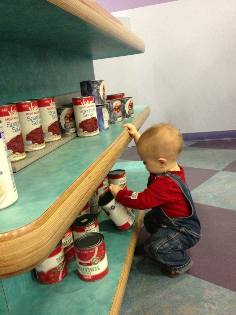 Jacob and I went to Pretend City yesterday and it was so neat!! It has a bank, fire station, restaurant, farm, house, and other “grown up” structures where kids can play. He loved unpacking the grocery store shelves and stacking and reloading items. He also loved sitting in the play cars and turning the steering wheel (big surprise there!). It was so great to see him moving around and exploring independently. He didn’t need me there at all! I followed him around to keep him out of trouble and just watched. What an interesting thought process he has! It was amazing to see him experience this place. He could play with everything–the toilet and bathtub in the house, the big model teeth and huge toothbrush in the dentist’s office…all the drawers are packed with relevant and safe items and he was in heaven finding them and taking them out.