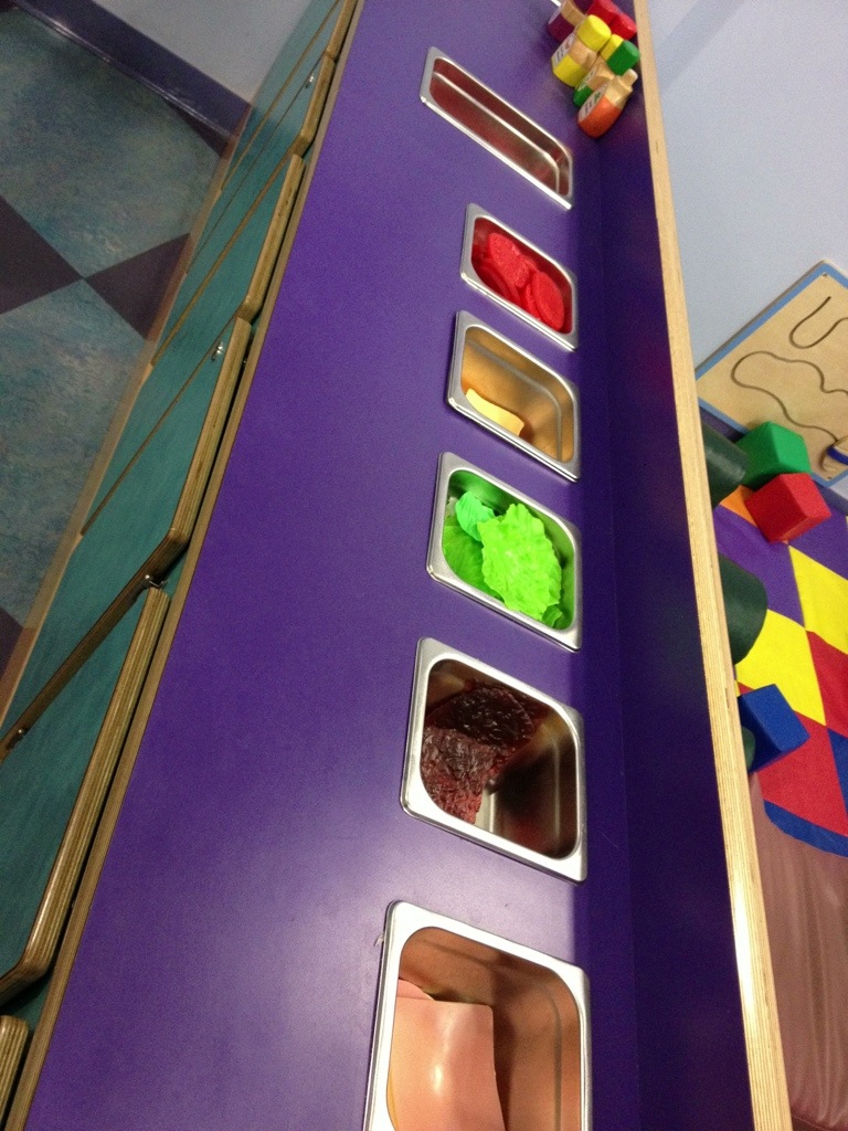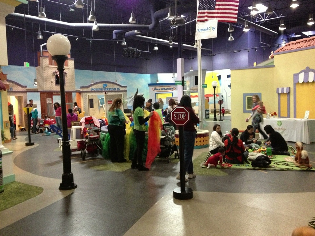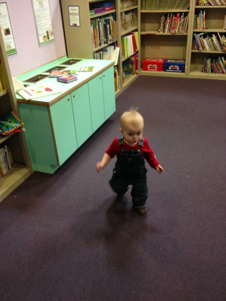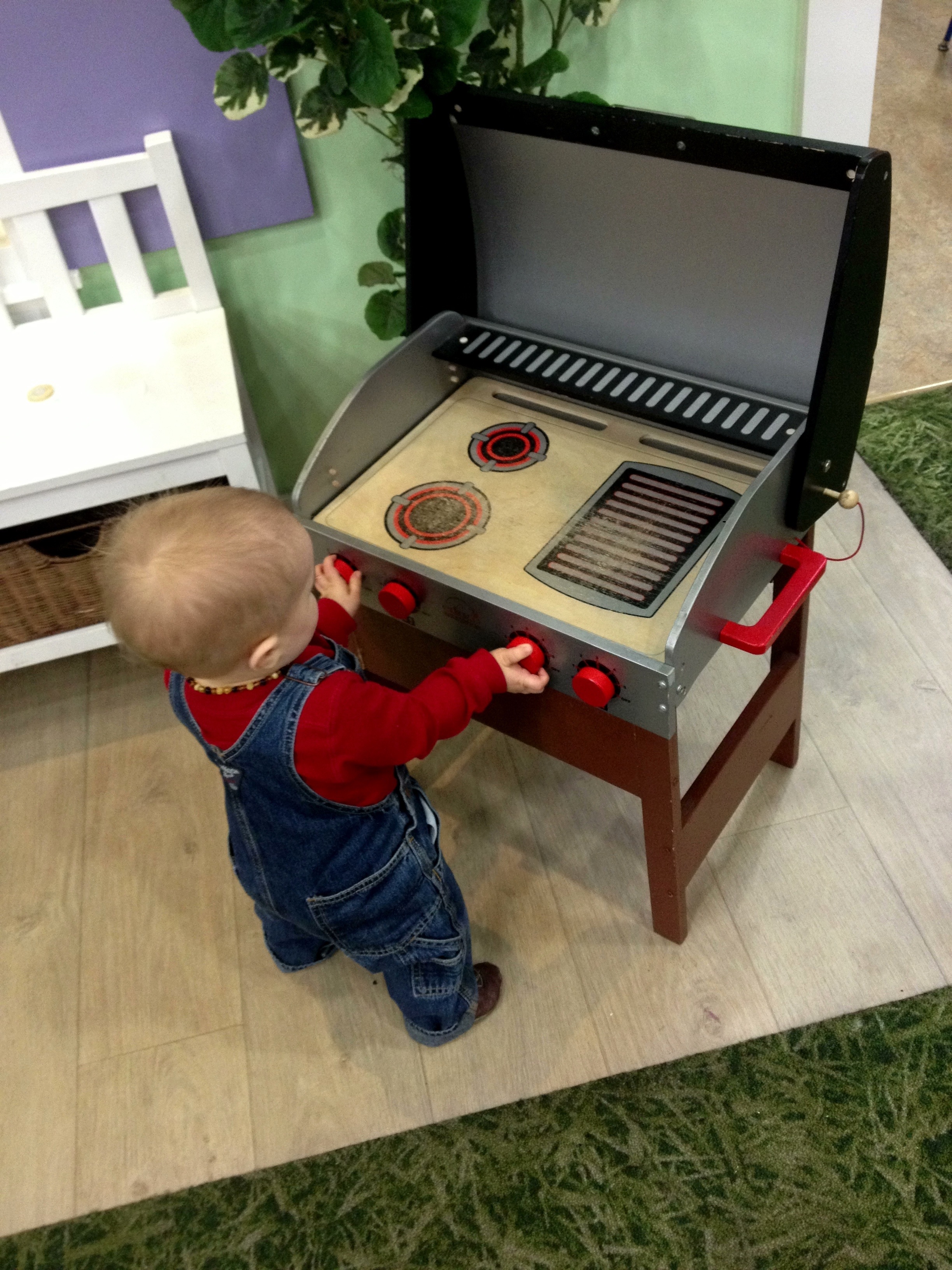Jacob and I went to Pretend City yesterday and it was so neat!! It has a bank, fire station, restaurant, farm, house, and other “grown up” structures where kids can play. He loved unpacking the grocery store shelves and stacking and reloading items. He also loved sitting in the play cars and turning the steering wheel (big surprise there!). It was so great to see him moving around and exploring independently. He didn’t need me there at all! I followed him around to keep him out of trouble and just watched. What an interesting thought process he has! It was amazing to see him experience this place. He could play with everything–the toilet and bathtub in the house, the big model teeth and huge toothbrush in the dentist’s office…all the drawers are packed with relevant and safe items and he was in heaven finding them and taking them out.