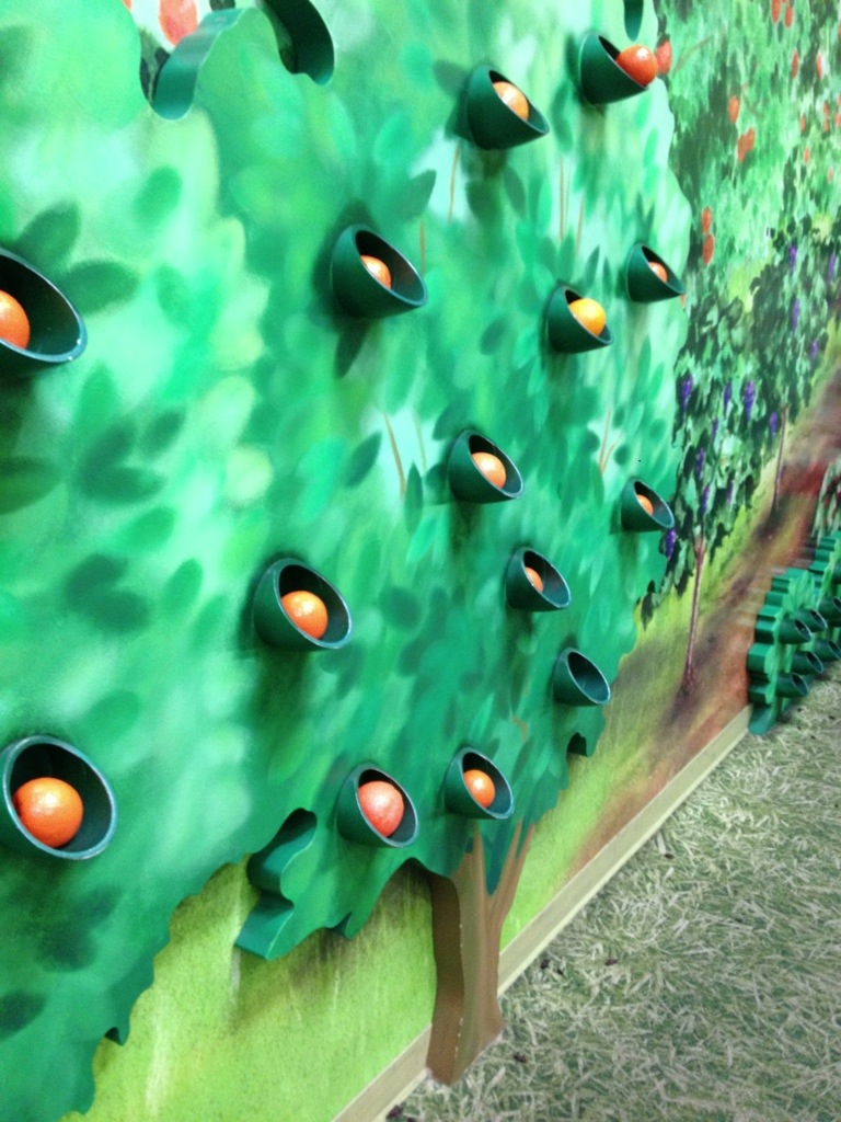 I really geeked out over the farm with its planters full of rubber mulch “dirt” and faux veggies, trees holding oranges and apples, and incubator with live chicks. There is so much going on here!