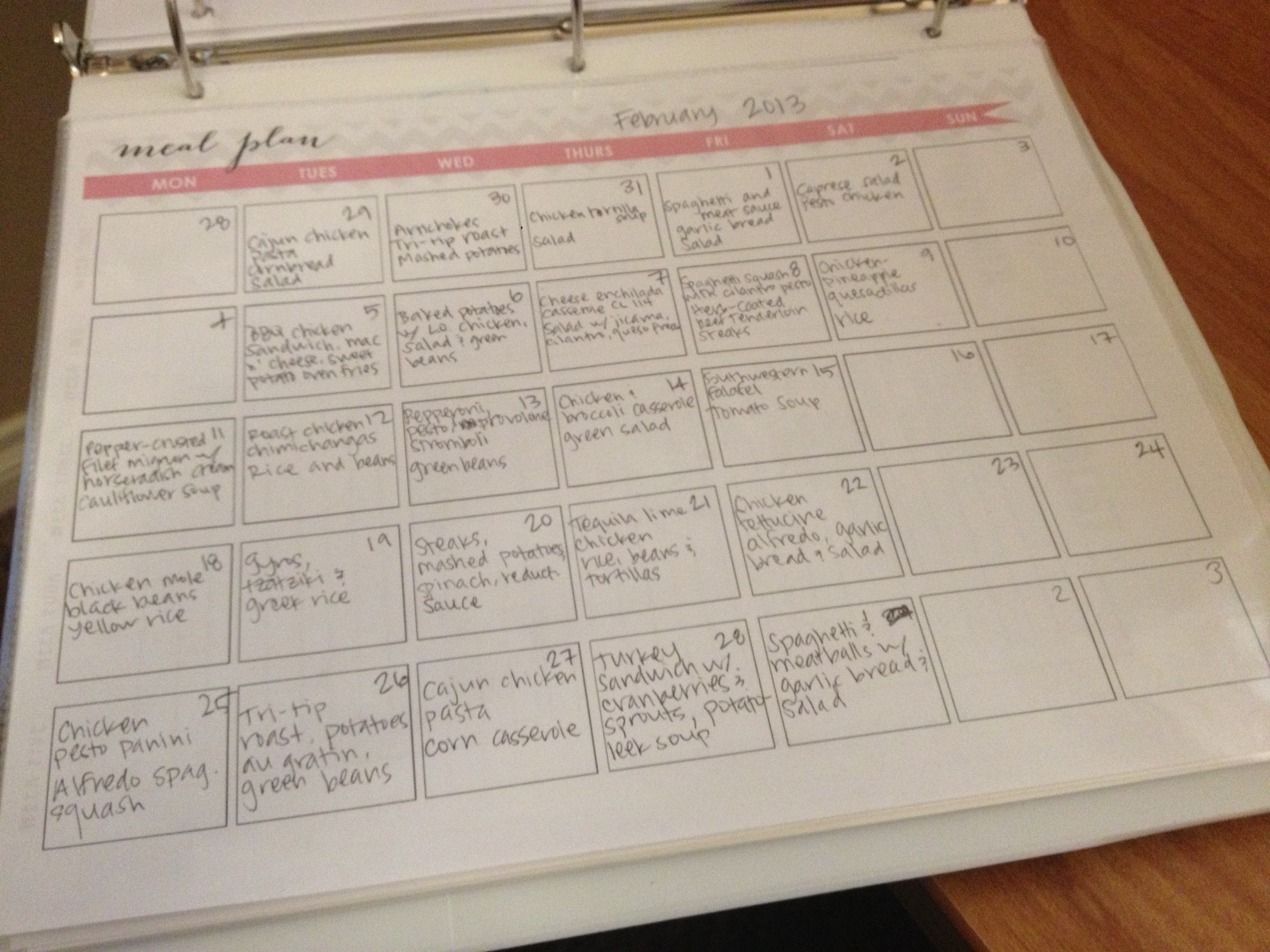 Toward the end of the monthly calendar I did fill some gaps with meals that were planned in the weeks before, but this is fine. There are weeks that we do not eat as many meals as I have planned for. This happens, and we adjust. You may be wondering how many meals per week. I plan five. This assumes that twice per week we will either eat out, eat at someone else’s house, or just be inundated with leftovers that we want to make sure and consume. If a lot of plans come up in a week I will circle a meal and its ingredients and wait to see if I will need/want that one at the end of the week. If so, I just need to run to the store for a very few items.