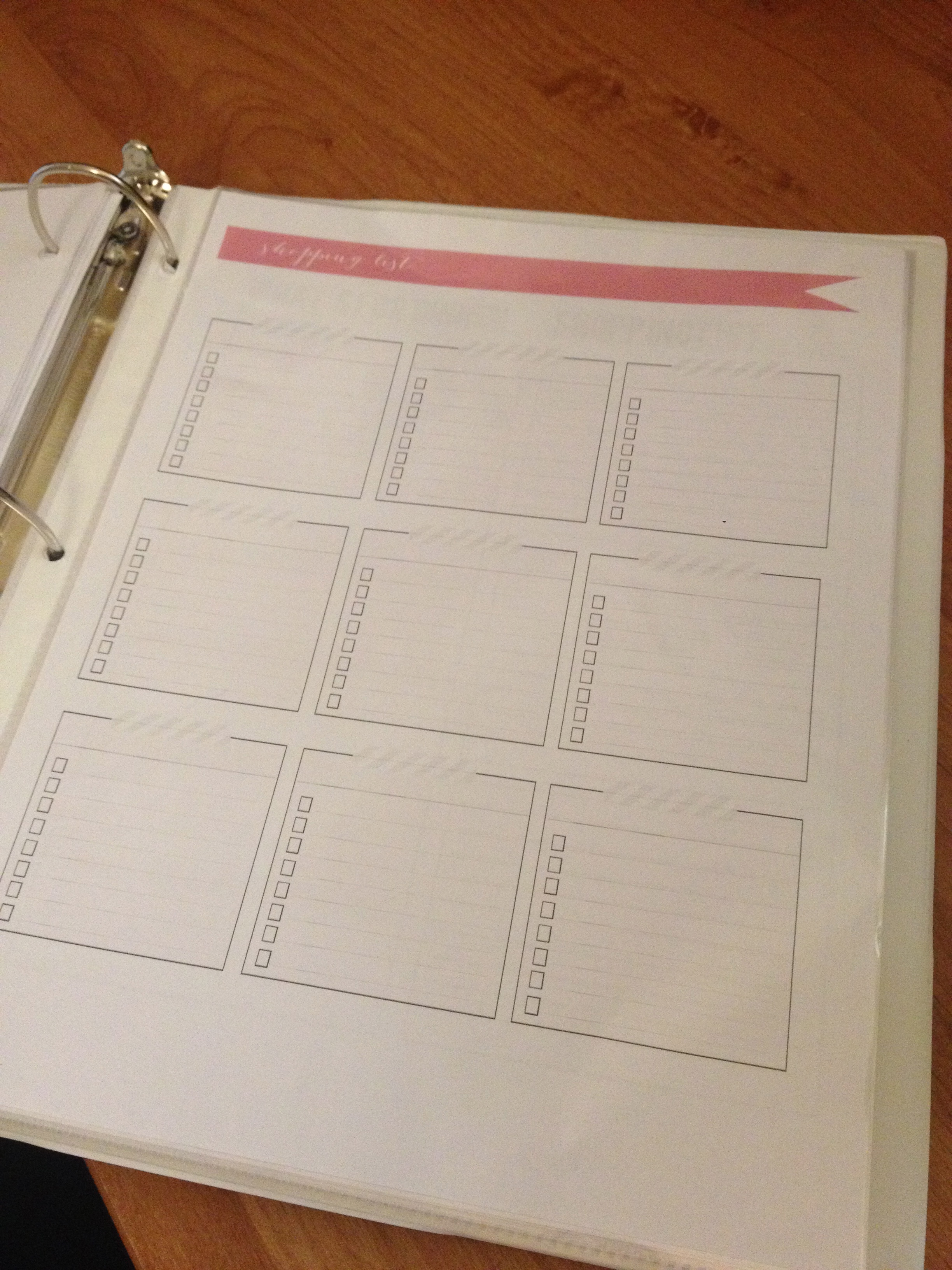 When a week starts, I pull out the weekly plan and ingredients list and a blank shopping list grid. This is a piece you probably will not want to do, however I am crazy and I like to separate the sections of the store. I do not enjoy making it to the deli/cheese aisle and having to return to produce! (Oh the horror!)
