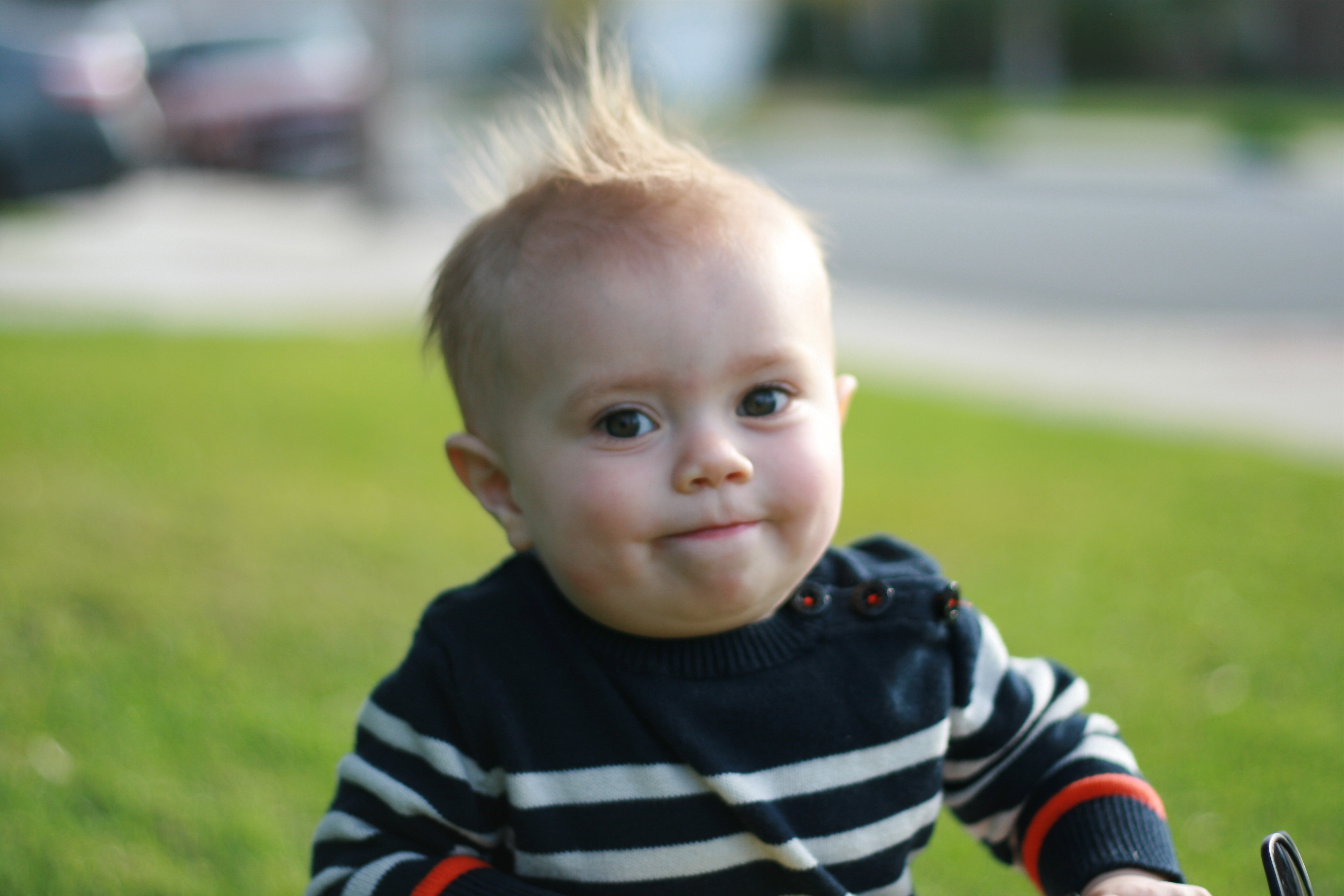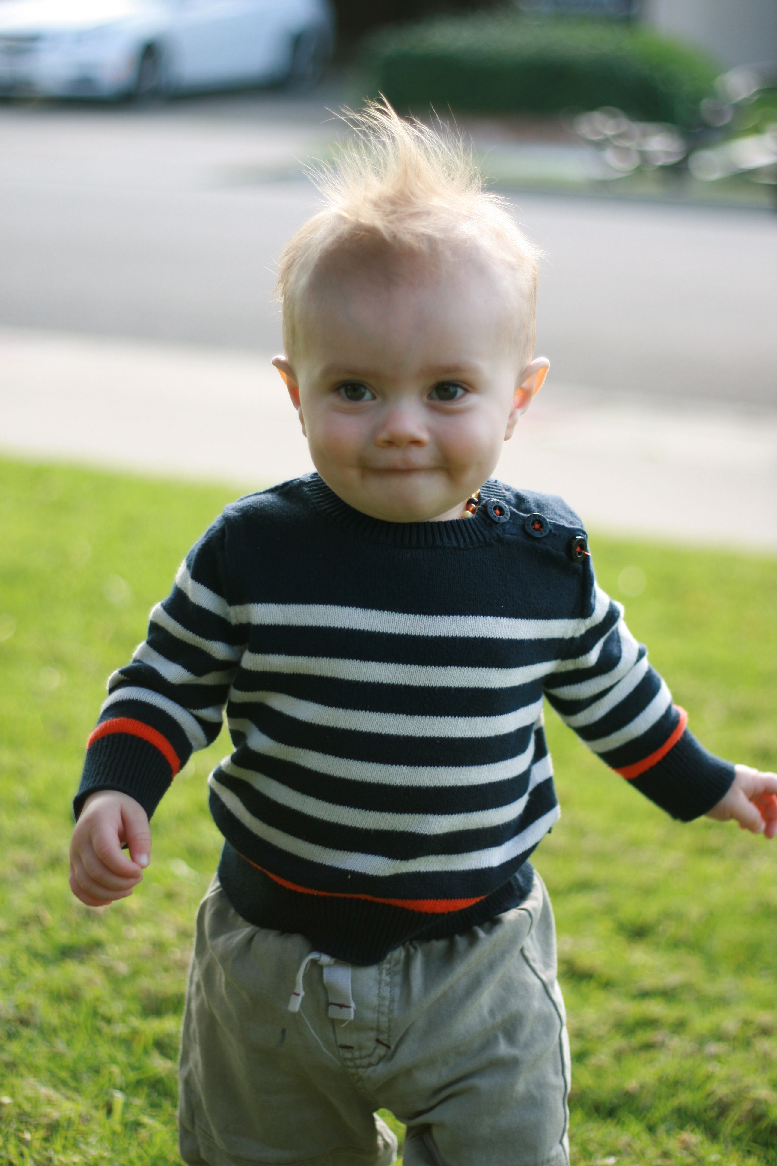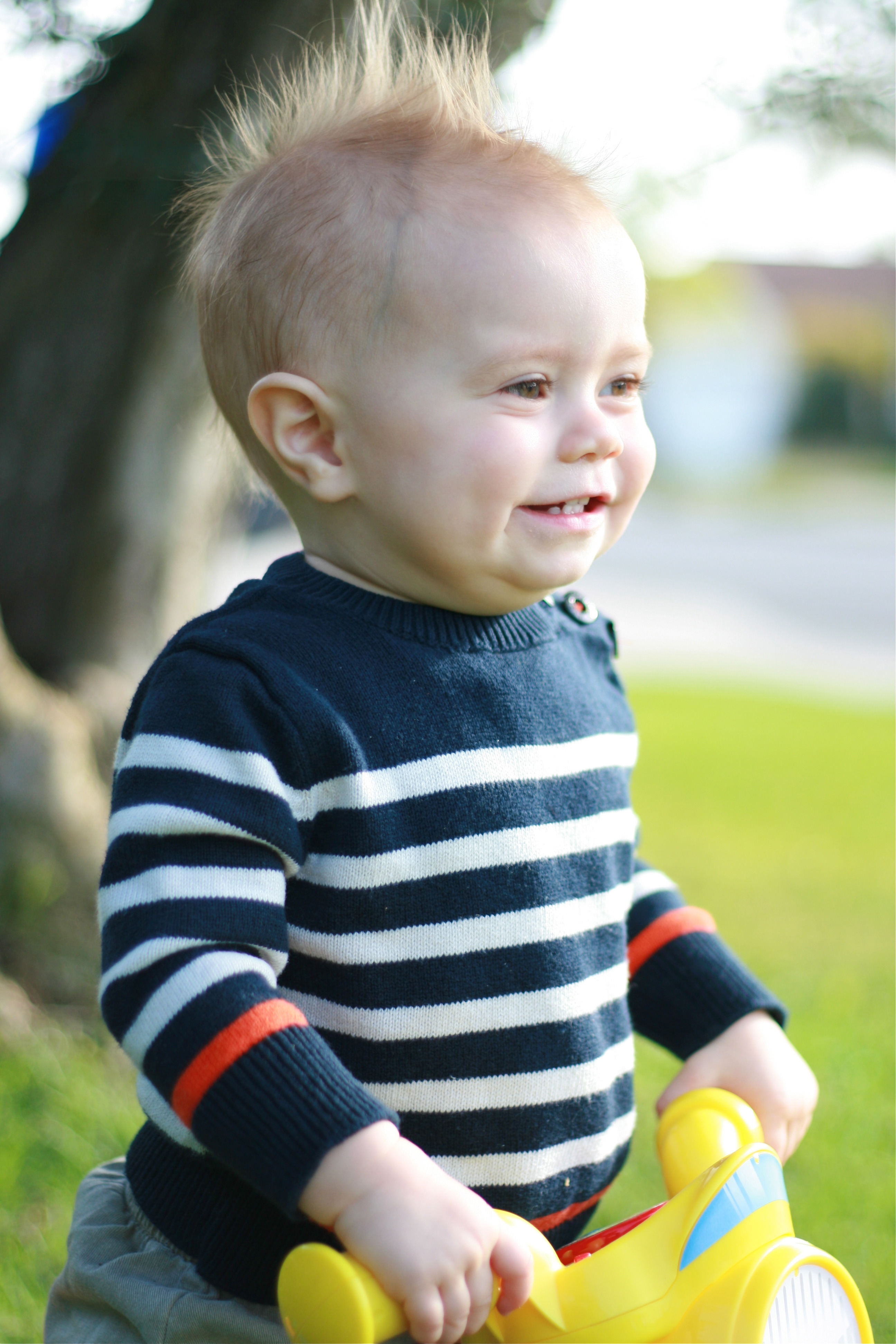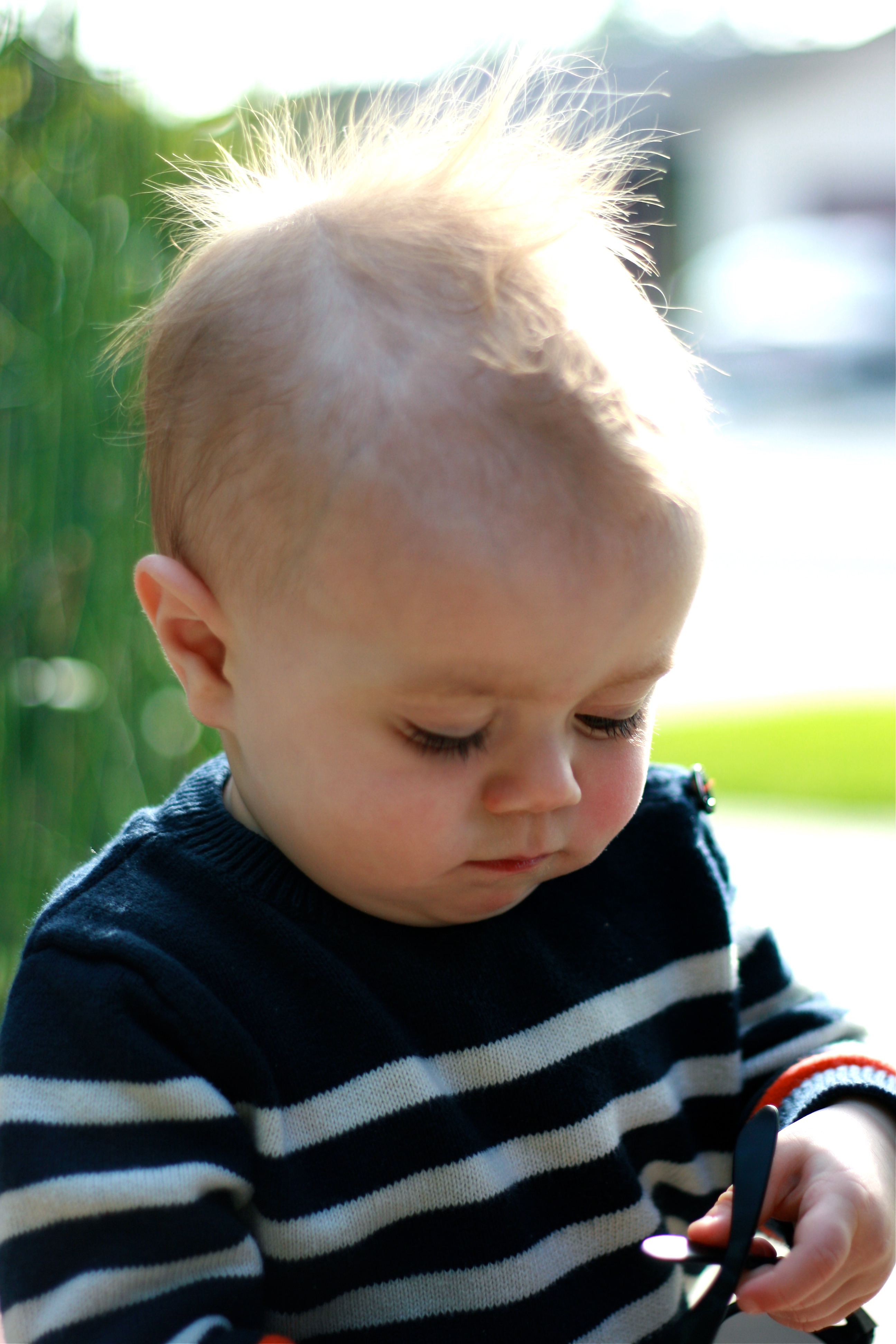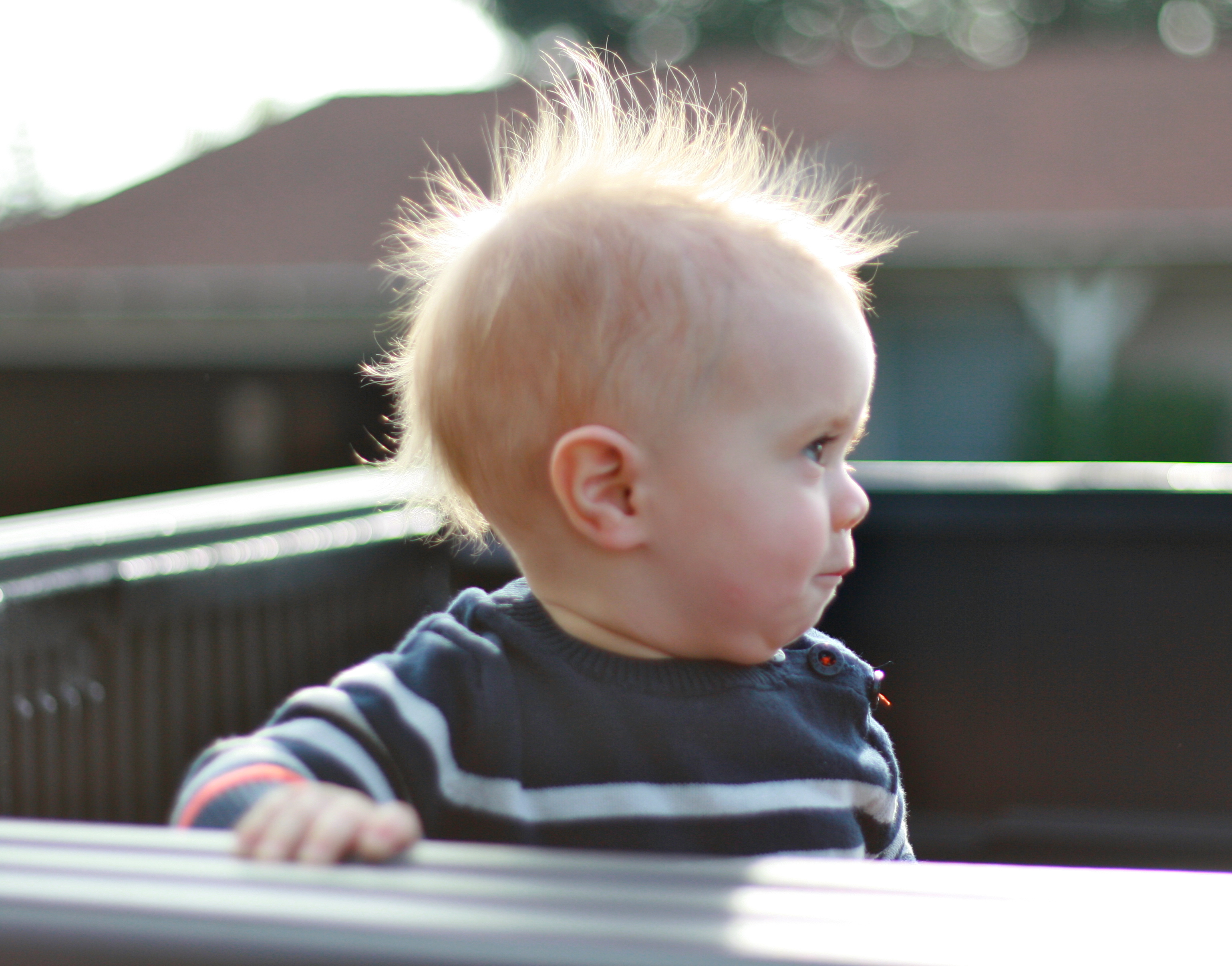 I tried to catch some “sun mohawks” to capture this very cute stage of his hair growth. It really naturally makes a mohawk. Sometimes I put lotion on his head and “style” his hair with it. My mom likes to style it into a side part which is pretty cute and funny, too. Of course he will have to mess it up as soon as possible with his hand, and then put food on his head. Because why not?