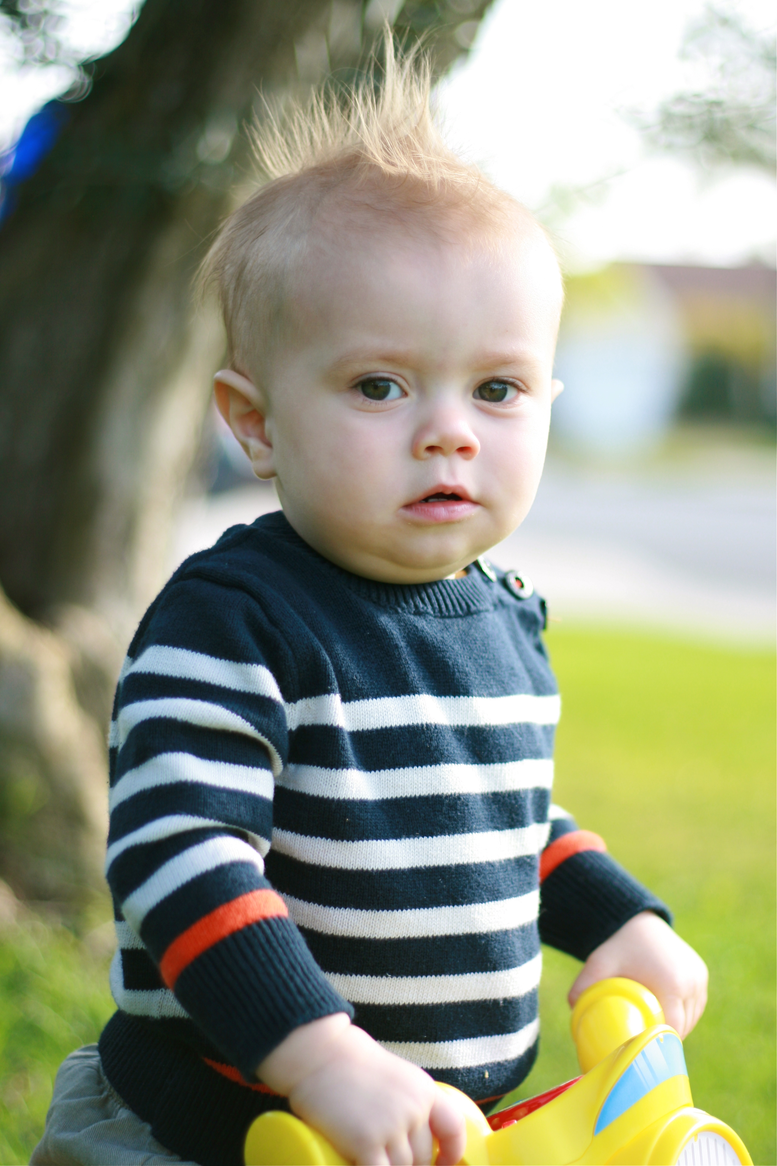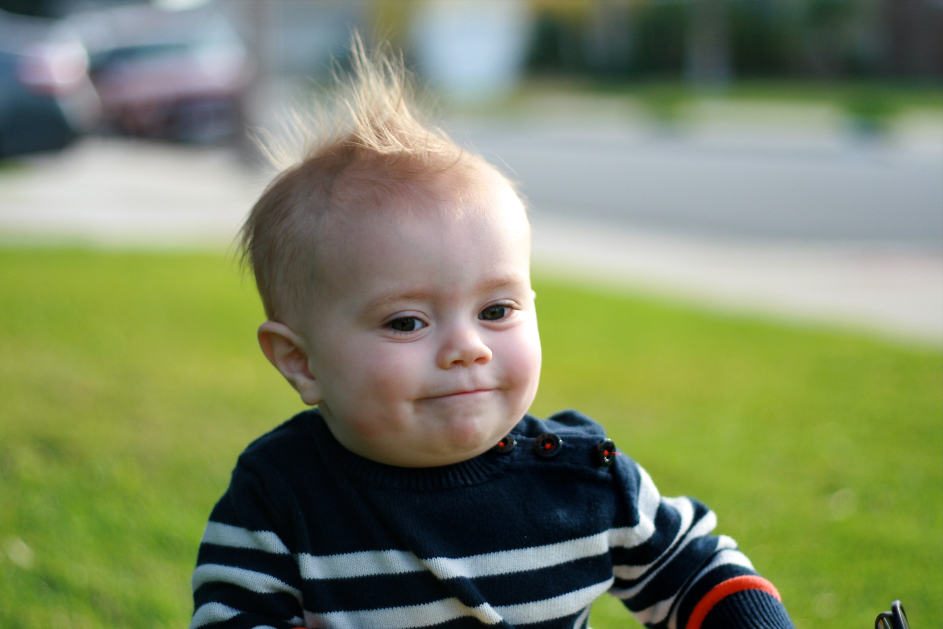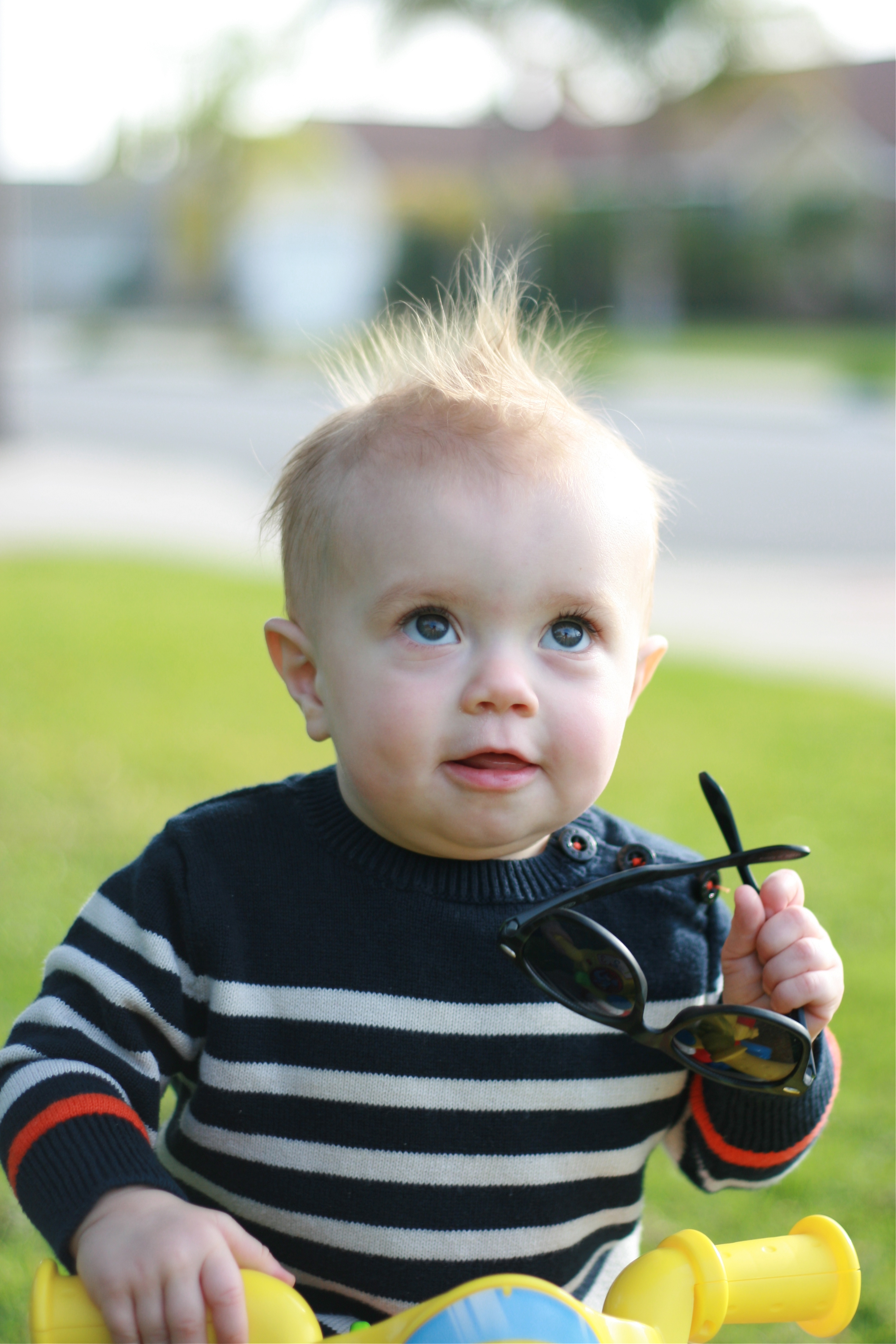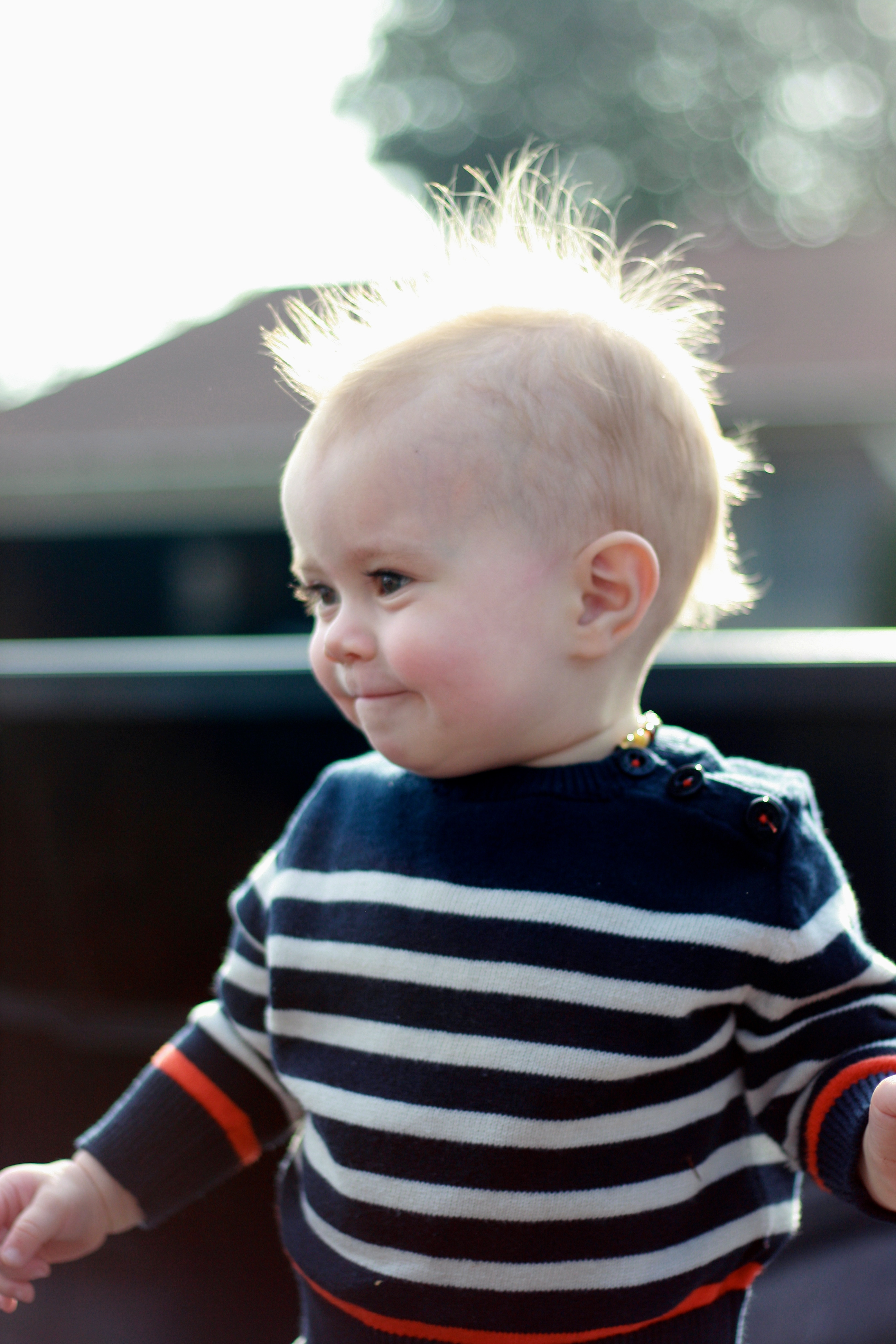 I tried to catch some “sun mohawks” to capture this very cute stage of his hair growth. It really naturally makes a mohawk. Sometimes I put lotion on his head and “style” his hair with it. My mom likes to style it into a side part which is pretty cute and funny, too. Of course he will have to mess it up as soon as possible with his hand, and then put food on his head. Because why not?