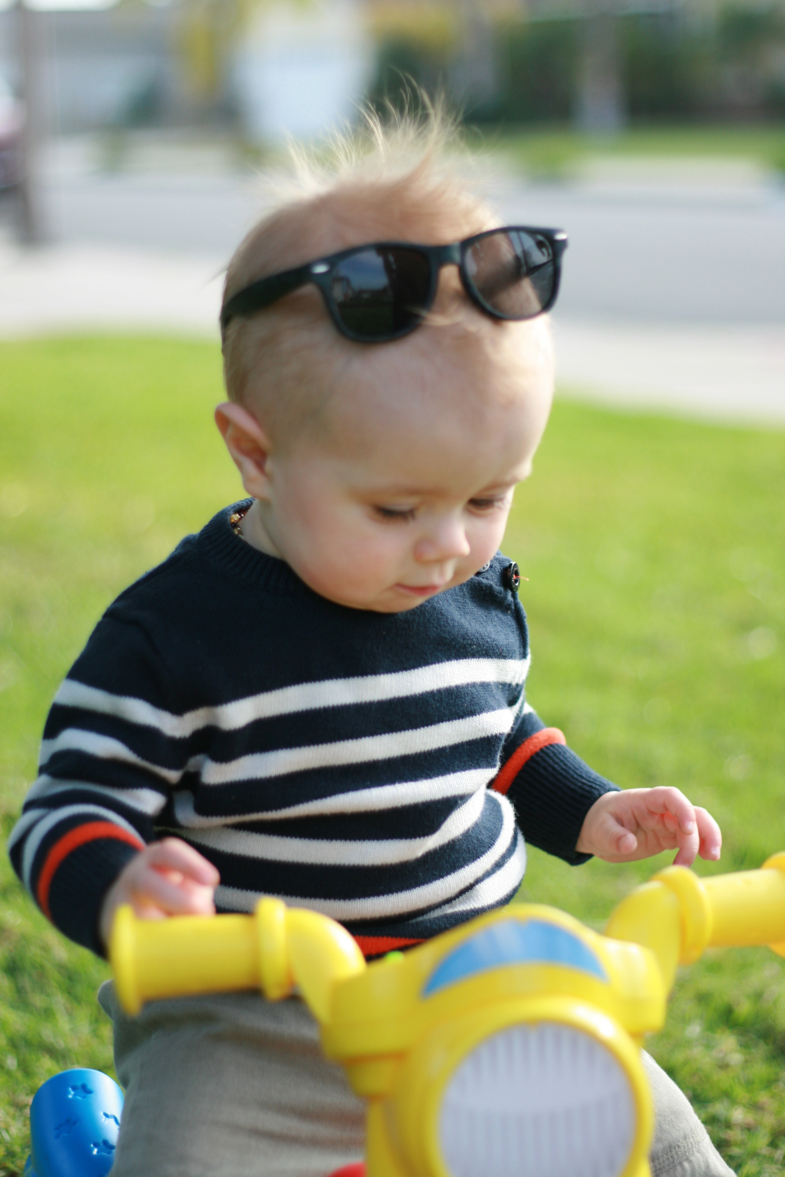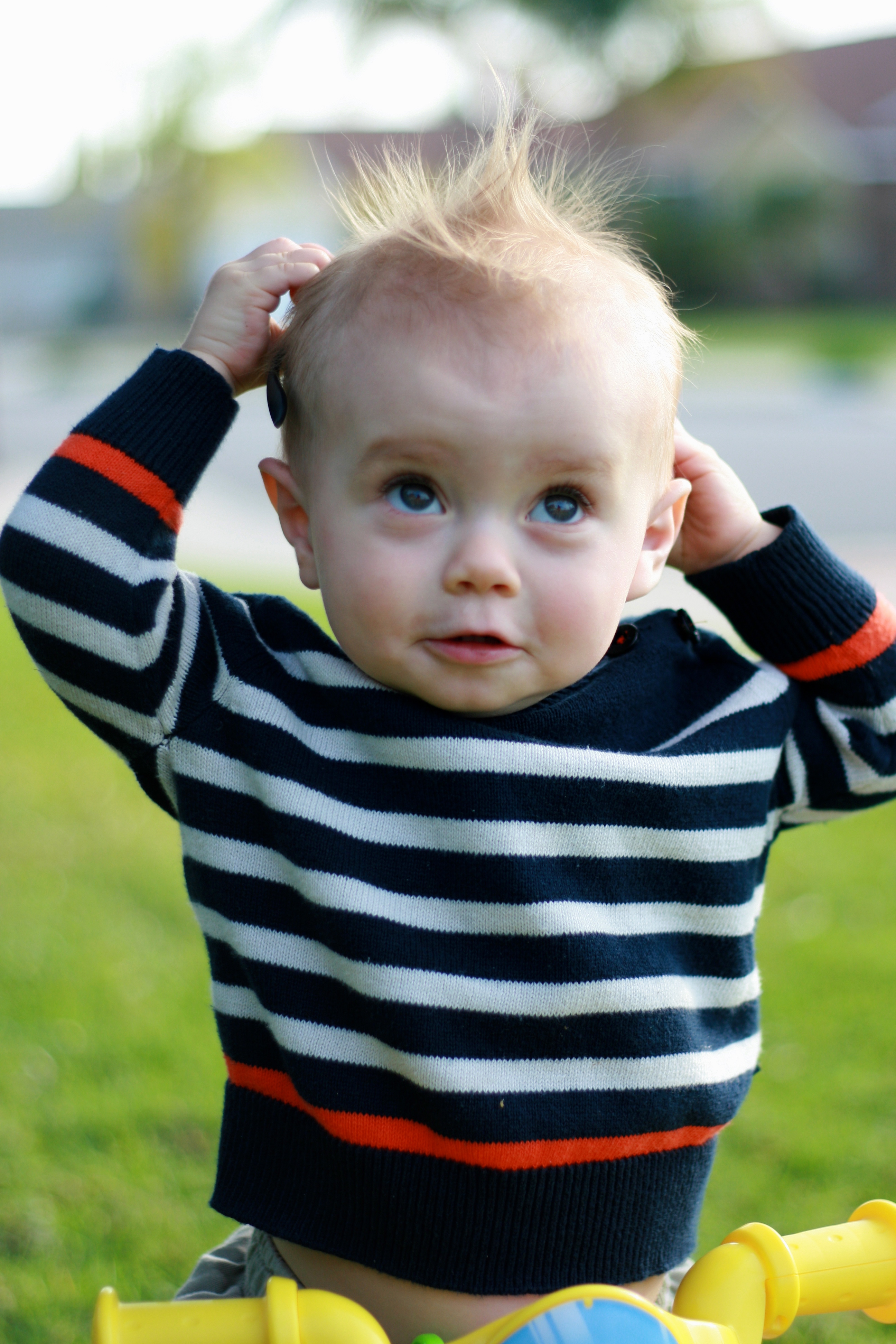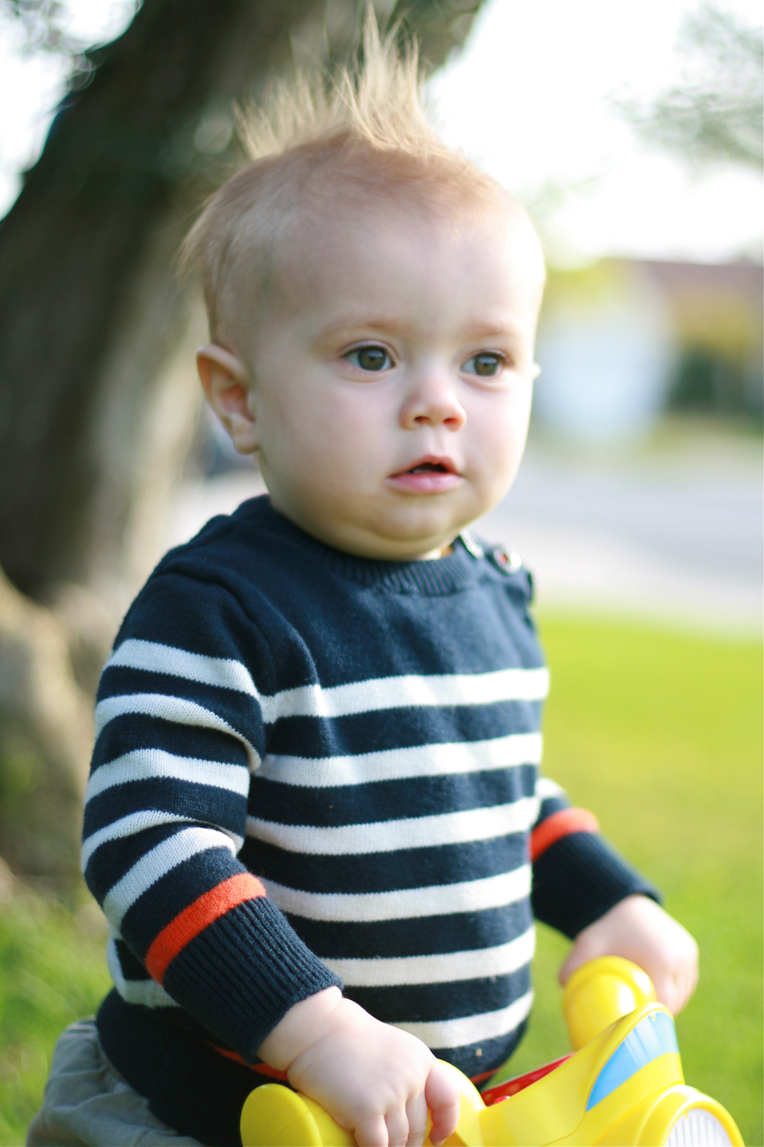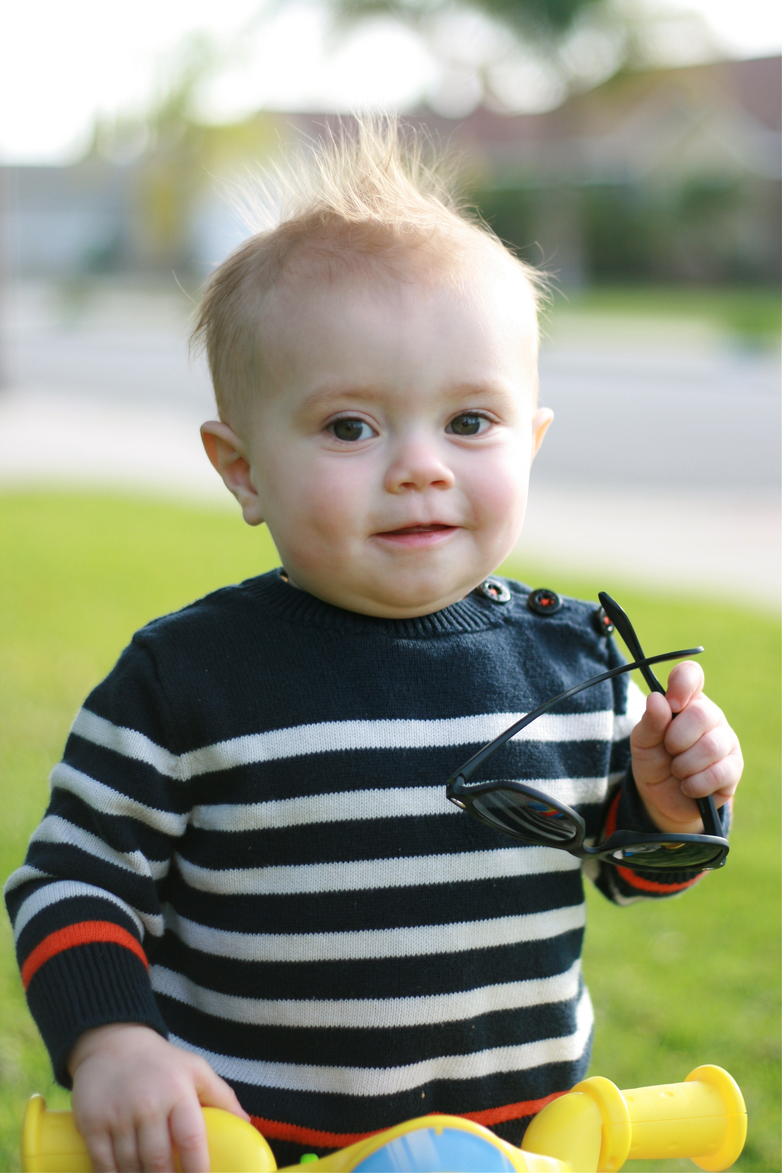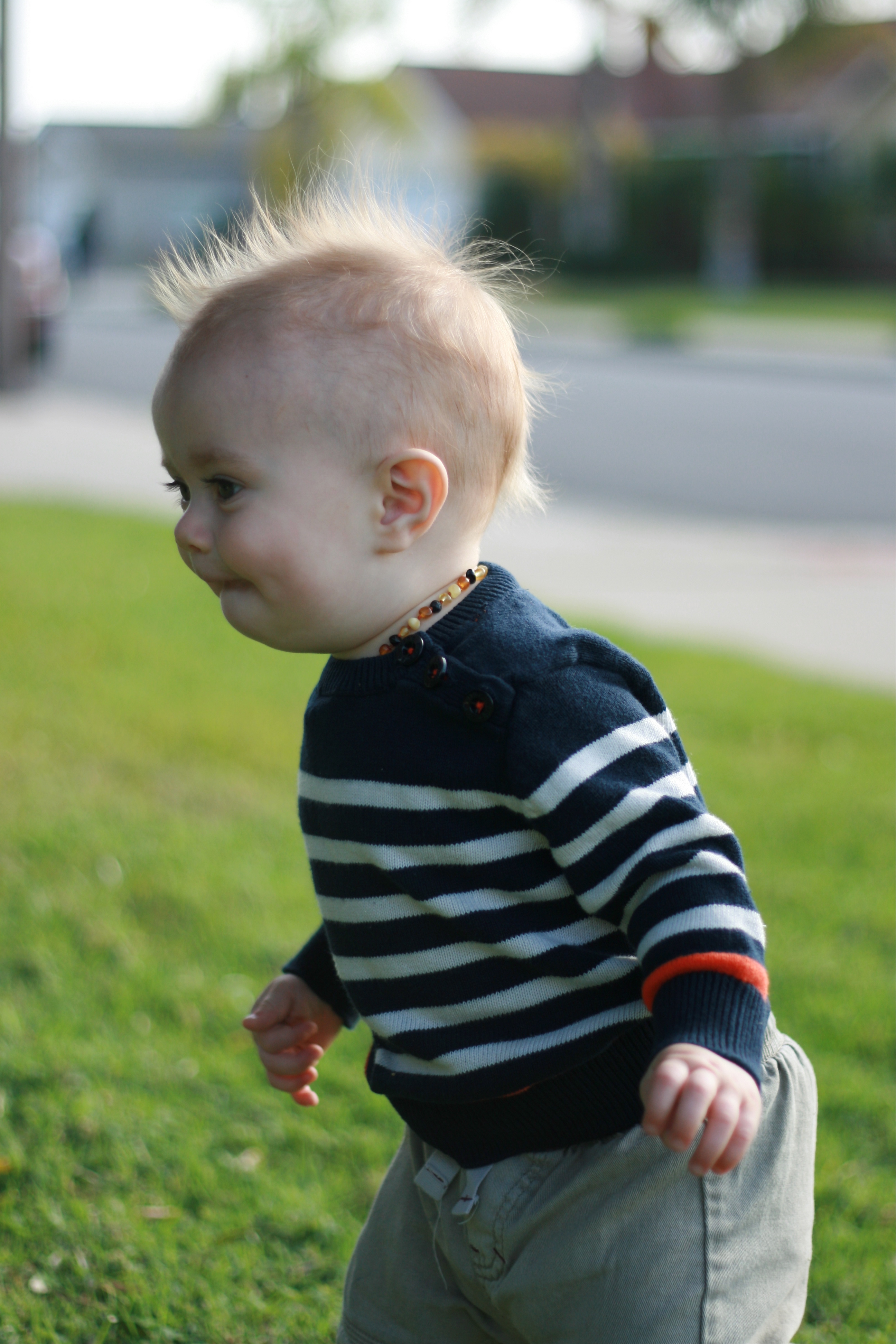 I tried to catch some “sun mohawks” to capture this very cute stage of his hair growth. It really naturally makes a mohawk. Sometimes I put lotion on his head and “style” his hair with it. My mom likes to style it into a side part which is pretty cute and funny, too. Of course he will have to mess it up as soon as possible with his hand, and then put food on his head. Because why not?