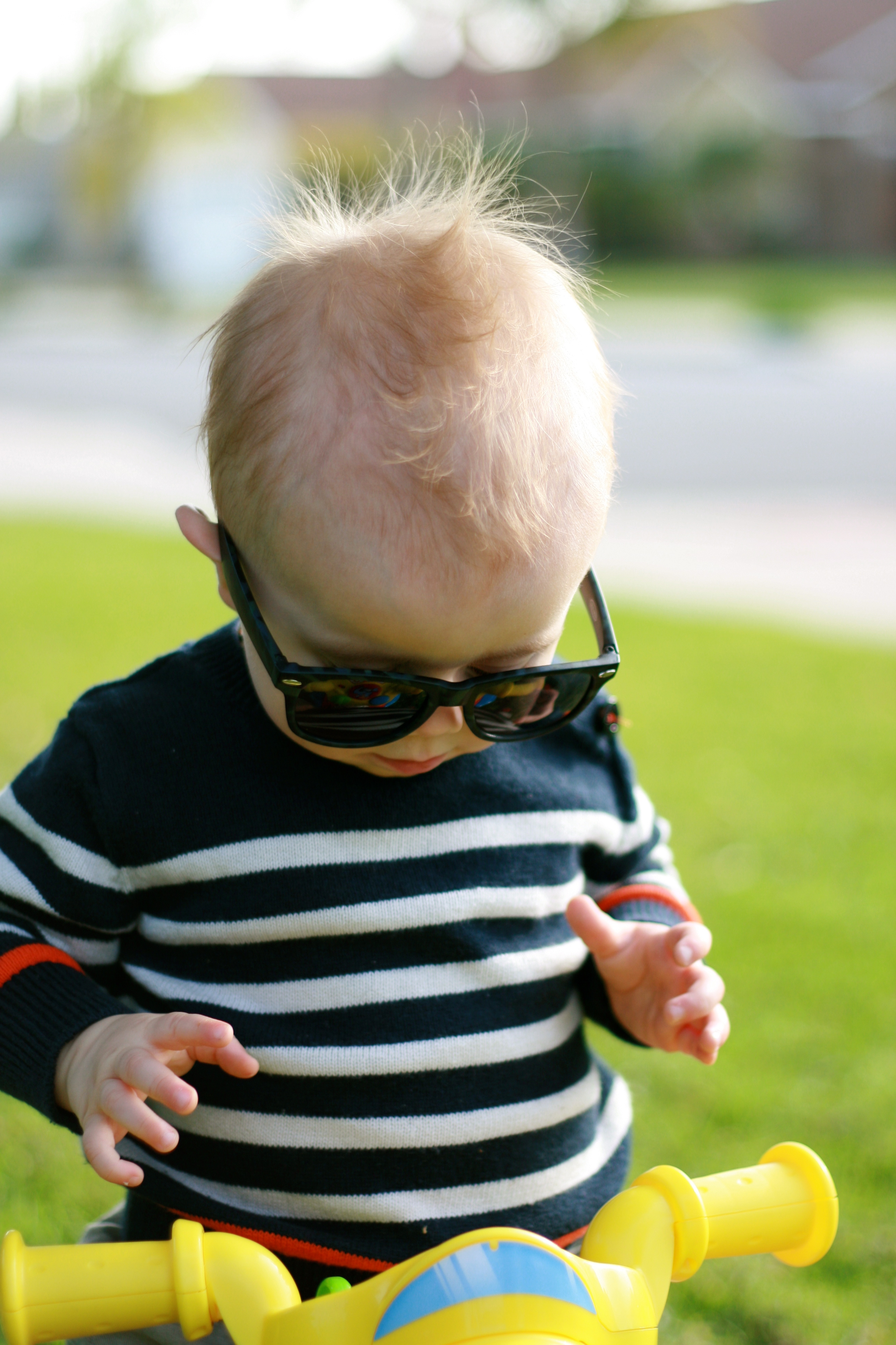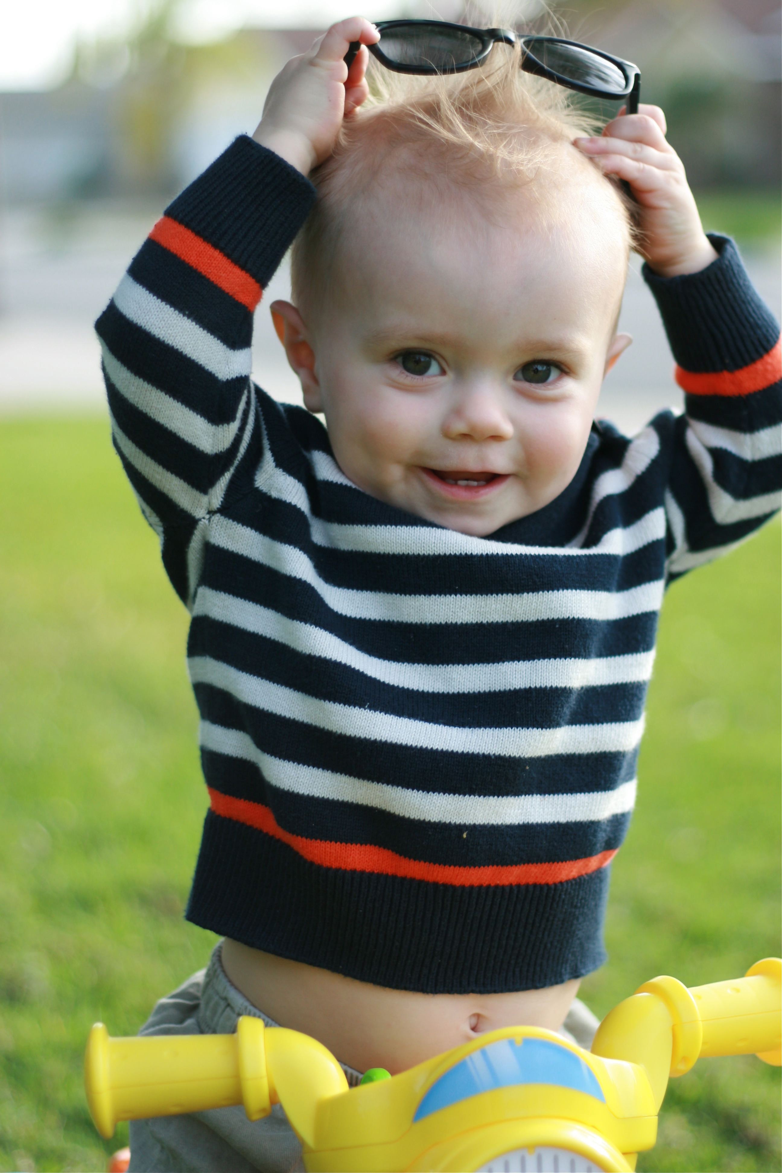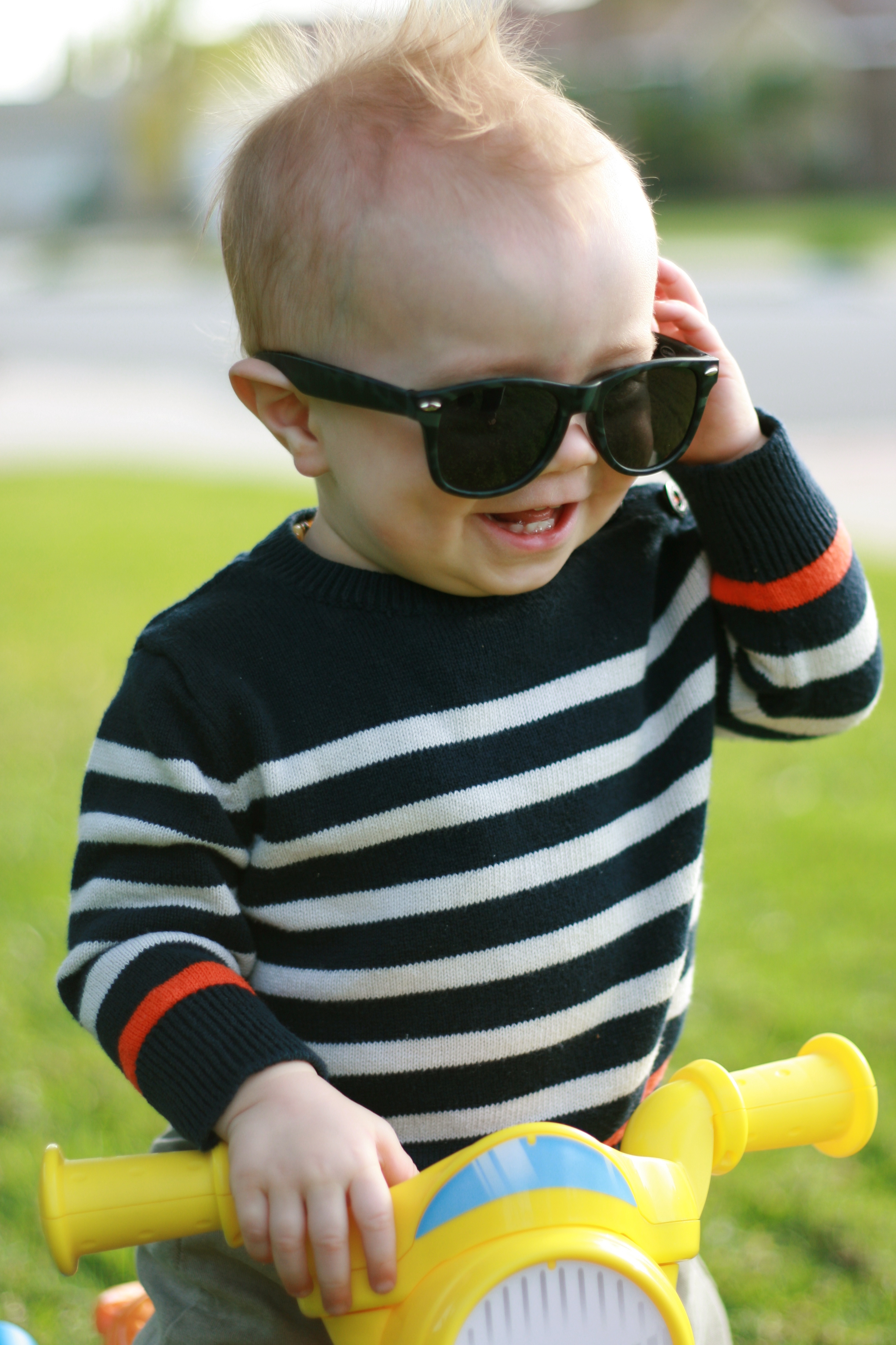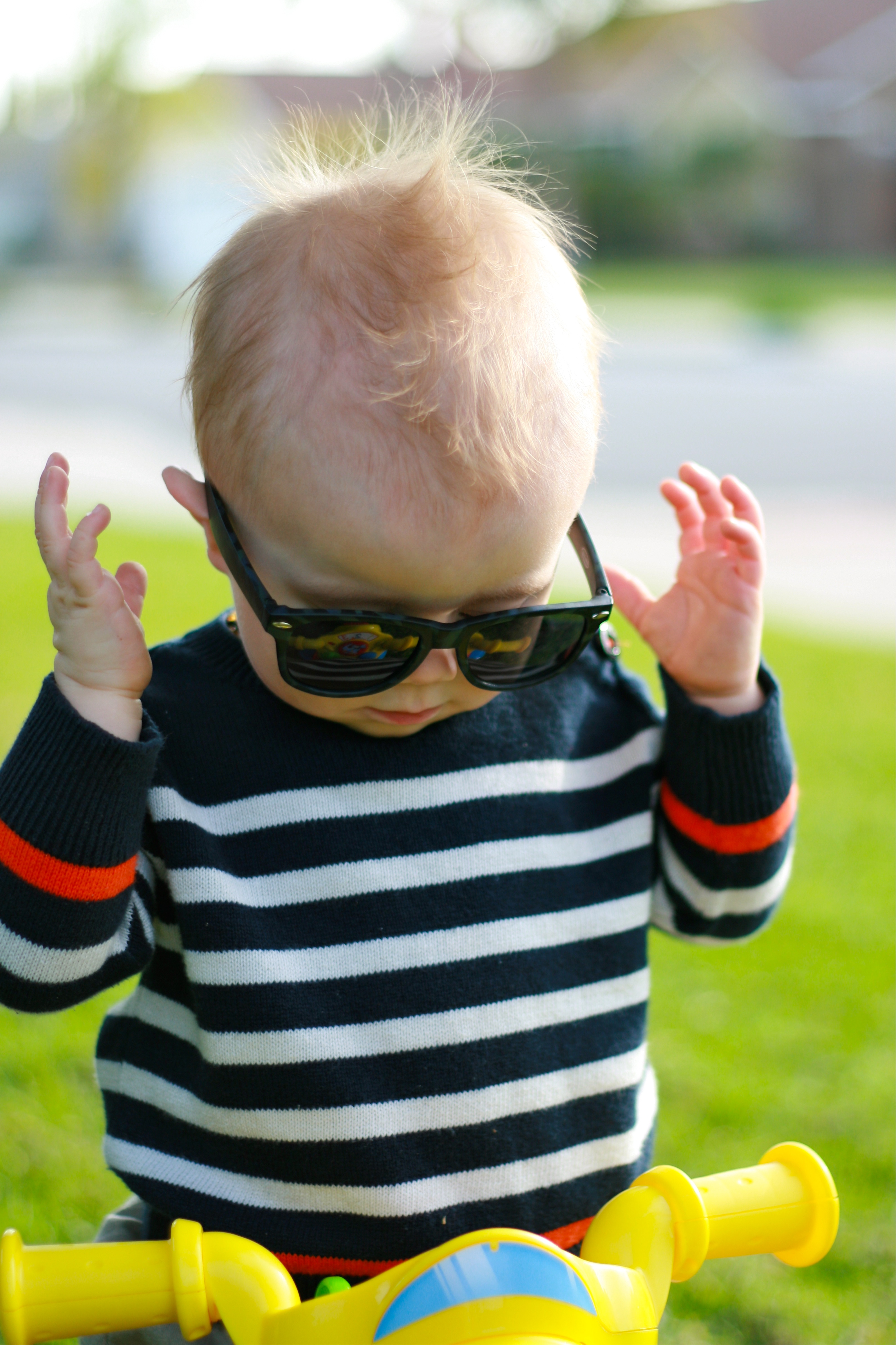 He understands where glasses go, and likes to take ours and try to put them on his face. They are always upside-down when he does. 🙂 I got these little sunglasses for him, and he loves them! Of course you can’t catch him wearing them for more than a second, because he takes them off and starts over.