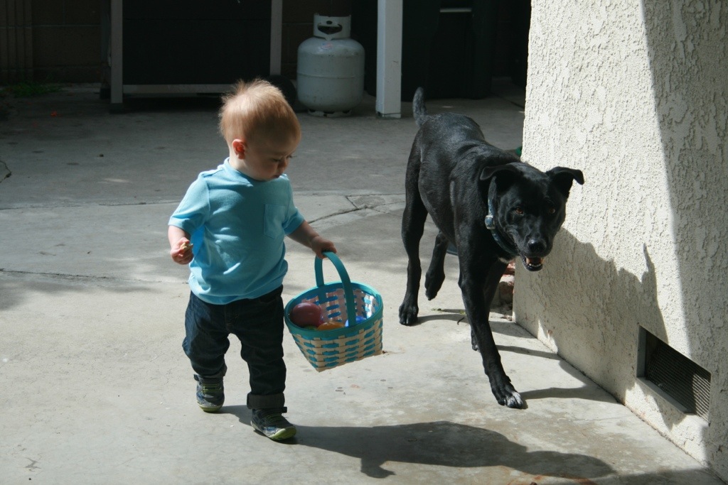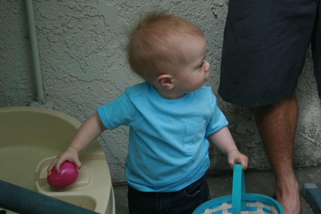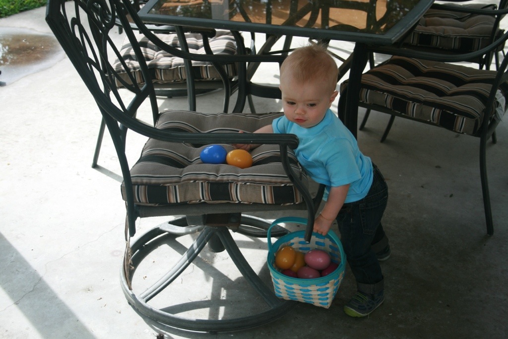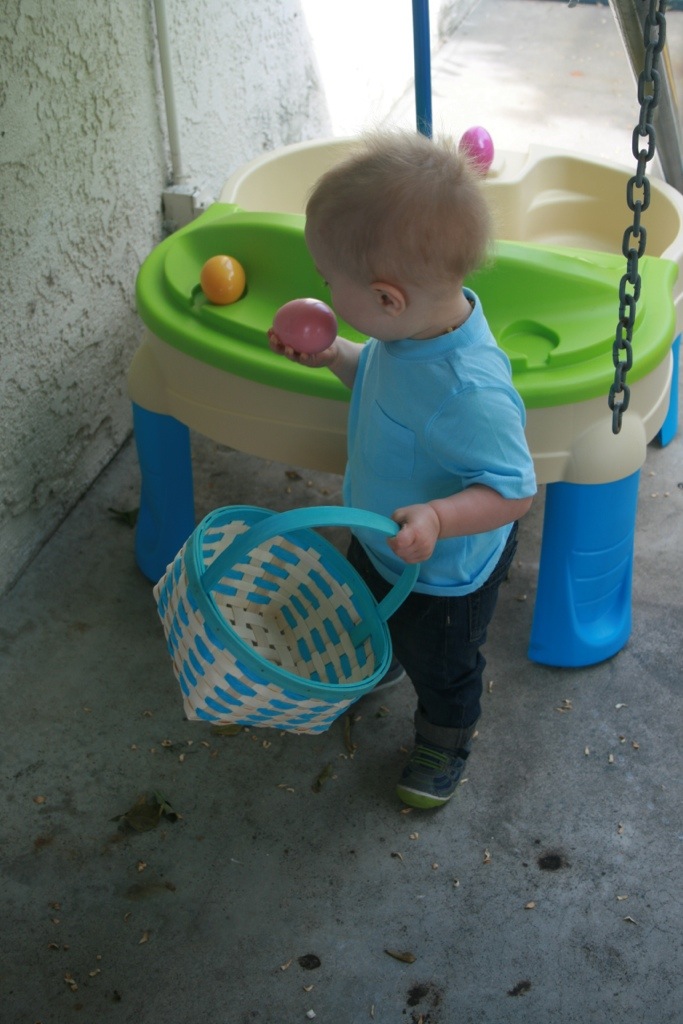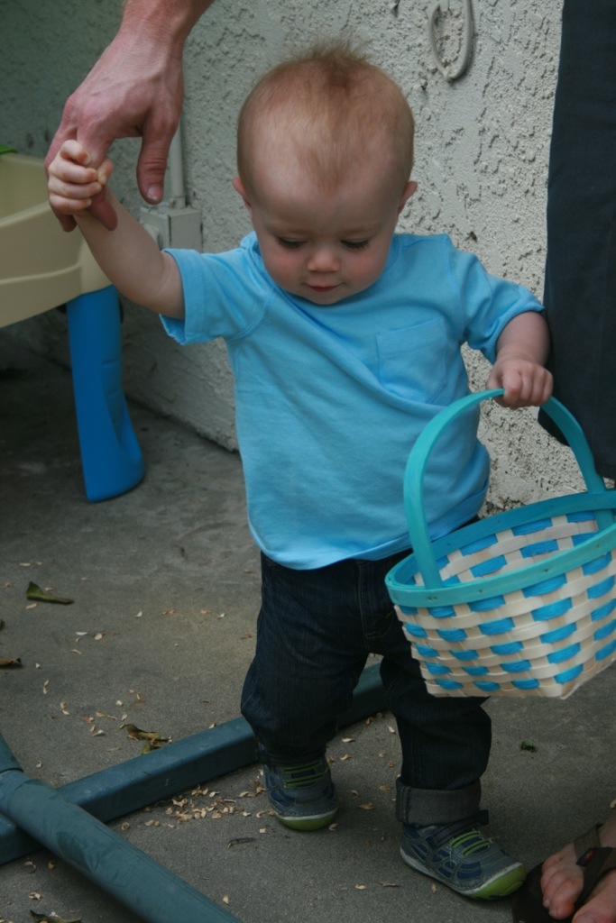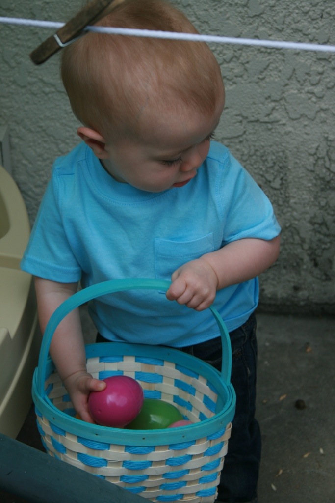 Jacob loved searching for eggs and actually put them in his basket! Some he re-hid. The easter bunny filled them with animal crackers since babies do not need candy, and daddy showed him that throwing them at the ground opened the eggs so that he could eat the crackers (maybe not the best lesson, daddy). Hehe.
