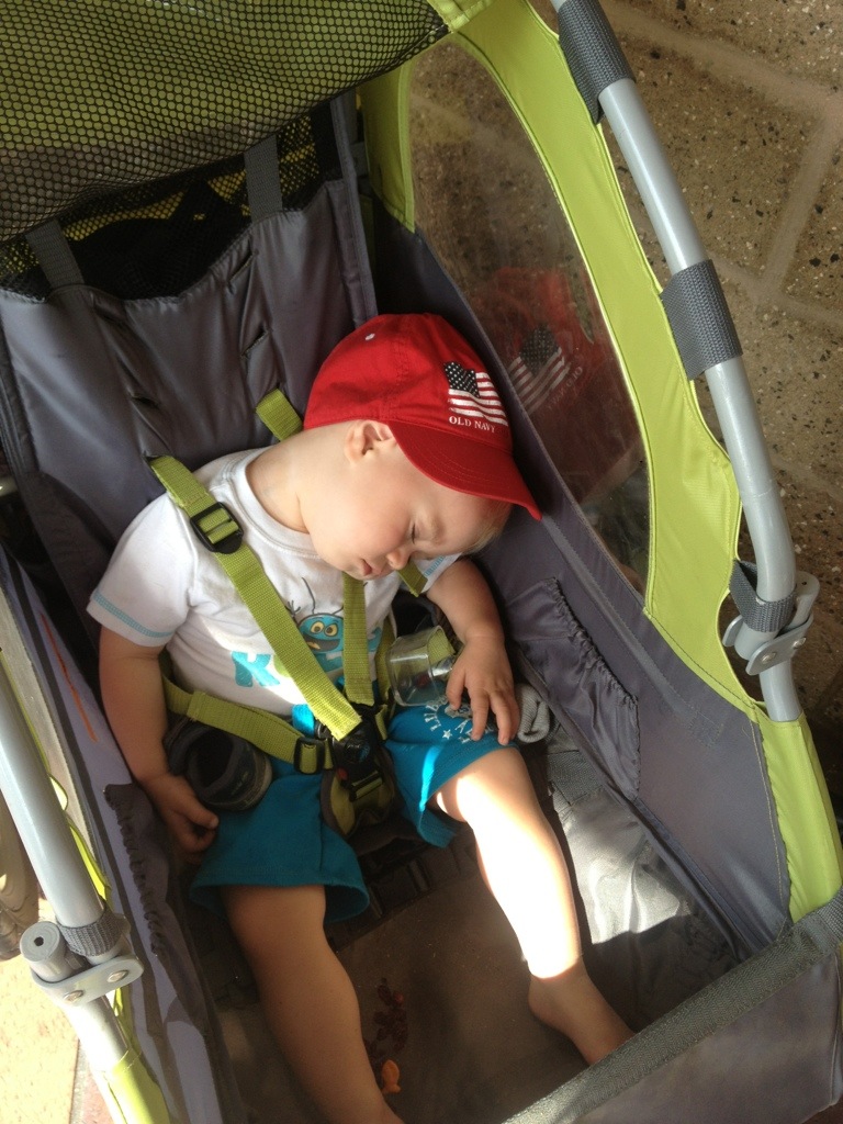 A trip to Sprouts…Jacob falls asleep on the way in the bike trailer but perks up once he is in the cart!! Have I shared pictures of our new errand running setup?