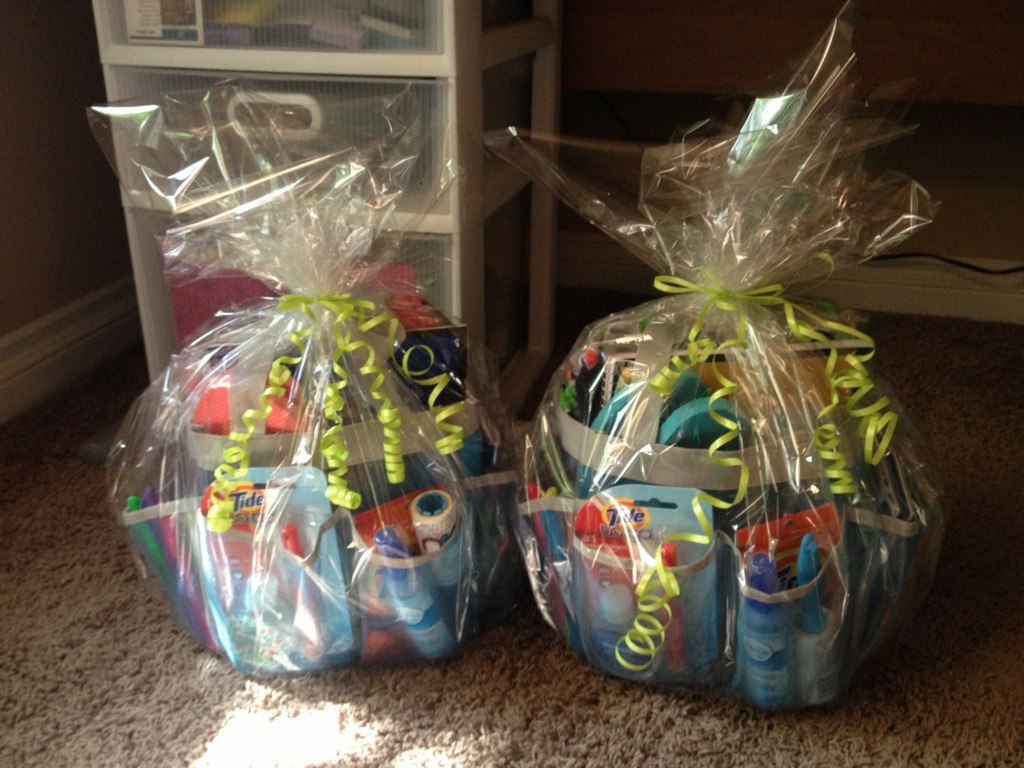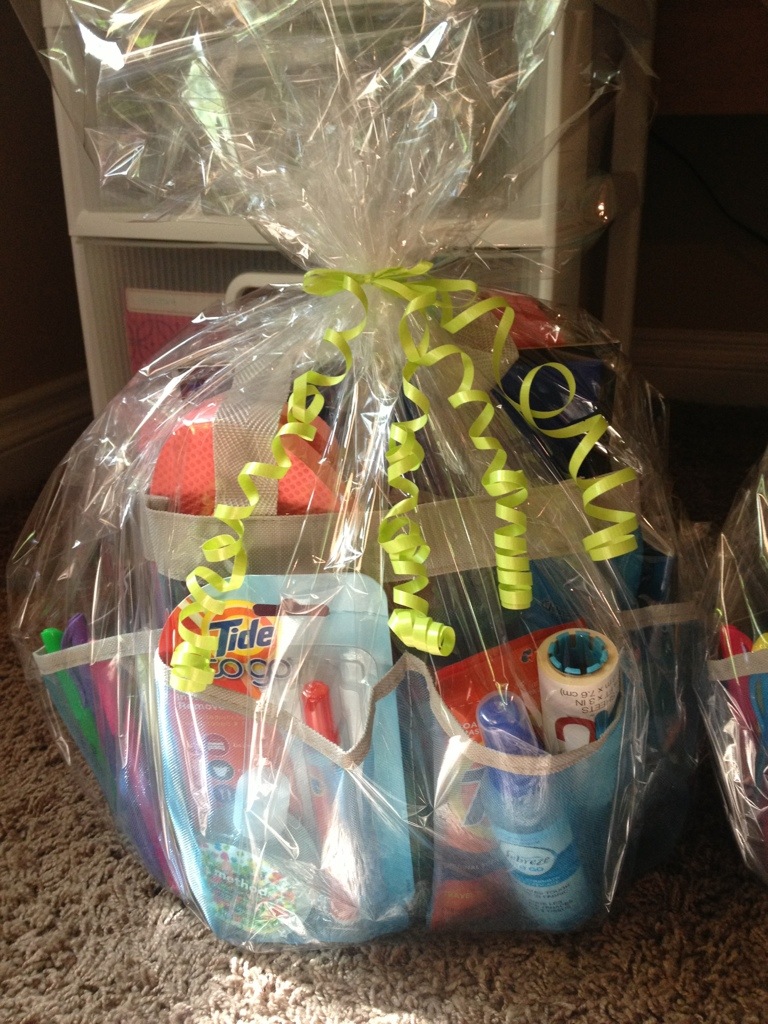 I used bath caddies as the foundation of the gift, as a basket. Specifically, a shower caddy with holes for drainage (this is vital!). You can typically find them at Target or a similar store in the summer (in college planning time). When I had filled the caddy I put the whole thing inside a cellophane bag (can be purchased at a craft store) and tied it with ribbon. I then strung this list onto the ribbon on the outside. All throughout the graduation party people were gathering around these baskets to look at them and chuckle.