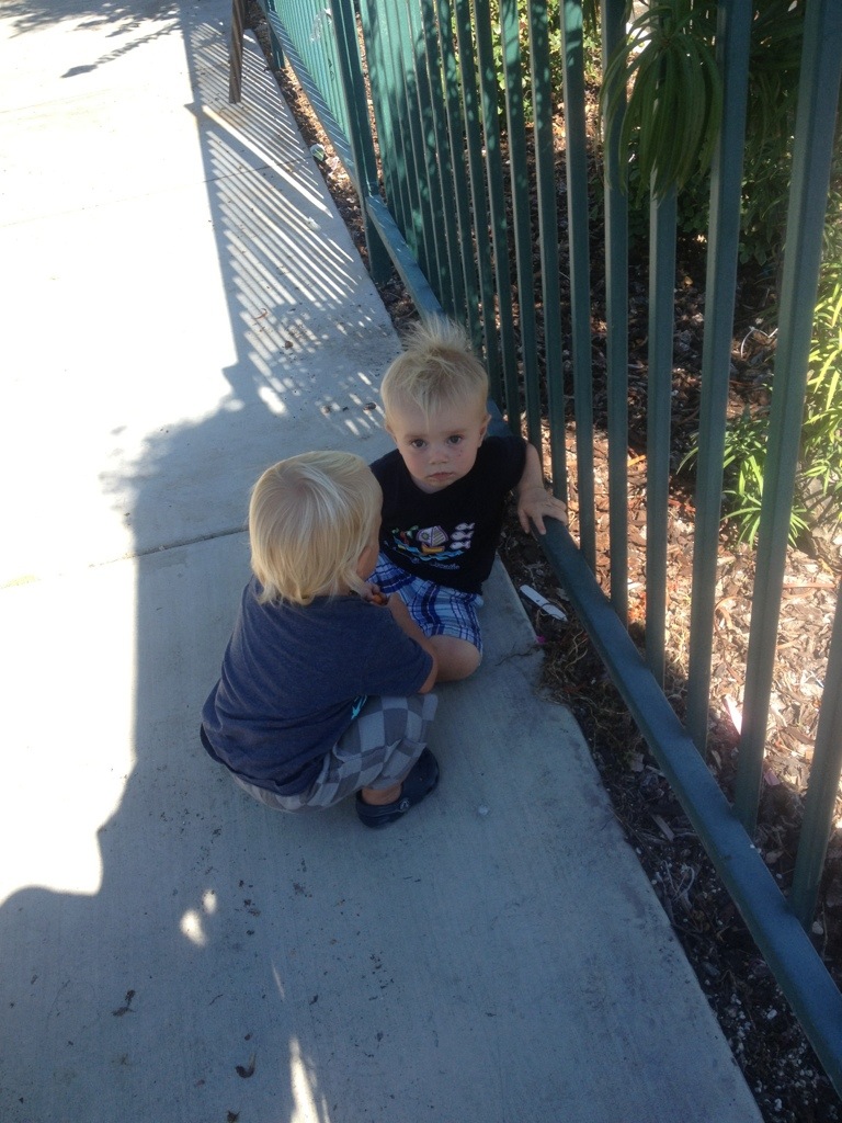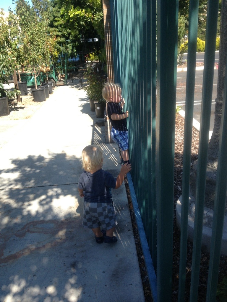 It stinks. He ends up really grumpy and unpleasant. I have been trying everything. Well I pulled out all the stops on Thursday. Since he couldn’t sleep I committed myself to what would be at least an hour bike ride, figuring he must fall asleep in the bike trailer. We rode to Armstrong nursery in Old Town Tustin. It was a good ride; there were two bike trails I could stay on to avoid traffic (actually one is an on-sidewalk bike lane) and it was a beautiful day. It took 45 minutes to get there, and he never fell asleep. We saw his friend Wesley there with his parents so we went inside and the boys ran around. Now, I thought, he is certain to fall right asleep.