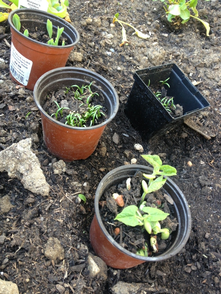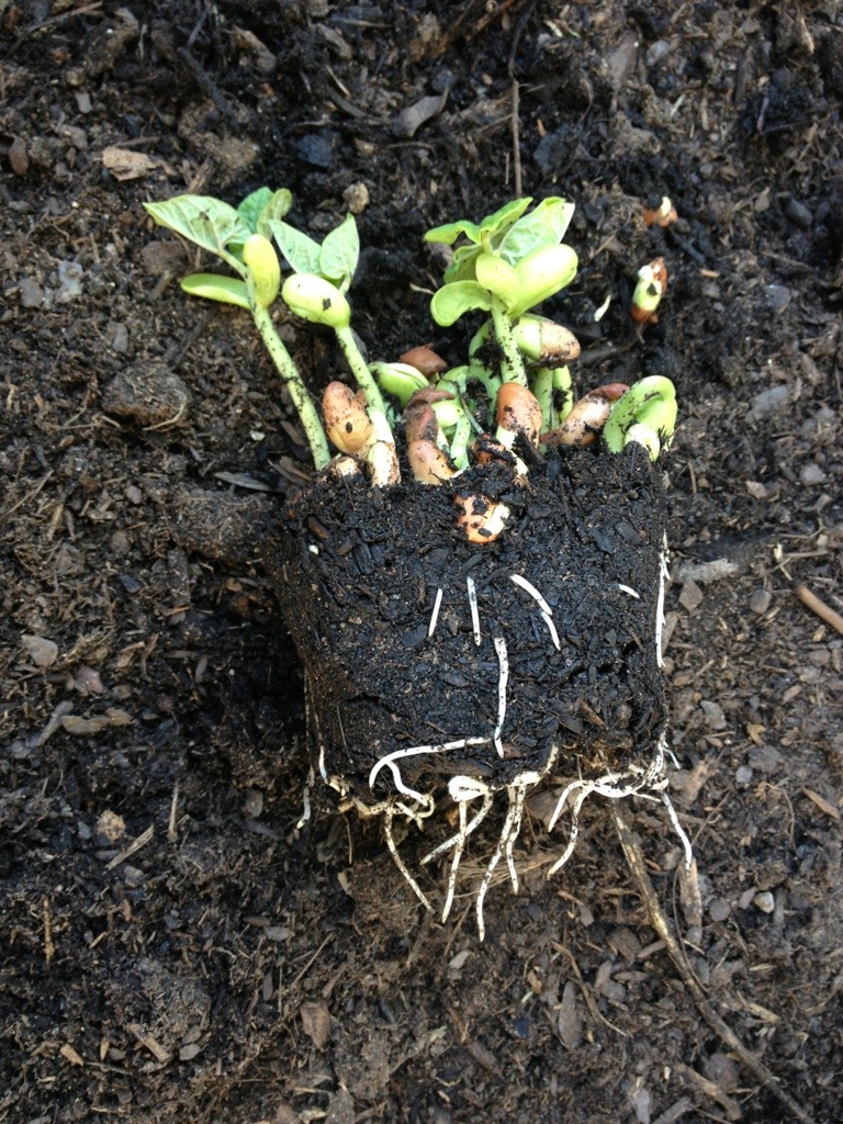 I planted seeds in some old plastic pots. They started to break the surface, so it was time to plant. I had to photograph how amazing the root system was on the green beans. Seen below, I planted chives, corn, and green bean seeds. I watered them for two weeks and voila! Roots that filled the pots and came out the drainage holes at the bottom. Isn’t that just amazing?!